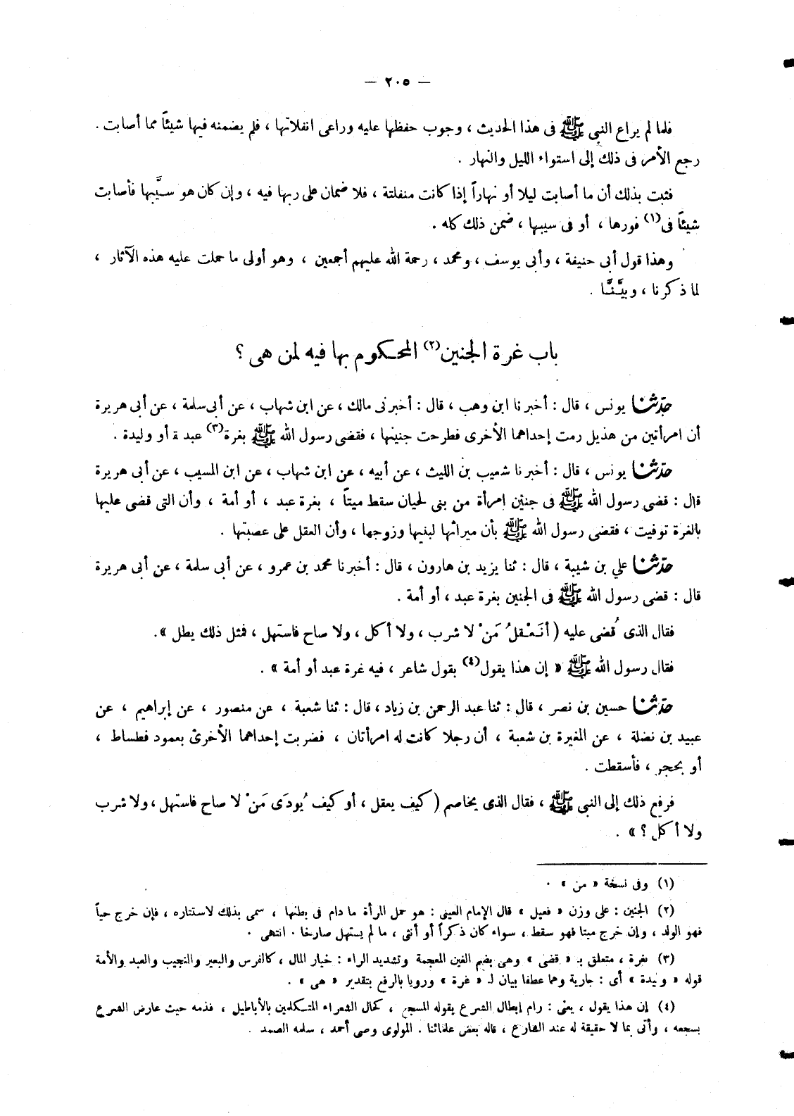 5074 - حَدَّثَنَا حُسَيْنُ بْنُ نَصْرٍ , قَالَ: ثنا عَبْدُ الرَّحْمَنِ بْنُ زِيَادٍ , قَالَ: ثنا شُعْبَةُ , عَنْ مَنْصُورٍ , عَنْ إِبْرَاهِيمَ , عَنْ عُبَيْدِ بْنِ نَضْلَةَ , عَنِ الْمُغِيرَةِ بْنِ شُعْبَةَ أَنَّ رَجُلًا §كَانَتْ لَهُ امْرَأَتَانِ فَضَرَبَتْ إِحْدَاهُمَا الْأُخْرَى بِعَمُودِ فُسْطَاطٍ أَوْ بِحَجَرٍ فَأَسْقَطَتْ. فَرُفِعَ ذَلِكَ إِلَى النَّبِيِّ صَلَّى اللَّهُ عَلَيْهِ وَسَلَّمَ فَقَالَ الَّذِي يُخَاصِمُ كَيْفَ يُعْقَلُ أَوْ كَيْفَ يُودَى مَنْ لَا صَاحَ فَاسْتَهَلَّ وَلَا شَرِبَ وَلَا أَكَلَ؟ . -[206]- فَقَالَ النَّبِيُّ صَلَّى اللَّهُ عَلَيْهِ وَسَلَّمَ أَسَجْعٌ كَسَجْعِ الْأَعْرَابِ فَجَعَلَ رَسُولُ اللهِ صَلَّى اللَّهُ عَلَيْهِ وَسَلَّمَ فِيهِ غُرَّةً فَجَعَلَهُ عَلَى قَوْمِهَا " قَالَ أَبُو جَعْفَرٍ: فَذَهَبَ قَوْمٌ إِلَى أَنَّ الْغُرَّةَ الْوَاجِبَةَ فِي الْجَنِينِ إِنَّمَا تَجِبُ لِأُمِّ الْجَنِينِ لِأَنَّ الْجَنِينَ لَمْ يَعْلَمْ أَنَّهُ كَانَ حَيًّا فِي وَقْتِ وُقُوعِ الضَّرْبَةِ بِأُمِّهِ. وَخَالَفَهُمْ فِي ذَلِكَ آخَرُونَ فَقَالُوا: بَلْ تِلْكَ الْغُرَّةُ الْمَحْكُومُ بِهَا الْجَنِينُ ثُمَّ يَرِثُهَا مَنْ كَانَ يَرِثُهُ لَوْ كَانَ حَيًّا. وَكَانَ مِنَ الْحُجَّةِ لَهُمْ فِي ذَلِكَ مَا قَدْ ذَكَرْنَاهُ فِي هَذِهِ الْآثَارِ «أَنَّ رَسُولَ اللهِ صَلَّى اللَّهُ عَلَيْهِ وَسَلَّمَ لَمَّا قَضَى عَلَى الْمَحْكُومِ عَلَيْهِ بِالْغُرَّةِ قَالَ كَيْفَ يَعْقِلُ مَنْ لَا أَكَلَ وَلَا شَرِبَ وَلَا نَطَقَ؟ فَقَالَ رَسُولُ اللهِ صَلَّى اللَّهُ عَلَيْهِ وَسَلَّمَ فِيهِ غُرَّةٌ عَبْدٌ أَوْ أَمَةٌ» وَلَمْ يَقُلْ لِلَّذِي سَجَعَ ذَلِكَ السَّجْعَ «إِنَّمَا حَكَمْتُ بِهَذَا لِلْجِنَايَةِ عَلَى الْمَرْأَةِ لَا فِي الْجَنِينِ» . وَقَدْ دَلَّ عَلَى ذَلِكَ أَيْضًا مَا رَوَيْنَاهُ فِيمَا تَقَدَّمَ فِي هَذَا الْكِتَابِ أَنَّ الْمَضْرُوبَةَ مَاتَتْ بَعْدَ ذَلِكَ مِنَ الضَّرْبَةِ فَقَضَى رَسُولُ اللهِ صَلَّى اللَّهُ عَلَيْهِ وَسَلَّمَ فِيهَا بِالدِّيَةِ مَعَ قَضَائِهِ بِالْغُرَّةِ. فَلَوْ كَانَتِ الْغُرَّةُ لِلْمَرْأَةِ الْمَقْتُولَةِ إِذًا لَمَا قَضَى لَهَا بِالْغُرَّةِ وَلَكَانَ حُكْمُهَا حُكْمَ امْرَأَةٍ ضَرَبَتْهَا امْرَأَةٌ فَمَاتَتْ مِنْ ضَرْبِهَا فَعَلَيْهَا دِيَتُهَا وَلَا يَجِبُ عَلَيْهَا لِلضَّرْبَةِ أَرْشٌ. فَلَمَّا حَكَمَ رَسُولُ اللهِ صَلَّى اللَّهُ عَلَيْهِ وَسَلَّمَ مَعَ دِيَةِ الْمَرْأَةِ بِالْغُرَّةِ ثَبَتَ بِذَلِكَ أَنَّ الْغُرَّةَ دِيَةٌ لِلْجَنِينِ لَا لَهَا فَهِيَ مَوْرُوثَةٌ عَنِ الْجَنِينِ كَمَا يُوَرَّثُ مَالُهُ لَهُ لَوْ كَانَ حَيًّا فَمَاتَ اتِّبَاعًا لِمَا رُوِيَ عَنْ رَسُولِ اللهِ صَلَّى اللَّهُ عَلَيْهِ وَسَلَّمَ. وَهَذَا قَوْلُ أَبِي حَنِيفَةَ وَأَبِي يُوسُفَ وَمُحَمَّدٍ رَحْمَةُ اللهِ عَلَيْهِمْ أَجْمَعِينَ