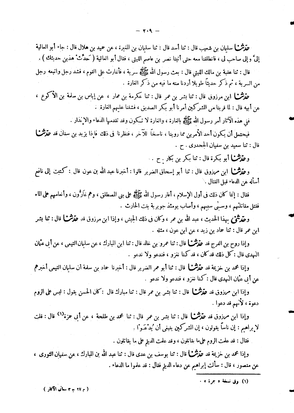 5103 - قَدْ حَدَّثَنَا قَالَ: ثنا يُوسُفُ بْنُ عَدِيٍّ قَالَ: ثنا عَبْدُ اللهِ بْنُ الْمُبَارَكِ , عَنْ سُفْيَانَ الثَّوْرِيِّ عَنْ مَنْصُورٍ , قَالَ: سَأَلْتُ إِبْرَاهِيمَ عَنْ دُعَاءِ الدَّيْلَمِ فَقَالَ: §قَدْ عَلِمُوا مَا الدُّعَاءُ -[210]- قَالَ أَبُو جَعْفَرٍ: فَبَيَّنَ مَا رَوَيْنَا مِنْ هَذَا , أَنَّ الدُّعَاءَ إِنَّمَا كَانَ فِي أَوَّلِ الْإِسْلَامِ , لِأَنَّ النَّاسَ حِينَئِذٍ , لَمْ تَكُنِ الدَّعْوَةُ بَلَغَتْهُمْ , وَلَمْ يَكُونُوا يَعْلَمُونَ عَلَى مَا يُقَاتَلُونَ عَلَيْهِ , فَأَمَرَ بِالدُّعَاءِ , لِيَكُونَ ذَلِكَ تَبْلِيغًا لَهُمْ , وَإِعْلَامًا لَهُمْ مَا يُقَاتَلُونَ عَلَيْهِ , ثُمَّ أَمَرَ بِالْغَارَةِ عَلَى آخَرِينَ , فَلَمْ يَكُنْ ذَلِكَ إِلَّا لِمَعْنًى لَمْ يَحْتَاجُوا مَعَهُ إِلَى الدُّعَاءِ , لِأَنَّهُمْ قَدْ عَلِمُوا مَا يُدْعَوْنَ إِلَيْهِ لَوْ دُعُوا وَمَا لَوْ أَجَابُوا إِلَيْهِ لَمْ يُقَاتَلُوا , فَلَا مَعْنًى لِلدُّعَاءِ. وَهَكَذَا كَانَ أَبُو حَنِيفَةَ , وَأَبُو يُوسُفَ , وَمُحَمَّدٌ , رَحْمَةُ اللهِ عَلَيْهِمْ أَجْمَعِينَ يَقُولُونَ كُلُّ قَوْمٍ قَدْ بَلَغَتْهُمُ الدَّعْوَةُ , فَأَرَادَ الْإِمَامُ قِتَالَهُمْ , فَلَهُ أَنْ يُغِيرَ عَلَيْهِمْ , وَلَيْسَ عَلَيْهِ أَنْ يَدْعُوَهُمْ , وَكُلُّ قَوْمٍ لَمْ تَبْلُغْهُمُ الدَّعْوَةُ , فَلَا يَنْبَغِي قِتَالُهُمْ , حَتَّى يَتَبَيَّنَ لَهُمُ الْمَعْنَى الَّذِي عَلَيْهِ يُقَاتَلُونَ , وَالْمَعْنَى الَّذِي إِلَيْهِ يُدْعَوْنَ. وَقَدْ تَكَلَّمَ النَّاسُ فِي الْمُرْتَدِّ عَنِ الْإِسْلَامِ , أَيُسْتَتَابُ أَمْ لَا؟ فَقَالَ قَوْمٌ: إِنِ اسْتَتَابَ الْإِمَامُ الْمُرْتَدَّ , فَهُوَ أَحْسَنُ , فَإِنْ تَابَ وَإِلَّا قُتِلَ. وَمِمَّنْ قَالَ ذَلِكَ أَبُو حَنِيفَةَ , وَأَبُو يُوسُفَ وَمُحَمَّدٌ , رَحْمَةُ اللهِ عَلَيْهِمْ. وَقَالَ الْآخَرُونَ: لَا يُسْتَتَابُ , وَجَعَلُوا حُكْمَهُ كَحُكْمِ الْحَرْبِيِّينَ - عَلَى مَا ذَكَرْنَا - مِنْ بُلُوغِ الدَّعْوَةِ إِيَّاهُمْ , وَمِنْ تَقْصِيرِهَا عَنْهُمْ. وَقَالُوا: إِنَّمَا تَجِبُ الِاسْتِتَابَةُ لِمَنْ خَرَجَ عَنِ الْإِسْلَامِ , لَا عَنْ بَصِيرَةٍ مِنْهُ بِهِ , فَأَمَّا مَنْ خَرَجَ مِنْهُ إِلَى غَيْرِهِ عَلَى بَصِيرَةٍ , فَإِنَّهُ يُقْتَلُ وَلَا يُسْتَتَابُ. وَهَذَا قَوْلٌ , قَالَ بِهِ أَبُو يُوسُفَ , فِي كِتَابِ الْإِمْلَاءِ قَالَ أَقْتُلُهُ وَلَا أَسْتَتِيبُهُ , إِلَّا أَنَّهُ إِنْ بِدَرَنِي بِالتَّوْبَةِ , خَلَّيْتُ سَبِيلَهُ , وَوَكَلْتُ أَمْرَهُ إِلَى اللهِ