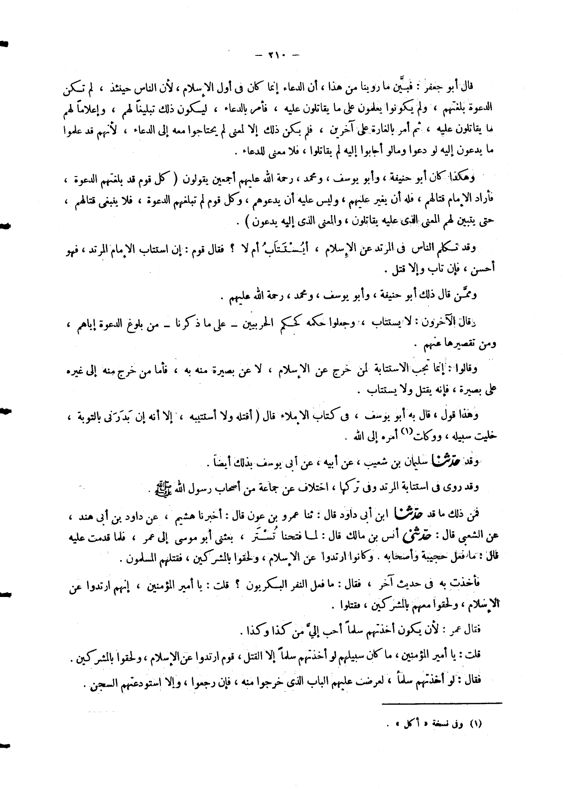 5105 - حَدَّثَنَا ابْنُ أَبِي دَاوُدَ قَالَ: ثنا عَمْرُو بْنُ عَوْنٍ قَالَ: أَخْبَرَنَا هُشَيْمٌ , عَنْ دَاوُدَ بْنِ أَبِي هِنْدَ , عَنِ الشَّعْبِيِّ قَالَ: حَدَّثَنِي أَنَسُ بْنُ مَالِكٍ قَالَ: لَمَّا فَتَحْنَا تُسْتَرَ , بَعَثَنِي أَبُو مُوسَى إِلَى عُمَرَ فَلَمَّا قَدِمْتُ عَلَيْهِ، قَالَ: مَا فَعَلَ حُجَيْبَةُ وَأَصْحَابُهُ. وَكَانُوا ارْتَدُّوا عَنِ الْإِسْلَامِ , وَلَحِقُوا بِالْمُشْرِكِينَ , فَقَتَلَهُمُ الْمُسْلِمُونَ. فَأَخَذْتُ بِهِ فِي حَدِيثٍ آخَرَ , فَقَالَ: مَا فَعَلَ النَّفَرُ الْبَكْرِيُّونَ؟ قُلْتُ: يَا أَمِيرَ الْمُؤْمِنِينَ , إِنَّهُمُ ارْتَدُّوا عَنِ الْإِسْلَامِ , وَلَحِقُوا مَعَهُمْ بِالْمُشْرِكِينَ , فَقُتِلُوا. فَقَالَ عُمَرُ: لَأَنْ يَكُونَ أَخَذْتُهُمْ سِلْمًا أَحَبُّ إِلَيَّ مِنْ كَذَا وَكَذَا. قُلْتُ يَا أَمِيرَ الْمُؤْمِنِينَ , مَا كَانَ سَبِيلُهُمْ لَوْ أَخَذْتُهُمْ سِلْمًا إِلَّا الْقَتْلَ , قَوْمٌ ارْتَدُّوا عَنِ الْإِسْلَامِ , وَلَحِقُوا بِالْمُشْرِكِينَ. فَقَالَ: §لَوْ أَخَذْتُهُمْ سِلْمًا , لَعَرَضْتُ عَلَيْهِمِ الْبَابَ الَّذِي خَرَجُوا مِنْهُ , فَإِنْ رَجَعُوا , وَإِلَّا اسْتَوْدَعْتُهُمُ السِّجْنَ