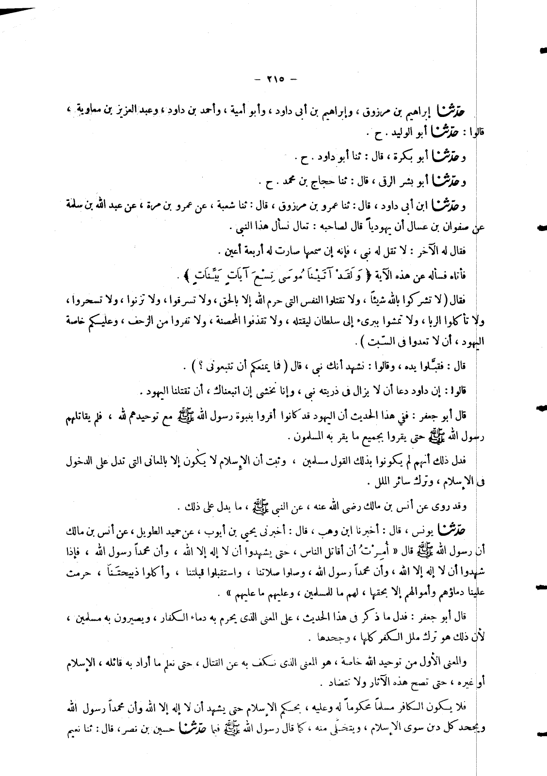 5127 - وَحَدَّثَنَا ابْنُ أَبِي دَاوُدَ , قَالَ: ثنا عَمْرُو بْنُ مَرْزُوقٍ , قَالَ: ثنا شُعْبَةُ , عَنْ عَمْرِو بْنِ مُرَّةَ , عَنْ عَبْدِ اللهِ بْنِ سَلَمَةَ عَنْ صَفْوَانَ بْنِ عَسَّالٍ أَنَّ يَهُودِيًّا قَالَ لِصَاحِبِهِ: تَعَالَ نَسْأَلْ هَذَا النَّبِيَّ , فَقَالَ لَهُ الْآخَرُ: لَا تَقُلْ لَهُ نَبِيٌّ , فَإِنَّهُ إِنْ سَمِعَهَا صَارَتْ لَهُ أَرْبَعَةُ أَعْيُنٌ , فَأَتَاهُ فَسَأَلَهُ عَنْ هَذِهِ الْآيَةِ {وَلَقَدْ آتَيْنَا مُوسَى تِسْعَ آيَاتٍ بَيِّنَاتٍ} [الإسراء: 101] فَقَالَ §لَا تُشْرِكُوا بِاللهِ شَيْئًا , وَلَا تَقْتُلُوا النَّفْسَ الَّتِي حَرَّمَ اللهُ إِلَّا بِالْحَقِّ , وَلَا تَسْرِقُوا , وَلَا تَزْنُوا , وَلَا تَسْحَرُوا , وَلَا تَأْكُلُوا الرَّبَّا , وَلَا تَمْشُوا بِبَرِيءٍ إِلَى سُلْطَانٍ لِيَقْتُلَهُ , وَلَا تَقْذِفُوا الْمُحْصَنَةَ , وَلَا تَفِرُّوا مِنَ الزَّحْفِ , وَعَلَيْكُمْ خَاصَّةَ الْيَهُودِ , أَنْ لَا تَعْدُوا فِي السَّبْتِ قَالَ: فَقَبَّلُوا يَدَهُ , وَقَالُوا: نَشْهَدُ أَنَّكَ نَبِيٌّ , قَالَ فَمَا يَمْنَعُكُمْ أَنْ تَتْبَعُونِي؟ , قَالُوا: إِنَّ دَاوُدَ دَعَا أَنْ لَا يَزَالَ فِي ذُرِّيَّتِهِ نَبِيٌّ , وَإِنَّا نَخْشَى إِنِ اتَّبَعْنَاكَ , أَنْ تَقْتُلَنَا الْيَهُودُ , " قَالَ أَبُو جَعْفَرٍ: فَفِي هَذَا الْحَدِيثِ أَنَّ الْيَهُودَ قَدْ كَانُوا أَقَرُّوا بِنُبُوَّةِ رَسُولِ اللهِ صَلَّى اللَّهُ عَلَيْهِ وَسَلَّمَ مَعَ تَوْحِيدِهِمْ لِلَّهِ , فَلَمْ يُقَاتِلْهُمْ رَسُولُ اللهِ صَلَّى اللَّهُ عَلَيْهِ وَسَلَّمَ حَتَّى يُقِرُّوا بِجَمِيعِ مَا يُقِرُّ بِهِ الْمُسْلِمُونَ , فَدَلَّ ذَلِكَ أَنَّهُمْ لَمْ يَكُونُوا بِذَلِكَ الْقَوْلِ مُسْلِمِينَ , وَثَبَتَ أَنَّ الْإِسْلَامَ لَا يَكُونُ إِلَّا بِالْمَعَانِي الَّتِي تَدُلُّ عَلَى الدُّخُولِ فِي الْإِسْلَامِ , وَتَرْكِ سَائِرِ الْمِلَلِ , وَقَدْ رُوِيَ عَنْ أَنَسِ بْنِ مَالِكٍ رَضِيَ اللهُ عَنْهُ , عَنِ النَّبِيِّ صَلَّى اللَّهُ عَلَيْهِ وَسَلَّمَ , مَا يَدُلُّ عَلَى ذَلِكَ
