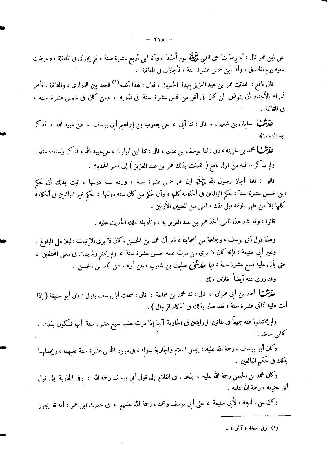 5149 - حَدَّثَنَا أَحْمَدُ بْنُ أَبِي عِمْرَانَ , قَالَ: ثنا مُحَمَّدُ بْنُ سِمَاعَةَ , قَالَ: سَمِعْتُ أَبَا يُوسُفَ يَقُولُ: قَالَ أَبُو حَنِيفَةَ «§إِذَا أَتَتْ عَلَيْهِ ثَمَانِي عَشْرَةَ سَنَةً , فَقَدْ صَارَ بِذَلِكَ فِي أَحْكَامِ الرِّجَالِ» وَلَمْ يَخْتَلِفُوا عَنْهُ جَمِيعًا فِي هَاتَيْنِ الرِّوَايَتَيْنِ فِي الْجَارِيَةِ أَنَّهَا إِذَا مَرَّتْ عَلَيْهَا سَبْعَ عَشْرَةَ سَنَةً أَنَّهَا تَكُونُ بِذَلِكَ , كَالَّتِي حَاضَتْ وَكَانَ أَبُو يُوسُفَ , رَحْمَةُ اللهِ عَلَيْهِ: يَجْعَلُ الْغُلَامَ وَالْجَارِيَةَ سَوَاءً , فِي مُرُورِ الْخَمْسَ عَشْرَةَ سَنَةً عَلَيْهِمَا , وَيَجْعَلُهُمَا بِذَلِكَ فِي حُكْمِ الْبَالِغِينَ , وَكَانَ مُحَمَّدُ بْنُ الْحَسَنِ رَحْمَةُ اللهِ عَلَيْهِ , يَذْهَبُ فِي الْغُلَامِ إِلَى قَوْلِ أَبِي يُوسُفَ رَحِمَهُ اللهُ , وَفِي الْجَارِيَةِ إِلَى قَوْلِ أَبِي حَنِيفَةَ , رَحْمَةُ اللهِ عَلَيْهِ , وَكَانَ مِنَ الْحُجَّةِ , لِأَبِي حَنِيفَةَ عَلَى أَبِي يُوسُفَ وَمُحَمَّدٍ , رَحْمَةُ اللهِ عَلَيْهِمْ , فِي حَدِيثِ ابْنِ عُمَرَ , أَنَّهُ قَدْ يَجُوزُ -[219]- أَنْ يَكُونَ النَّبِيُّ صَلَّى اللَّهُ عَلَيْهِ وَسَلَّمَ رَدَّهُ , وَهُوَ ابْنُ أَرْبَعَ عَشْرَةَ سَنَةً , لَيْسَ لِأَنَّهُ غَيْرُ بَالِغٍ , وَلَكِنْ لِمَا رَأَى مِنْ ضَعْفِهِ , وَأَجَازَهُ وَهُوَ ابْنُ خَمْسَ عَشْرَةَ سَنَةً , لَيْسَ لِأَنَّهُ بَالِغٌ , لَكِنْ لِمَا رَأَى مِنْ جَلَدِهِ وَقُوَّتِهِ , وَقَدْ يَجُوزُ أَنْ يَكُونَ رَسُولُ اللهِ صَلَّى اللَّهُ عَلَيْهِ وَسَلَّمَ مَا عَلِمَ كَمْ سِنُّهُ فِي الْحَالَيْنِ جَمِيعًا , وَقَدْ فَعَلَ رَسُولُ اللهِ صَلَّى اللَّهُ عَلَيْهِ وَسَلَّمَ فِي سَمُرَةَ بْنِ جُنْدُبٍ , مَا يَدُلُّ عَلَى هَذَا أَيْضًا