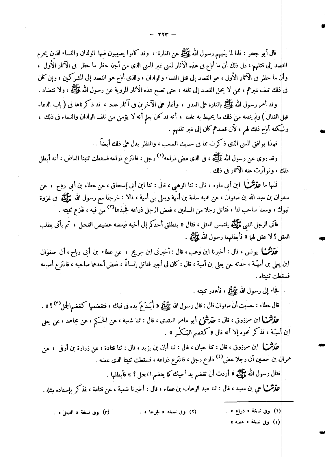 5181 - حَدَّثَنَا عَلِيُّ بْنُ مَعْبَدٍ , قَالَ: ثنا عَبْدُ الْوَهَّابِ بْنُ عَطَاءٍ , قَالَ أَخْبَرَنَا شُعْبَةُ , عَنْ قَتَادَةَ , فَذَكَرَ بِإِسْنَادِهِ مِثْلَهُ -[224]- قَالَ أَبُو جَعْفَرٍ: فَلَمَّا كَانَ الْمَعْضُوضُ نَزَعَ يَدَهُ , وَإِنْ كَانَ فِي ذَلِكَ تَلَفُ ثَنَايَا غَيْرِهِ , وَكَانَ حَرَامًا عَلَيْهِ الْقَصْدُ إِلَى نَزْعِ ثَنَايَا غَيْرِهِ بِغَيْرِ إِخْرَاجِ يَدِهِ مِنْ فِيهِ , وَلَمْ يَكُنِ الْقَصْدُ فِي ذَلِكَ إِلَى غَيْرِ التَّلَفِ , كَالْقَصْدِ إِلَى التَّلَفِ فِي الْإِثْمِ , وَلَا فِي وُجُوبِ الْعَقْلِ , كَانَ كَذَلِكَ كُلُّ مَنْ لَهُ أَخْذُ شَيْءٍ , وَفِي أَخْذِهِ إِيَّاهُ تَلَفُ غَيْرِهِ , مِمَّا يَحْرُمُ عَلَيْهِ الْقَصْدُ إِلَى تَلَفِهِ كَانَ لَهُ الْقَصْدُ إِلَى أَخْذِ مَا لَهُ أَخْذُهُ مِنْ ذَلِكَ وَإِنْ كَانَ فِيهِ تَلَفُ مَا يَحْرُمُ عَلَيْهِ الْقَصْدُ إِلَى تَلَفِهِ فَكَذَلِكَ الْعَدُوُّ , قَدْ جُعِلَ لَنَا قِتَالُهُمْ , وَحَرُمَ عَلَيْنَا قَتْلُ نِسَائِهِمْ وَوِلْدَانِهِمْ , فَحَرَامٌ عَلَيْنَا الْقَصْدُ إِلَى مَا نُهِينَا عَنْهُ مِنْ ذَلِكَ , وَحَلَالٌ لَنَا الْقَصْدُ إِلَى مَا أُبِيحَ لَنَا , وَإِنْ كَانَ فِيهِ تَلَفُ مَا قَدْ حَرُمَ عَلَيْنَا مِنْ غَيْرِهِمْ , وَلَا ضَمَانَ عَلَيْنَا فِي ذَلِكَ , وَهُوَ قَوْلُ أَبِي حَنِيفَةَ , وَأَبِي يُوسُفَ , وَمُحَمَّدٍ , رَحْمَةُ اللهِ عَلَيْهِمْ أَجْمَعِينَ