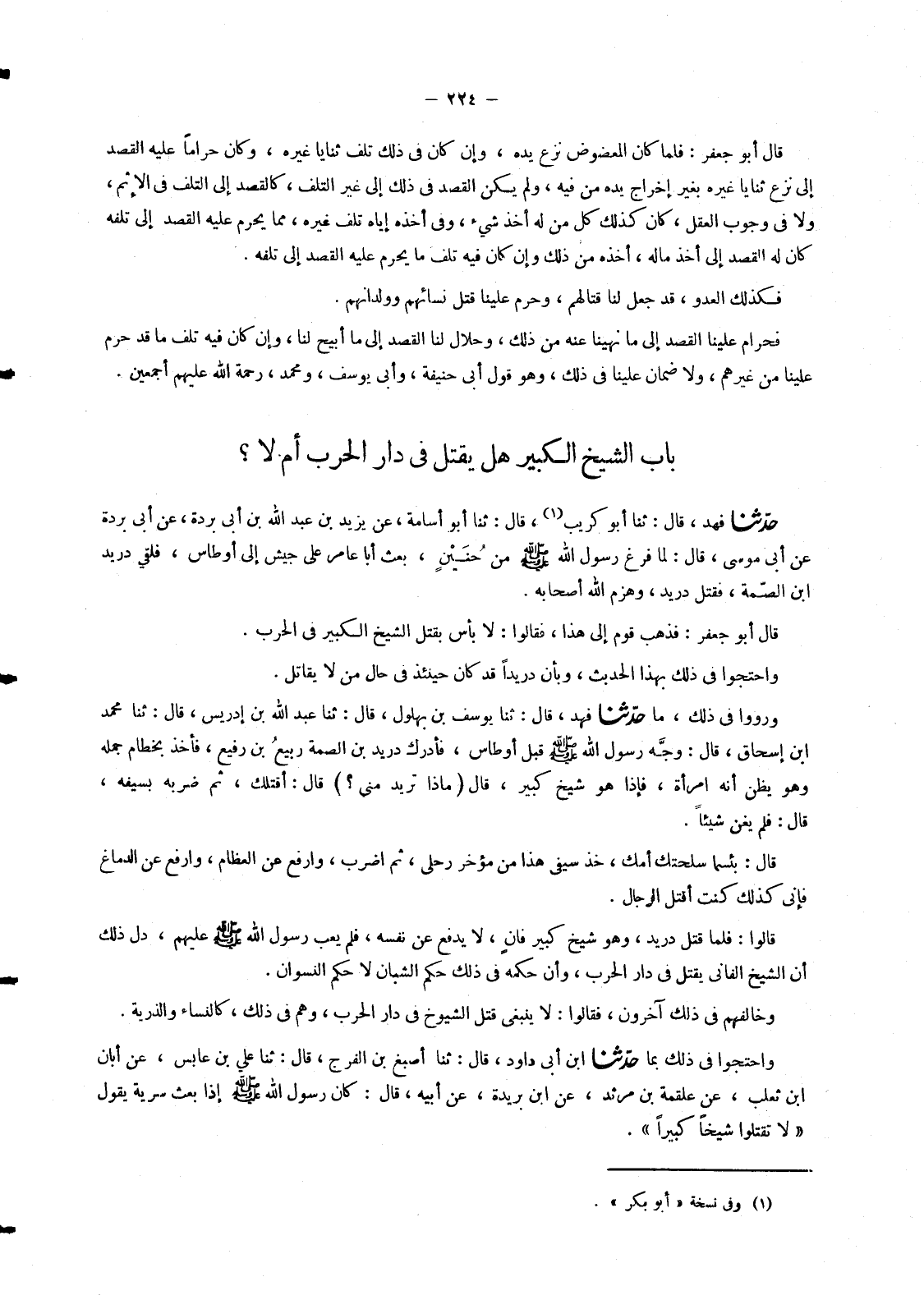 5184 - حَدَّثَنَا ابْنُ أَبِي دَاوُدَ , قَالَ: ثنا أَصْبَغُ بْنُ الْفَرَجِ قَالَ: ثنا عَلِيُّ بْنُ عَابِسٍ , عَنْ أَبَانَ بْنِ تَغْلِبَ، عَنْ عَلْقَمَةَ بْنِ مَرْثَدٍ , عَنِ ابْنِ بُرَيْدَةَ , عَنْ أَبِيهِ , قَالَ: كَانَ رَسُولُ اللهِ صَلَّى اللَّهُ عَلَيْهِ وَسَلَّمَ إِذَا بَعَثَ سَرِيَّةً يَقُولُ: «§لَا تَقْتُلُوا شَيْخًا كَبِيرًا» -[225]- فَفِي هَذَا الْحَدِيثِ الْمَنْعُ مِنْ قَتْلِ الشُّيُوخِ , وَقَدْ قَالَ رَسُولُ اللهِ صَلَّى اللَّهُ عَلَيْهِ وَسَلَّمَ أَيْضًا فِي حَدِيثِ مُرَقِّعِ بْنِ صَيْفِيِّ فِي الْمَرْأَةِ الْمَقْتُولَةِ «مَا كَانَتْ هَذِهِ تُقَاتِلُ» فَدَلَّ ذَلِكَ أَنَّ مَنْ أُبِيحَ قَتْلُهُ هُوَ الَّذِي يُقَاتِلُ , وَلَكِنْ لَمَّا رُوِيَ حَدِيثُ دُرَيْدٍ هَذَا , وَهَذِهِ الْأَحَادِيثُ الْأُخَرُ , وَجَبَ أَنْ تُصَحَّحَ , وَلَا يُدْفَعُ بَعْضُهَا بِبَعْضٍ , فَالنَّهْيُ مِنْ رَسُولِ اللهِ صَلَّى اللَّهُ عَلَيْهِ وَسَلَّمَ فِي قَتْلِ الشُّيُوخِ فِي دَارِ الْحَرْبِ , ثَابِتٌ فِي الشُّيُوخِ الَّذِينَ لَا مَعُونَةَ لَهُمْ عَلَى شَيْءٍ مِنْ أَمْرِ الْحَرْبِ , مِنْ قِتَالٍ وَلَا رَأْيٍ وَحَدِيثُ دُرَيْدٍ عَلَى الشُّيُوخِ الَّذِينَ لَهُمْ مَعُونَةٌ فِي الْحَرْبِ كَمَا كَانَ لِدُرَيْدٍ , فَلَا بَأْسَ بِقَتْلِهِمْ وَإِنْ لَمْ يَكُونُوا يُقَاتِلُونَ لِأَنَّ تِلْكَ الْمَعُونَةَ الَّتِي تَكُونُ مِنْهُمْ أَشَدُّ مِنْ كَثِيرٍ مِنَ الْقِتَالِ , وَلَعَلَّ الْقِتَالَ لَا يَلْتَئِمُ لِمَنْ يُقَاتِلُ إِلَّا بِهَا , فَإِذَا كَانَ ذَلِكَ كَذَلِكَ , قُتِلُوا وَالدَّلِيلُ عَلَى ذَلِكَ قَوْلُ رَسُولِ اللهِ صَلَّى اللَّهُ عَلَيْهِ وَسَلَّمَ , فِي حَدِيثِ رَبَاحٍ أَخِي حَنْظَلَةَ , فِي الْمَرْأَةِ الْمَقْتُولَةِ «مَا كَانَتْ هَذِهِ تُقَاتِلُ» أَيْ: فَلَا تُقْتَلُ , فَإِنَّهَا لَا تُقَاتِلُ , فَإِذَا قَاتَلَتْ قُتِلَتْ , وَارْتَفَعَتِ الْعِلَّةُ الَّتِي لَهَا مَنَعَ مِنْ قَتْلِهَا , وَفِي قَتْلِهِمْ دُرَيْدَ بْنَ الصِّمَّةِ لِلْعِلَّةِ الَّتِي ذَكَرْنَا , دَلِيلٌ عَلَى أَنَّهُ لَا بَأْسَ بِقَتْلِ الْمَرْأَةِ , إِذَا كَانَتْ أَيْضًا ذَاتَ تَدْبِيرٍ فِي الْحَرْبِ كَالشَّيْخِ الْكَبِيرِ ذِي الرَّأْيِ فِي أُمُورِ الْحَرْبِ , فَهَذَا الَّذِي ذَكَرْنَا , هُوَ الَّذِي يُوجِبُهُ تَصْحِيحُ مَعَانِي هَذِهِ الْآثَارِ , وَقَدْ نَهَى رَسُولُ اللهِ صَلَّى اللَّهُ عَلَيْهِ وَسَلَّمَ , عَنْ قَتْلِ أَصْحَابِ الصَّوَامِعِ "