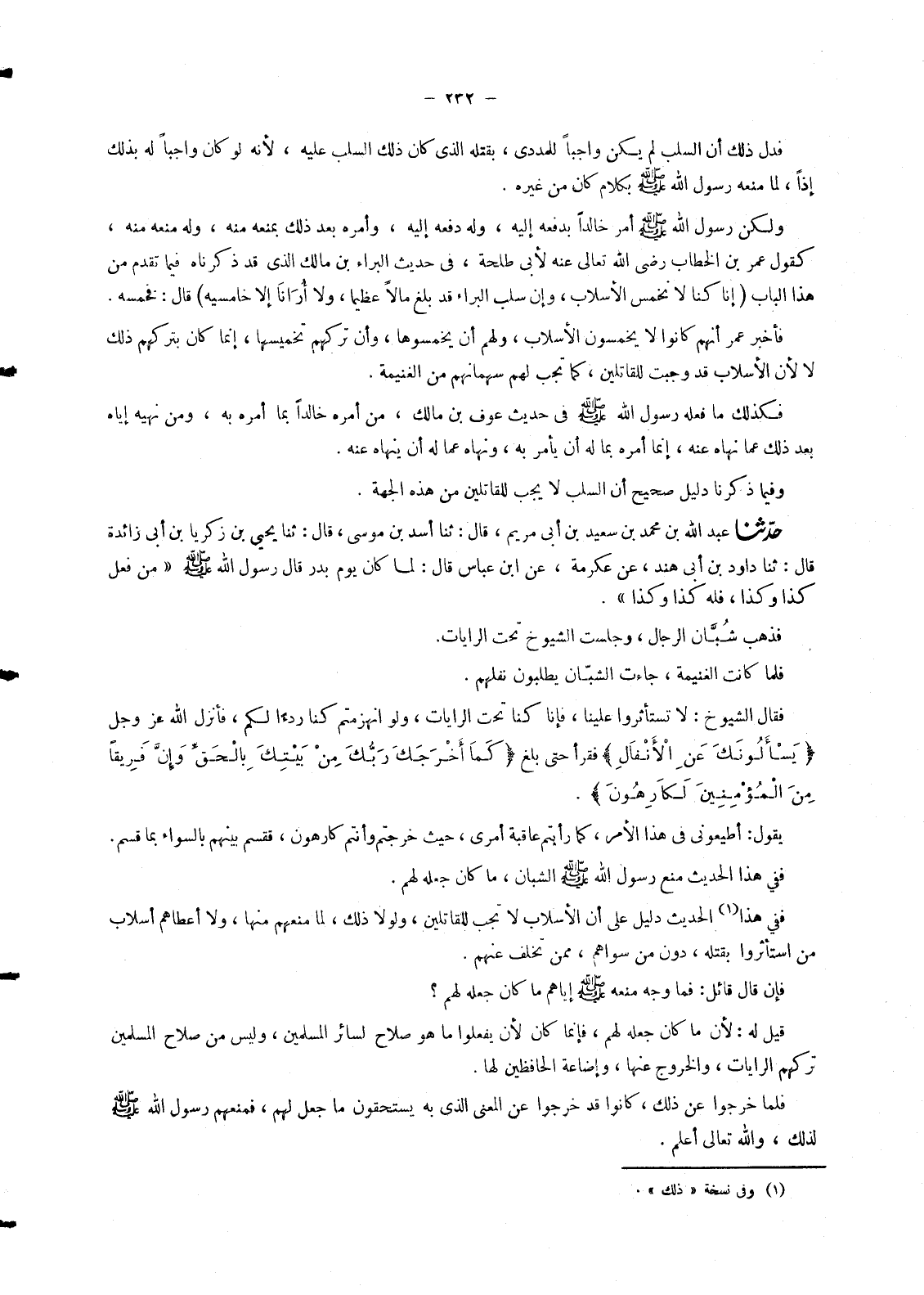 5208 - حَدَّثَنَا عَبْدُ اللهِ بْنُ مُحَمَّدِ بْنِ سَعِيدِ بْنِ أَبِي مَرْيَمَ , قَالَ: ثنا أَسَدُ بْنُ مُوسَى , قَالَ: ثنا يَحْيَى بْنُ زَكَرِيَّا بْنِ أَبِي زَائِدَةَ قَالَ: ثنا دَاوُدُ بْنُ أَبِي هِنْدٍ , عَنْ عِكْرِمَةَ , عَنِ ابْنِ عَبَّاسٍ قَالَ: " لَمَّا كَانَ يَوْمُ بَدْرٍ قَالَ رَسُولُ اللهِ صَلَّى اللَّهُ عَلَيْهِ وَسَلَّمَ مَنْ فَعَلَ كَذَا وَكَذَا , فَلَهُ كَذَا وَكَذَا , فَذَهَبَ شُبَّانُ الرِّجَالِ , وَجَلَسَتِ الشُّيُوخُ تَحْتَ الرَّايَاتِ , فَلَمَّا كَانَتِ الْغَنِيمَةُ , جَاءَتِ الشُّبَّانُ يَطْلُبُونَ نَفْلَهُمْ فَقَالَ الشُّيُوخُ: لَا تَسْتَأْثِرُوا عَلَيْنَا , فَإِنَّا كُنَّا تَحْتَ الرَّايَاتِ , وَلَوِ انْهَزَمْتُمْ كُنَّا رِدْءًا لَكُمْ , فَأَنْزَلَ اللهُ عَزَّ وَجَلَّ {يَسْأَلُونَكَ عَنِ الْأَنْفَالِ} [الأنفال: 1] فَقَرَأَ حَتَّى بَلَغَ {كَمَا أَخْرَجَكَ رَبُّكَ مِنْ بَيْتِكَ بِالْحَقِّ وَإِنَّ فَرِيقًا مِنَ الْمُؤْمِنِينَ لَكَارِهُونَ} [الأنفال: 5] يَقُولُ: " §أَطِيعُونِي فِي هَذَا الْأَمْرِ , كَمَا رَأَيْتُمْ عَاقِبَةَ أَمْرِي , حَيْثُ خَرَجْتُمْ وَأَنْتُمْ كَارِهُونَ , فَقَسَمَ بَيْنَهُمْ بِالسَّوَاءِ بِمَا قَسَمَ فَفِي هَذَا الْحَدِيثِ مَنَعَ رَسُولُ اللهِ صَلَّى اللَّهُ عَلَيْهِ وَسَلَّمَ الشُّبَّانَ , مَا كَانَ جَعَلَهُ لَهُمْ فَفِي هَذَا الْحَدِيثِ دَلِيلٌ عَلَى أَنَّ الْأَسْلَابَ لَا تَجِبُ لِلْقَاتِلِينَ , وَلَوْلَا ذَلِكَ , لَمَا مَنَعَهُمْ مِنْهَا , وَلَا أَعْطَاهُمْ أَسْلَابَ مَنِ اسْتَأْثَرُوا بِقَتْلِهِ , دُونَ مَنْ سِوَاهُمْ , مِمَّنْ تَخَلَّفَ عَنْهُمْ فَإِنْ قَالَ قَائِلٌ: فَمَا وَجْهُ مَنْعِهِ صَلَّى اللَّهُ عَلَيْهِ وَسَلَّمَ إِيَّاهُمْ مَا كَانَ جَعَلَهُ لَهُمْ؟ قِيلَ لَهُ: لِأَنَّ مَا كَانَ جَعَلَهُ لَهُمْ , فَإِنَّمَا كَانَ لَأَنْ يَفْعَلُوا مَا هُوَ صَلَاحٌ لِسَائِرِ الْمُسْلِمِينَ , وَلَيْسَ مِنْ صَلَاحِ الْمُسْلِمِينَ تَرْكُهُمُ الرَّايَاتِ , وَالْخُرُوجُ عَنْهَا , وَإِضَاعَةُ الْحَافِظِينَ لَهَا فَلَمَّا خَرَجُوا عَنْ ذَلِكَ , كَانُوا قَدْ خَرَجُوا عَنِ الْمَعْنَى الَّذِي بِهِ يَسْتَحِقُّونَ مَا جُعِلَ لَهُمْ , فَمَنَعَهُمْ رَسُولُ اللهِ صَلَّى اللَّهُ عَلَيْهِ وَسَلَّمَ لِذَلِكَ , وَاللهُ تَعَالَى أَعْلَمُ