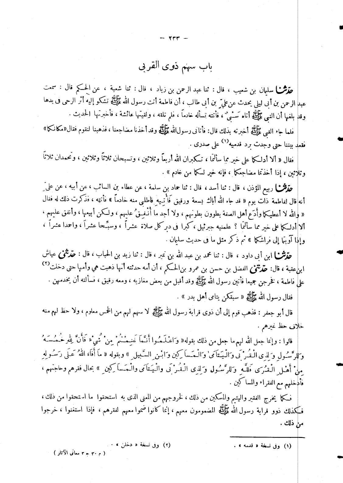 5211 - حَدَّثَنَا ابْنُ أَبِي دَاوُدَ , قَالَ: ثنا مُحَمَّدُ بْنُ عَبْدِ اللهِ بْنِ نُمَيْرٍ , قَالَ: ثنا زَيْدُ بْنُ الْحُبَابِ , قَالَ: حَدَّثَنِي عَيَّاشُ بْنُ عُقْبَةَ , قَالَ: حَدَّثَنِي الْفَضْلُ بْنُ حَسَنِ بْنِ عَمْرِو بْنِ الْحَكَمِ , أَنَّ أُمَّهُ , حَدَّثَتْهُ أَنَّهَا , ذَهَبَتْ هِيَ وَأُمُّهَا حَتَّى دَخَلَتْ عَلَى فَاطِمَةَ , فَخَرَجْنَ جَمِيعًا، فَأَتَيْنَ رَسُولَ اللهِ صَلَّى اللَّهُ عَلَيْهِ وَسَلَّمَ وَقَدْ أَقْبَلَ مِنْ بَعْضِ مَغَازِيهِ , وَمَعَهُ رَقِيقٌ , فَسَأَلَتْهُ أَنْ يَخْدُمَهُنَّ، فَقَالَ رَسُولُ اللهِ صَلَّى اللَّهُ عَلَيْهِ وَسَلَّمَ: " §سَبَقَكُنَّ يَتَامَى أَهْلِ بَدْرٍ قَالَ أَبُو جَعْفَرٍ: فَذَهَبَ قَوْمٌ إِلَى أَنَّ ذَوِي قَرَابَةِ رَسُولِ اللهِ صَلَّى اللَّهُ عَلَيْهِ وَسَلَّمَ لَا سَهْمَ لَهُمْ مِنَ الْخُمُسِ مَعْلُومٌ , وَلَا حَظَّ لَهُمْ مِنْهُ خِلَافُ حَظِّ غَيْرِهِمْ قَالُوا وَإِنَّمَا جَعَلَ اللهُ لَهُمْ مَا جَعَلَ مِنْ ذَلِكَ بِقَوْلِهِ {وَاعْلَمُوا أَنَّمَا غَنِمْتُمْ مِنْ شَيْءٍ فَأَنَّ لِلَّهِ خُمُسَهُ وَلِلرَّسُولِ وَلِذِي الْقُرْبَى وَالْيَتَامَى وَالْمَسَاكِينِ وَابْنِ السَّبِيلِ} [الأنفال: 41] وَبِقَوْلِهِ {مَا أَفَاءَ اللهُ عَلَى رَسُولِهِ مِنْ أَهْلِ الْقُرَى فَلِلَّهِ وَلِلرَّسُولِ وَلِذِي الْقُرْبَى وَالْيَتَامَى وَالْمَسَاكِينِ} [الحشر: 7] بِحَالِ فَقْرِهِمْ وَحَاجَتِهِمْ , فَأَدْخَلَهُمْ مَعَ الْفُقَرَاءِ وَالْمَسَاكِينِ فَكَمَا يَخْرُجُ الْفَقِيرُ وَالْيَتِيمُ وَالْمِسْكِينُ مِنْ ذَلِكَ , لِخُرُوجِهِمْ مِنَ الْمَعْنَى الَّذِي بِهِ اسْتَحَقُّوا مَا اسْتَحَقُّوا مِنْ ذَلِكَ , فَكَذَلِكَ ذَوُو قَرَابَةِ رَسُولِ اللهِ صَلَّى اللَّهُ عَلَيْهِ وَسَلَّمَ الْمَضْمُومُونَ مَعَهُمْ , إِنَّمَا كَانُوا ضُمُّوا مَعَهُمْ لِفَقْرِهِمْ , فَإِذَا اسْتَغْنَوْا , خَرَجُوا مِنْ ذَلِكَ -[234]- وَقَالُوا: لَوْ كَانَ لِقَرَابَةِ رَسُولِ اللهِ صَلَّى اللَّهُ عَلَيْهِ وَسَلَّمَ فِي ذَلِكَ حَظٌّ , لَكَانَتْ فَاطِمَةُ بِنْتُ رَسُولِ اللهِ صَلَّى اللَّهُ عَلَيْهِ وَسَلَّمَ مِنْهُمْ , إِذْ كَانَتْ أَقْرَبَهُمْ إِلَيْهِ نَسَبًا , وَأَمَسَّهُمْ بِهِ رَحِمًا , فَلَمْ يَجْعَلْ لَهَا حَظًّا فِي السَّبْيِ الَّذِي ذَكَرْنَا , وَلَمْ يُخْدِمْهَا مِنْهُ خَادِمًا وَلَكِنَّهُ وَكَلَهَا إِلَى ذِكْرِ اللهِ عَزَّ وَجَلَّ , لِأَنَّ مَا تَأْخُذُ مِنْ ذَلِكَ , إِنَّمَا حُكْمُهَا فِيهِ حُكْمُ الْمَسَاكِينِ , فِيمَا تَأْخُذُ مِنَ الصَّدَقَةِ فَرَأَى أَنَّ تَرْكَهَا ذَلِكَ وَالْإِقْبَالَ عَلَى ذِكْرِ اللهِ عَزَّ وَجَلَّ وَتَسْبِيحِهِ وَتَهْلِيلِهِ , خَيْرٌ لَهَا مِنْ ذَلِكَ وَأَفْضَلُ وَقَدْ قَسَمَ أَبُو بَكْرٍ وَعُمَرُ رَضِيَ اللهُ تَعَالَى عَنْهُمَا بَعْدَ وَفَاةِ رَسُولِ اللهِ صَلَّى اللَّهُ عَلَيْهِ وَسَلَّمَ جَمِيعَ الْخُمُسِ , فَلَمْ يَرَيَا لِقَرَابَةِ رَسُولِ اللهِ صَلَّى اللَّهُ عَلَيْهِ وَسَلَّمَ فِي ذَلِكَ حَقًّا , خِلَافَ حَقِّ سَائِرِ الْمُسْلِمِينَ فَثَبَتَ بِذَلِكَ أَنَّ هَذَا هُوَ الْحَكَمُ عِنْدَهُمَا , وَثَبَتَ , إِذْ لَمْ يُنْكِرْهُ عَلَيْهِمَا أَحَدٌ مِنْ أَصْحَابِ رَسُولِ اللهِ صَلَّى اللَّهُ عَلَيْهِ وَسَلَّمَ وَلَمْ يُخَالِفْهُمَا فِيهِ , أَنَّ ذَلِكَ كَانَ رَأْيَهُمْ فِيهِ أَيْضًا , وَإِذَا ثَبَتَ الْإِجْمَاعُ فِي ذَلِكَ مِنْ أَبِي بَكْرٍ وَعُمَرَ رَضِيَ اللهُ عَنْهُمَا وَمِنْ جَمِيعِ أَصْحَابِ رَسُولِ اللهِ صَلَّى اللَّهُ عَلَيْهِ وَسَلَّمَ ثَبَتَ الْقَوْلُ بِهِ وَوَجَبَ الْعَمَلُ بِهِ , وَتَرْكُ خِلَافِهِ ثُمَّ هَذَا عَلِيٌّ رَضِيَ اللهُ عَنْهُ , لَمَّا صَارَ الْأَمْرُ إِلَيْهِ , حَمَلَ النَّاسَ عَلَى ذَلِكَ أَيْضًا وَذَكَرُوا فِي ذَلِكَ مَا قَدْ