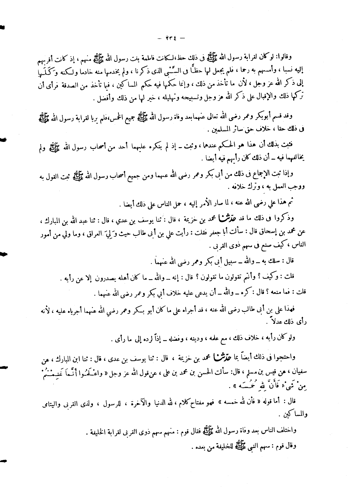 5212 - حَدَّثَنَا مُحَمَّدُ بْنُ خُزَيْمَةَ , قَالَ: ثنا يُوسُفُ بْنُ عَدِيٍّ , قَالَ: ثنا عَبْدُ اللهِ بْنُ الْمُبَارَكِ , عَنْ مُحَمَّدِ بْنِ إِسْحَاقَ قَالَ: سَأَلْتُ أَبَا جَعْفَرٍ فَقُلْتُ: رَأَيْتُ عَلِيَّ بْنَ أَبِي طَالِبٍ حَيْثُ وَلِيَ الْعِرَاقَ , وَمَا وَلِيَ مِنْ أُمُورِ النَّاسِ , كَيْفَ صَنَعَ فِي سَهْمِ ذَوِي الْقُرْبَى قَالَ: §سَلَكَ بِهِ , وَاللهِ , سَبِيلَ أَبِي بَكْرٍ وَعُمَرَ رَضِيَ اللهُ عَنْهُمَا قُلْتُ: وَكَيْفَ؟ وَأَنْتُمْ تَقُولُونَ مَا تَقُولُونَ؟ قَالَ: إِنَّهُ , وَاللهِ , مَا كَانَ أَهْلُهُ يَصْدُرُونَ إِلَّا عَنْ رَأْيِهِ قُلْتُ: فَمَا مَنَعَهُ؟ قَالَ: كَرِهَ , وَاللهِ , أَنْ يُدَّعَى عَلَيْهِ خِلَافُ أَبِي بَكْرٍ وَعُمَرَ رَضِيَ اللهُ عَنْهُمَا فَهَذَا عَلِيُّ بْنُ أَبِي طَالِبٍ رَضِيَ اللهُ عَنْهُ , قَدْ أَجْرَاهُ عَلَى مَا كَانَ أَبُو بَكْرٍ وَعُمَرُ رَضِيَ اللهُ عَنْهُمَا أَجْرَيَاهُ عَلَيْهِ , لِأَنَّهُ رَأَى ذَلِكَ عَدْلًا وَلَوْ كَانَ رَأْيُهُ , خِلَافَ ذَلِكَ , مَعَ عِلْمِهِ , وَدِينِهِ , وَفَضْلِهِ , إِذًا لَرَدَّهُ إِلَى مَا رَأَى وَاحْتَجُّوا فِي ذَلِكَ أَيْضًا بِمَا
