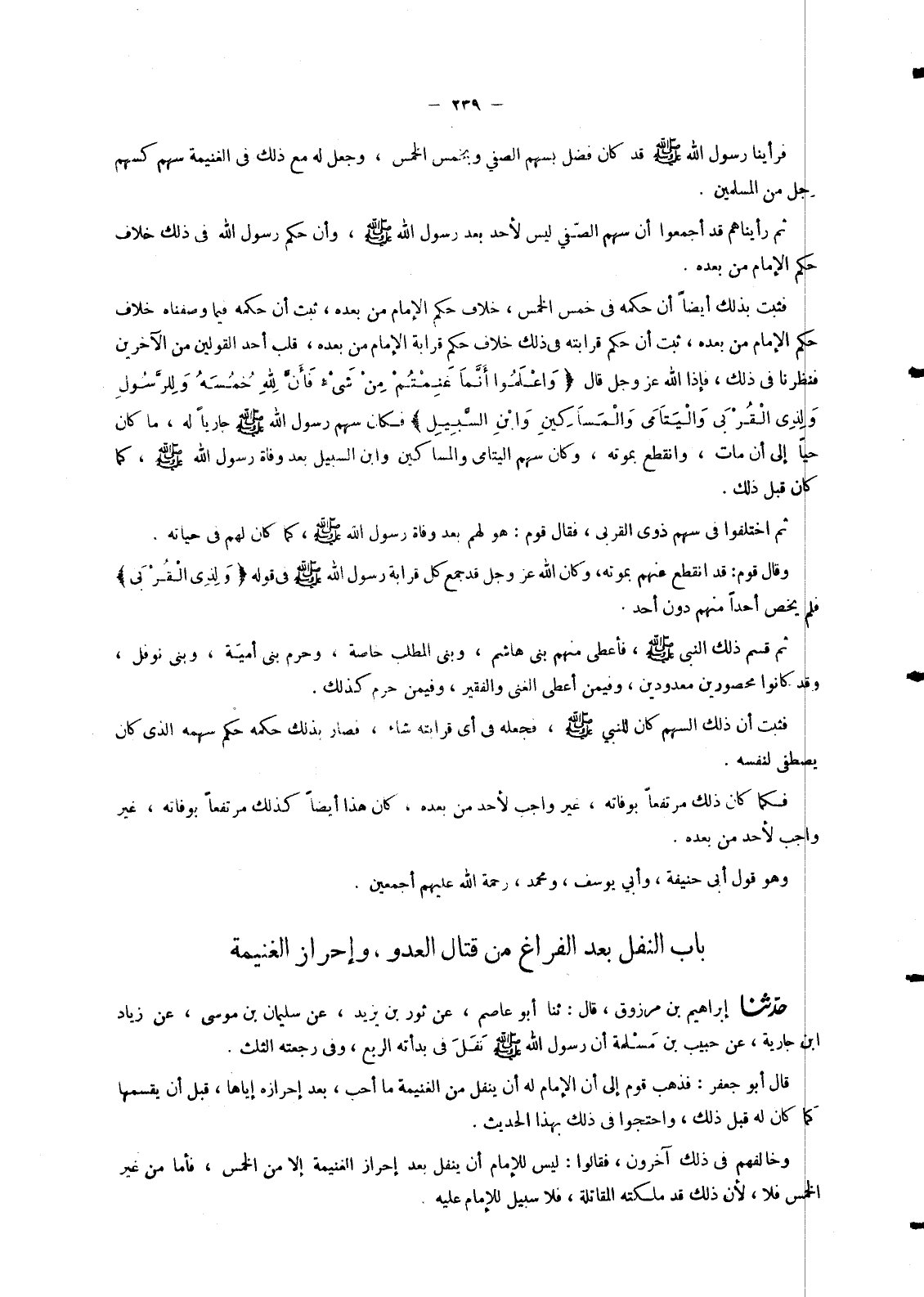 5217 - حَدَّثَنَا إِبْرَاهِيمُ بْنُ مَرْزُوقٍ قَالَ: ثنا أَبُو عَاصِمٍ , عَنْ ثَوْرِ بْنِ يَزِيدَ عَنْ سُلَيْمَانَ بْنِ مُوسَى , عَنْ زِيَادِ بْنِ جَارِيَةَ عَنْ حَبِيبِ بْنِ مَسْلَمَةَ أَنَّ رَسُولَ اللهِ صَلَّى اللَّهُ عَلَيْهِ وَسَلَّمَ " §نَفَّلَ فِي بَدْأَتِهِ الرُّبُعَ , وَفِي رَجْعَتِهِ الثُّلُثَ قَالَ أَبُو جَعْفَرٍ: فَذَهَبَ قَوْمٌ إِلَى أَنَّ الْإِمَامَ لَهُ أَنْ يُنَفِّلَ مِنَ الْغَنِيمَةِ مَا أَحَبَّ , بَعْدَ إِحْرَازِهِ إِيَّاهَا , قَبْلَ أَنْ يُقَسِّمَهَا كَمَا كَانَ لَهُ قَبْلَ ذَلِكَ , وَاحْتَجُّوا فِي ذَلِكَ بِهَذَا الْحَدِيثِ وَخَالَفَهُمْ فِي ذَلِكَ آخَرُونَ , فَقَالُوا: لَيْسَ لِلْإِمَامِ أَنْ يُنَفِّلَ بَعْدَ إِحْرَازِ الْغَنِيمَةِ إِلَّا مِنَ الْخُمُسِ , فَأَمَّا مِنْ غَيْرِ الْخُمُسِ فَلَا , لِأَنَّ ذَلِكَ قَدْ مَلَكَتْهُ الْمُقَاتِلَةُ , فَلَا سَبِيلَ لِلْإِمَامِ عَلَيْهِ -[240]- وَقَالُوا: قَدْ يُحْتَمَلُ أَنْ يَكُونَ مَا كَانَ النَّبِيُّ صَلَّى اللَّهُ عَلَيْهِ وَسَلَّمَ يُنَفِّلُهُ فِي الرَّجْعَةِ , هُوَ ثُلُثُ الْخُمُسِ بَعْدَ الرُّبُعِ الَّذِي نَفَّلَهُ , كَانَ فِي الْبَدْأَةِ , فَلَا يَخْرُجُ مِمَّا قُلْنَا فَقَالَ لَهُمُ الْآخَرُونَ: إِنَّ الْحَدِيثَ إِنَّمَا جَاءَ أَنَّ رَسُولَ اللهِ صَلَّى اللَّهُ عَلَيْهِ وَسَلَّمَ كَانَ يُنَفِّلُ فِي الْبَدْأَةِ الرُّبُعَ , وَفِي الرَّجْعَةِ الثُّلُثَ , وَكَمَا كَانَ الرُّبُعُ الَّذِي كَانَ يُنَفِّلُهُ فِي الْبَدْأَةِ , هُوَ الرُّبُعَ قَبْلَ الْخُمُسِ , فَكَذَلِكَ الثُّلُثُ الَّذِي كَانَ يُنَفِّلُهُ فِي الرَّجْعَةِ , هُوَ الثُّلُثُ أَيْضًا قَبْلَ الْخُمُسِ , وَإِلَّا لَمْ يَكُنْ لِذِكْرِ الثُّلُثِ مَعْنًى , قِيلَ لَهُمْ: بَلْ لَهُ مَعْنًى صَحِيحٌ , وَذَلِكَ أَنَّ الْمَذْكُورَ مِنْ نَفْلِهِ فِي الْبَدْأَةِ هُوَ الرُّبُعُ , مِمَّا يَجُوزُ لَهُ النَّفَلُ مِنْهُ , فَكَذَلِكَ نَفْلُهُ فِي الرَّجْعَةِ هُوَ الثُّلُثُ , مِمَّا يَجُوزُ لَهُ النَّفَلُ مِنْهُ وَهُوَ الْخُمُسُ , وَقَالَ أَهْلُ الْمَقَالَةِ الْأُولَى: فَقَدْ رُوِيَ حَدِيثُ حَبِيبٍ هَذَا , بِلَفْظٍ يَدُلُّ عَلَى مَا قُلْنَا , فَذَكَرُوا مَا