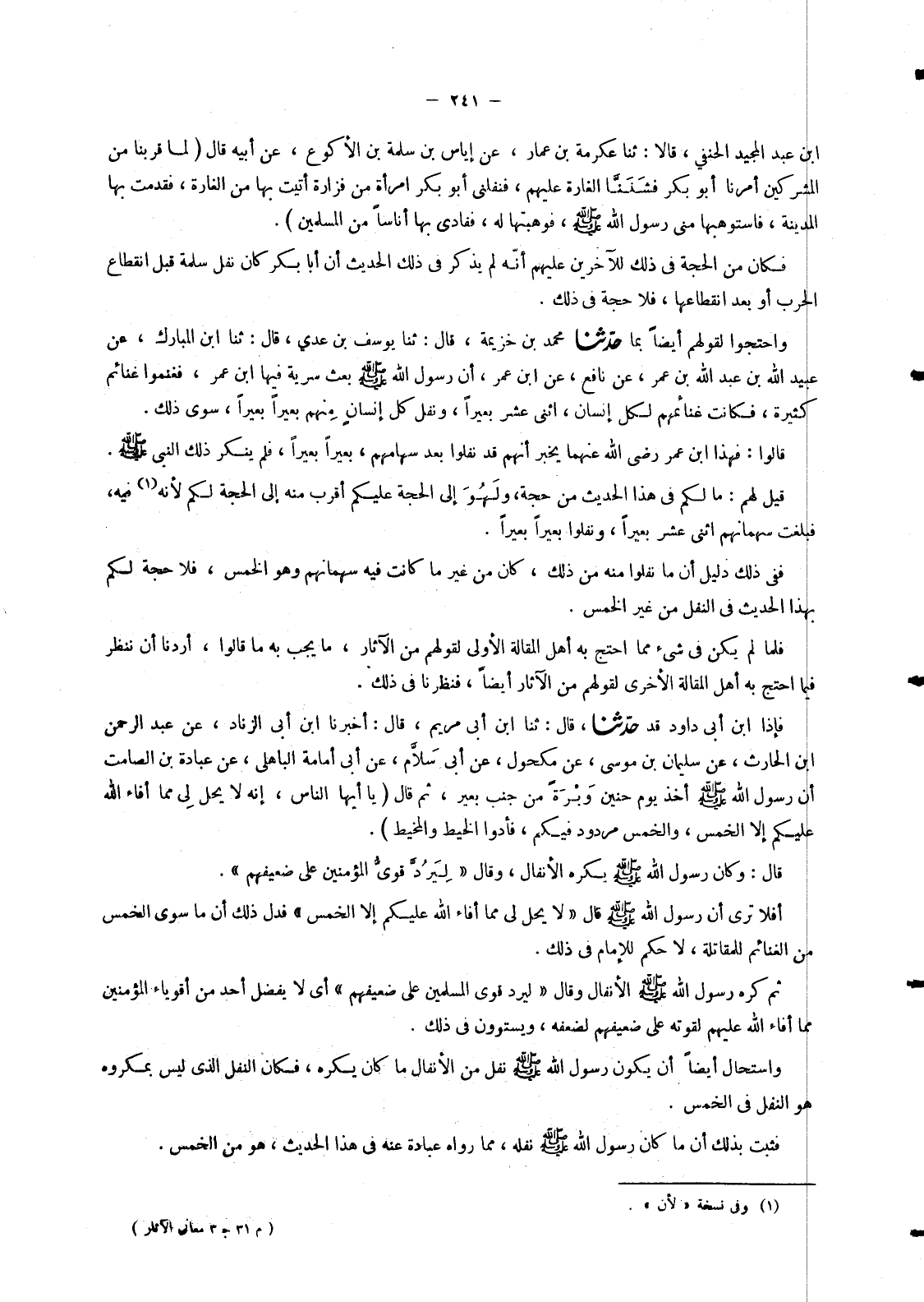 5223 - حَدَّثَنَا مُحَمَّدُ بْنُ خُزَيْمَةَ قَالَ: ثنا يُوسُفُ بْنُ عَدِيٍّ , قَالَ: ثنا ابْنُ الْمُبَارَكِ , عَنْ عُبَيْدِ اللهِ بْنِ عَبْدِ اللهِ بْنِ عُمَرَ , عَنْ نَافِعٍ عَنِ ابْنِ عُمَرَ " §أَنَّ رَسُولَ اللهِ صَلَّى اللَّهُ عَلَيْهِ وَسَلَّمَ بَعَثَ سَرِيَّةً فِيهَا ابْنُ عُمَرَ , فَغَنِمُوا غَنَائِمَ كَثِيرَةً , فَكَانَتْ غَنَائِمُهُمْ لِكُلِّ إِنْسَانٍ , اثْنَيْ عَشَرَ بَعِيرًا , وَنَفَّلَ كُلَّ إِنْسَانٍ مِنْهُمْ بَعِيرًا بَعِيرًا , سِوَى ذَلِكَ قَالُوا: فَهَذَا ابْنُ عُمَرَ رَضِيَ اللهُ عَنْهُمَا يُخْبِرُ أَنَّهُمْ قَدْ نُفِّلُوا بَعْدَ سِهَامِهِمْ , بَعِيرًا بَعِيرًا , فَلَمْ يُنْكِرْ ذَلِكَ النَّبِيُّ صَلَّى اللَّهُ عَلَيْهِ وَسَلَّمَ , قِيلَ لَهُمْ: مَا لَكُمْ فِي هَذَا الْحَدِيثِ مِنْ حُجَّةٍ , وَلَهُوَ إِلَى الْحُجَّةِ عَلَيْكُمْ أَقْرَبُ مِنْهُ إِلَى الْحُجَّةِ لَكُمْ لِأَنَّهُ فِيهِ , فَبَلَغَتْ سُهْمَانُهُمُ اثْنَيْ عَشَرَ بَعِيرًا , وَنُفِّلُوا بَعِيرًا بَعِيرًا , فَفِي ذَلِكَ دَلِيلٌ أَنَّ مَا نُفِّلُوا مِنْهُ مِنْ ذَلِكَ , كَانَ مِنْ غَيْرِ مَا كَانَتْ فِيهِ سُهْمَانُهُمْ وَهُوَ الْخُمُسُ , فَلَا حُجَّةَ لَكُمْ بِهَذَا الْحَدِيثِ فِي النَّفْلِ مِنْ غَيْرِ الْخُمُسِ فَلَمَّا لَمْ يَكُنْ فِي شَيْءٍ مِمَّا احْتَجَّ بِهِ أَهْلُ الْمَقَالَةِ الْأُولَى لِقَوْلِهِمْ مِنَ الْآثَارِ , مَا يَجِبُ بِهِ مَا قَالُوا , أَرَدْنَا أَنْ نَنْظُرَ فِيمَا احْتَجَّ بِهِ أَهْلُ الْمَقَالَةِ الْأُخْرَى لِقَوْلِهِمْ مِنَ الْآثَارِ أَيْضًا , فَنَظَرْنَا فِي ذَلِكَ