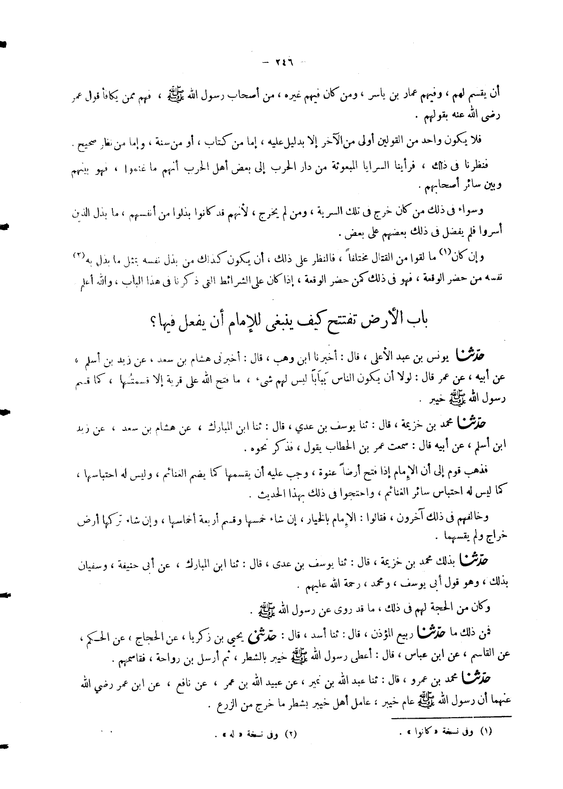 5236 - حَدَّثَنَا مُحَمَّدُ بْنُ خُزَيْمَةَ , قَالَ: ثنا يُوسُفُ بْنُ عَدِيٍّ , قَالَ: ثنا ابْنُ الْمُبَارَكِ , عَنْ هِشَامِ بْنِ سَعْدٍ , عَنْ زَيْدِ بْنِ أَسْلَمَ , عَنْ أَبِيهِ , قَالَ: سَمِعْتُ عُمَرَ بْنَ الْخَطَّابِ , يَقُولُ , فَذَكَرَ نَحْوَهُ فَذَهَبَ قَوْمٌ إِلَى أَنَّ الْإِمَامَ إِذَا فَتَحَ أَرْضًا عَنْوَةً , وَجَبَ عَلَيْهِ أَنْ يَقْسِمَهَا كَمَا يَضُمُّ الْغَنَائِمَ , وَلَيْسَ لَهُ احْتِبَاسُهَا , كَمَا لَيْسَ لَهُ احْتِبَاسُ سَائِرِ الْغَنَائِمِ , وَاحْتَجُّوا فِي ذَلِكَ بِهَذَا الْحَدِيثِ , وَخَالَفَهُمْ فِي ذَلِكَ آخَرُونَ , فَقَالُوا: الْإِمَامُ بِالْخِيَارِ , إِنْ شَاءَ خَمَّسَهَا وَقَسَمَ أَرْبَعَةَ أَخْمَاسِهَا , وَإِنْ شَاءَ تَرَكَهَا أَرْضَ خَرَاجٍ وَلَمْ يَقْسِمْهَا