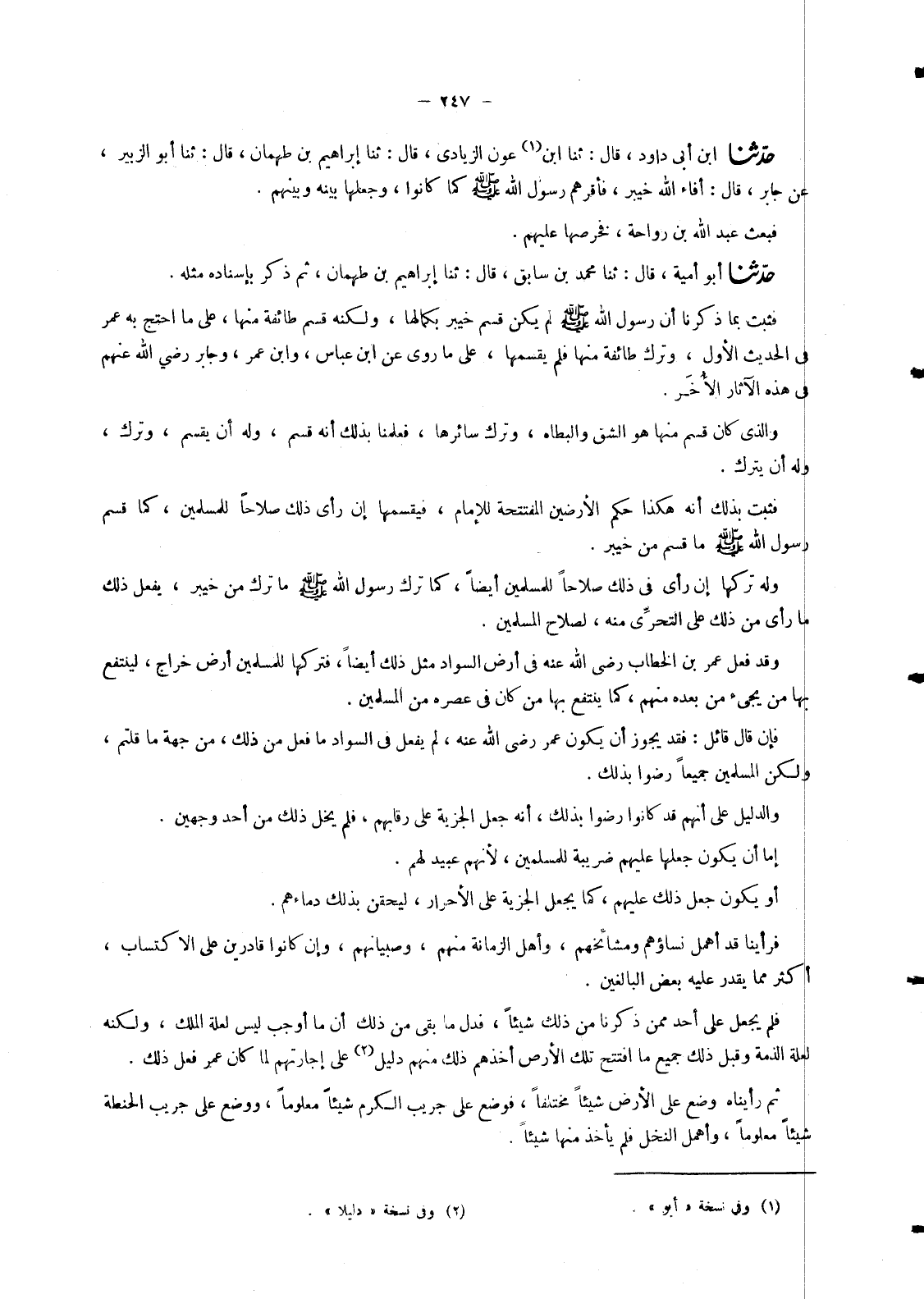 5241 - حَدَّثَنَا أَبُو أُمَيَّةَ قَالَ: ثنا مُحَمَّدُ بْنُ سَابِقٍ قَالَ: ثنا إِبْرَاهِيمُ بْنُ طَهْمَانَ , ثُمَّ ذَكَرَ بِإِسْنَادِهِ مِثْلَهُ فَثَبَتَ بِمَا ذَكَرْنَا أَنَّ رَسُولَ اللهِ صَلَّى اللَّهُ عَلَيْهِ وَسَلَّمَ لَمْ يَكُنْ قَسَمَ خَيْبَرَ بِكَمَالِهَا , وَلَكِنَّهُ قَسَمَ طَائِفَةً مِنْهَا , عَلَى مَا احْتَجَّ بِهِ عُمَرُ فِي الْحَدِيثِ الْأَوَّلِ , وَتَرَكَ طَائِفَةً مِنْهَا فَلَمْ يَقْسِمْهَا , عَلَى مَا رُوِيَ عَنِ ابْنِ عَبَّاسٍ , وَابْنِ عُمَرَ , وَجَابِرٍ رَضِيَ اللهُ عَنْهُمْ فِي هَذِهِ الْآثَارِ الْأُخَرِ , وَالَّذِي كَانَ قُسِمَ مِنْهَا هُوَ الشِّقُّ وَالْبِطَاهُ , وَتُرِكَ سَائِرُهَا , فَعَلِمْنَا بِذَلِكَ أَنَّهُ قَسَمَ , وَلَهُ أَنْ يَقْسِمَ , وَتَرَكَ , وَلَهُ أَنْ يَتْرُكَ , فَثَبَتَ بِذَلِكَ أَنَّهُ هَكَذَا حُكْمُ الْأَرْضِينَ الْمُفْتَتَحَةِ لِلْإِمَامِ , فَيَقْسِمُهَا إِنْ رَأَى ذَلِكَ صَلَاحًا لِلْمُسْلِمِينَ , كَمَا قَسَمَ رَسُولُ اللهِ صَلَّى اللَّهُ عَلَيْهِ وَسَلَّمَ مَا قَسَمَ مِنْ خَيْبَرَ , وَلَهُ تَرْكُهَا إِنْ رَأَى فِي ذَلِكَ صَلَاحًا لِلْمُسْلِمِينَ أَيْضًا , كَمَا تَرَكَ رَسُولُ اللهِ صَلَّى اللَّهُ عَلَيْهِ وَسَلَّمَ مَا تَرَكَ مِنْ خَيْبَرَ , يَفْعَلُ ذَلِكَ مَا رَأَى مِنْ ذَلِكَ عَلَى التَّحَرِّي مِنْهُ لِصَلَاحِ الْمُسْلِمِينَ , وَقَدْ فَعَلَ عُمَرُ بْنُ الْخَطَّابِ رَضِيَ اللهُ عَنْهُ فِي أَرْضِ السَّوَادِ مِثْلَ ذَلِكَ أَيْضًا , فَتَرَكَهَا لِلْمُسْلِمِينَ أَرْضَ خَرَاجٍ , لِيَنْتَفِعَ بِهَا مَنْ يَجِيءُ مِنْ بَعْدِهِ مِنْهُمْ , كَمَا يَنْتَفِعُ بِهَا مَنْ كَانَ فِي عَصْرِهِ مِنَ الْمُسْلِمِينَ , فَإِنْ قَالَ قَائِلٌ: فَقَدْ يَجُوزُ أَنْ يَكُونَ عُمَرُ رَضِيَ اللهُ عَنْهُ , لَمْ يَفْعَلْ فِي السَّوَادِ مَا فَعَلَ مِنْ ذَلِكَ , مِنْ جِهَةِ مَا قُلْتُمْ , وَلَكِنَّ الْمُسْلِمِينَ , جَمِيعًا رَضُوا بِذَلِكَ , وَالدَّلِيلُ عَلَى أَنَّهُمْ قَدْ كَانُوا رَضُوا بِذَلِكَ , أَنَّهُ جَعَلَ الْجِزْيَةَ عَلَى رِقَابِهِمْ , فَلَمْ يَخْلُ ذَلِكَ مِنْ أَحَدِ وَجْهَيْنِ , إِمَّا أَنْ يَكُونَ جَعَلَهَا عَلَيْهِمْ ضَرِيبَةً لِلْمُسْلِمِينَ , لِأَنَّهُمْ عَبِيدٌ لَهُمْ , أَوْ يَكُونُ جَعَلَ ذَلِكَ عَلَيْهِمْ , كَمَا يَجْعَلُ الْجِزْيَةَ عَلَى الْأَحْرَارِ , لِيَحْقِنَ بِذَلِكَ دِمَاءَهُمْ , فَرَأَيْنَا قَدْ أُهْمِلَ نِسَاؤُهُمْ وَمَشَائِخُهُمْ , وَأَهْلُ الزَّمَانَةِ مِنْهُمْ , وَصِبْيَانُهُمْ , وَإِنْ كَانُوا قَادِرِينَ عَلَى الِاكْتِسَابِ , أَكْثَرَ مِمَّا يَقْدِرُ عَلَيْهِ بَعْضُ الْبَالِغِينَ , فَلَمْ يَجْعَلْ عَلَى أَحَدٍ مِمَّنْ ذَكَرْنَا مِنْ ذَلِكَ شَيْئًا , فَدَلَّ مَا بَقِيَ مِنْ ذَلِكَ أَنَّ مَا أَوْجَبَ لَيْسَ لِعِلَّةِ الْمِلْكِ , وَلَكِنَّهُ , لِعِلَّةِ الذِّمَّةِ وَقَبْلَ ذَلِكَ جَمِيعُ مَا افْتُتِحَ مِنْ تِلْكَ الْأَرْضِ أَخْذُهُمْ ذَلِكَ مِنْهُمْ دَلِيلٌ عَلَى إِجَارَتِهِمْ لَمَّا كَانَ عُمَرُ فَعَلَ ذَلِكَ , ثُمَّ رَأَيْنَاهُ وَضَعَ عَلَى الْأَرْضِ شَيْئًا مُخْتَلِفًا , فَوَضَعَ عَلَى جَرِيبِ الْكَرْمِ شَيْئًا مَعْلُومًا , وَوَضَعَ عَلَى جَرِيبِ الْحِنْطَةِ شَيْئًا مَعْلُومًا , وَأَهْمَلَ النَّخْلَ فَلَمْ يَأْخُذْ مِنْهَا شَيْئًا , -[248]- فَلَمْ يَخْلُ ذَلِكَ مِنْ أَحَدِ وَجْهَيْنِ , إِمَّا أَنْ يَكُونَ مَلَكَ بِهِ الْقَوْمُ الَّذِينَ قَدْ ثَبَتَ حُرْمَتُهُمْ بِثِمَارِ أَرَضِيهِمْ , وَالْأَرْضُ مِلْكٌ لِلْمُسْلِمِينَ , أَوْ يَكُونَ جَعَلَ ذَلِكَ عَلَيْهِمْ , كَمَا جَعَلَ الْخَرَاجَ عَلَى رِقَابِهِمْ , وَلَا يَجُوزُ أَنْ يَكُونَ الْخَرَاجُ يَجِبُ إِلَّا فِيمَا مَلَكَهُ لِغَيْرِ أَخْذِ الْخَرَاجِ , فَإِنْ حَمَلْنَا ذَلِكَ عَلَى التَّمْلِيكِ , مِنْ عُمَ