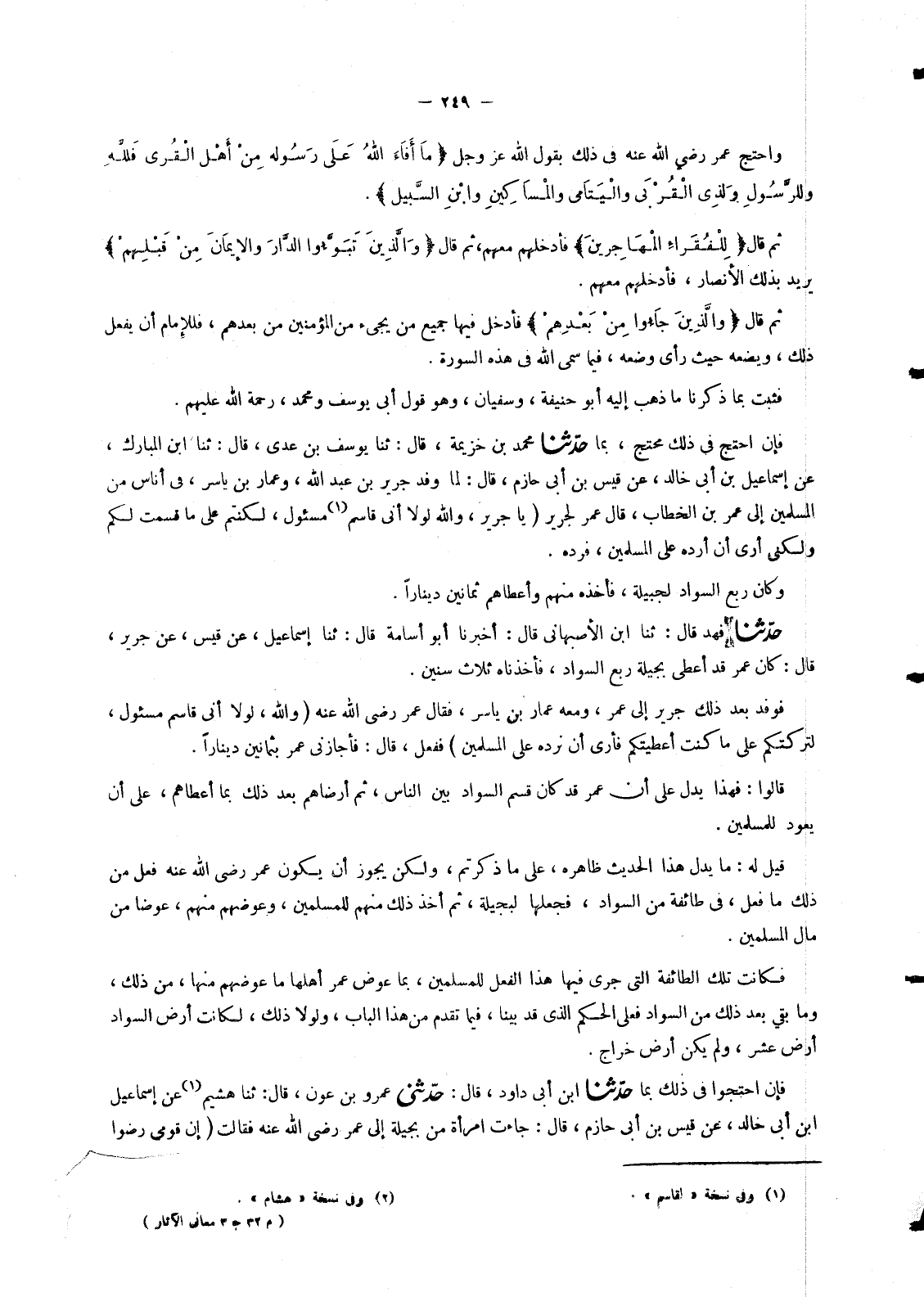 5244 - حَدَّثَنَا ابْنُ أَبِي دَاوُدَ , قَالَ: حَدَّثَنِي عَمْرُو بْنُ عَوْنٍ , قَالَ: ثنا هُشَيْمٌ عَنْ إِسْمَاعِيلَ بْنِ أَبِي خَالِدٍ , عَنْ قَيْسِ بْنِ أَبِي حَازِمٍ , قَالَ: §جَاءَتِ امْرَأَةٌ مِنْ بَجِيلَةَ إِلَى عُمَرَ رَضِيَ اللهُ عَنْهُ فَقَالَتْ: إِنَّ قَوْمِي رَضُوا -[250]- مِنْكَ مِنَ السَّوَادِ , بِمَا لَمْ أَرْضَ , وَلَسْتُ أَرْضَى , حَتَّى تَمْلَأَ كَفِّي ذَهَبًا , أَوْ جَمَلِي طَعَامًا , أَوْ كَلَامًا هَذَا مَعْنَاهُ , فَفَعَلَ ذَلِكَ بِهَا عُمَرُ رَضِيَ اللهُ عَنْهُ قِيلَ لَهُمْ: ذَلِكَ أَيْضًا , عِنْدَنَا وَاللهُ أَعْلَمُ , بِالْجُزْءِ الَّذِي كَانَ سَلَّمَهُ عُمَرُ لَبَجِيلَةَ , فَمَلَكُوهُ , ثُمَّ أَرَادَ انْتِزَاعَهُ مِنْهُمْ , بِطِيبِ أَنْفُسِهِمْ فَلَمْ يَخْرُجْ حَقُّ تِلْكَ الْمَرْأَةِ مِنْهَا إِلَّا بِمَا طَابَتْ بِهِ نَفْسُهَا , فَأَعْطَاهَا عُمَرُ مَا طَلَبَتْ , حَتَّى رَضِيَتْ , فَسَلَّمَتْ مَا كَانَ لَهَا مِنْ ذَلِكَ , كَمَا سَلَّمَ سَائِرُ قَوْمِهَا حُقُوقَهُمْ , فَهَذَا , عِنْدَنَا , وَجْهُ هَذَا الْبَابِ كُلِّهِ مِنْ طَرِيقِ الْآثَارِ , وَمِنْ طَرِيقِ النَّظَرِ , عَلَى مَا بَيَّنَّا , وَهُوَ قَوْلُ أَبِي حَنِيفَةَ وَسُفْيَانَ , وَأَبِي يُوسُفَ , وَمُحَمَّدٍ , رَحْمَةُ اللهِ عَلَيْهِمْ أَجْمَعِينَ , وَقَدْ رُوِيَ عَنْ عُمَرَ بْنِ الْخَطَّابِ رَضِيَ اللهُ عَنْهُ فِي أَرْضِ مِصْرَ أَيْضًا , مَا