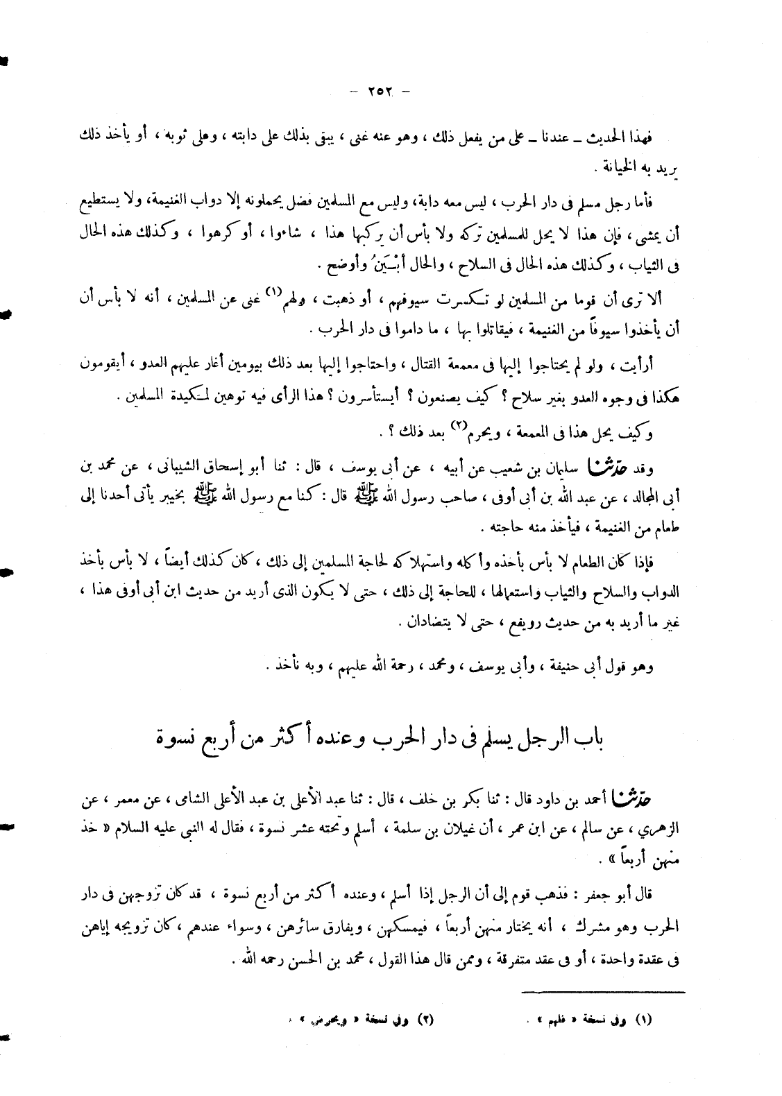5250 - حَدَّثَنَا سُلَيْمَانُ بْنُ شُعَيْبٍ عَنْ أَبِيهِ , عَنْ أَبِي يُوسُفَ , قَالَ: ثنا أَبُو إِسْحَاقَ الشَّيْبَانِيُّ , عَنْ مُحَمَّدِ بْنِ أَبِي الْمَجَالِدِ , عَنْ عَبْدِ اللهِ بْنِ أَبِي أَوْفَى , صَاحِبِ رَسُولِ اللهِ صَلَّى اللَّهُ عَلَيْهِ وَسَلَّمَ قَالَ: «كُنَّا مَعَ رَسُولِ اللهِ صَلَّى اللَّهُ عَلَيْهِ وَسَلَّمَ بِخَيْبَرَ §يَأْتِي أَحَدُنَا إِلَى طَعَامٍ مِنَ الْغَنِيمَةِ , فَيَأْخُذُ مِنْهُ حَاجَتَهُ» فَإِذَا كَانَ الطَّعَامُ لَا بَأْسَ بِأَخْذِهِ وَأَكْلِهِ وَاسْتِهْلَاكِهِ لِحَاجَةِ الْمُسْلِمِينَ إِلَى ذَلِكَ , كَانَ كَذَلِكَ أَيْضًا , لَا بَأْسَ بِأَخْذِ الدَّوَابِّ وَالسِّلَاحِ وَالثِّيَابِ وَاسْتِعْمَالِهَا , لِلْحَاجَةِ إِلَى ذَلِكَ , حَتَّى لَا يَكُونَ الَّذِي أُرِيدَ مِنْ حَدِيثِ ابْنِ أَبِي أَوْفَى هَذَا , غَيْرُ مَا أُرِيدُ بِهِ مِنْ حَدِيثِ رُوَيْفِعٍ , حَتَّى لَا يَتَضَادَّانِ , وَهُوَ قَوْلُ أَبِي حَنِيفَةَ , وَأَبِي يُوسُفَ , وَمُحَمَّدٍ , رَحْمَةُ اللهِ عَلَيْهِمْ , وَبِهِ نَأْخُذُ