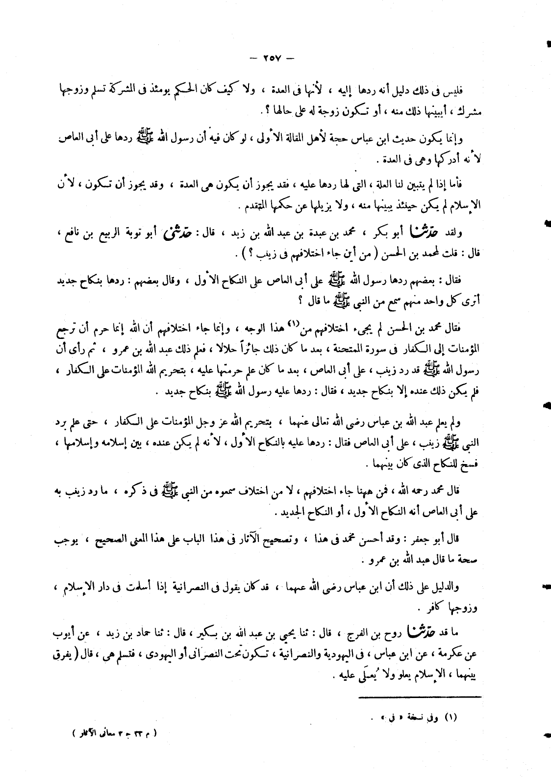 5266 - حَدَّثَنَا أَبُو بَكْرٍ مُحَمَّدُ بْنُ عَبْدَةَ بْنِ عَبْدِ اللهِ بْنِ زَيْدٍ , قَالَ: حَدَّثَنِي أَبُو تَوْبَةَ الرَّبِيعُ بْنُ نَافِعٌ , قَالَ: قُلْتُ لِمُحَمَّدِ بْنِ الْحَسَنِ مِنْ أَيْنَ جَاءَ اخْتِلَافُهُمْ فِي زَيْنَبَ؟ فَقَالَ بَعْضُهُمْ: §رَدَّهَا رَسُولُ اللهِ صَلَّى اللَّهُ عَلَيْهِ وَسَلَّمَ عَلَى أَبِي الْعَاصِ عَلَى النِّكَاحِ الْأَوَّلِ , وَقَالَ بَعْضُهُمْ: رَدَّهَا بِنِكَاحٍ جَدِيدٍ أَتَرَى كُلَّ وَاحِدٍ مِنْهُمْ سَمِعَ مِنَ النَّبِيِّ صَلَّى اللَّهُ عَلَيْهِ وَسَلَّمَ مَا قَالَ؟ فَقَالَ مُحَمَّدُ بْنُ الْحَسَنِ لَمْ يَجِئِ اخْتِلَافُهُمْ مِنْ هَذَا الْوَجْهِ , وَإِنَّمَا جَاءَ اخْتِلَافُهُمْ أَنَّ اللهَ إِنَّمَا حَرَّمَ أَنْ تَرْجِعَ الْمُؤْمِنَاتُ إِلَى الْكُفَّارِ فِي سُورَةِ الْمُمْتَحَنَةِ , بَعْدَمَا كَانَ ذَلِكَ جَائِزًا حَلَالًا , فَعَلِمَ ذَلِكَ عَبْدُ اللهِ بْنُ عَمْرٍو , ثُمَّ رَأَى أَنَّ رَسُولَ اللهِ صَلَّى اللَّهُ عَلَيْهِ وَسَلَّمَ قَدْ رَدَّ زَيْنَبَ , عَلَى أَبِي الْعَاصِ , بَعْدَمَا كَانَ عَلِمَ حُرْمَتَهَا عَلَيْهِ , بِتَحْرِيمِ اللهِ الْمُؤْمِنَاتِ عَلَى الْكُفَّارِ , فَلَمْ يَكُنْ ذَلِكَ عِنْدَهُ إِلَّا بِنِكَاحٍ جَدِيدٍ , فَقَالَ: رَدَّهَا عَلَيْهِ رَسُولُ اللهِ صَلَّى اللَّهُ عَلَيْهِ وَسَلَّمَ بِنِكَاحٍ جَدِيدٍ , وَلَمْ يَعْلَمْ عَبْدُ اللهِ بْنُ عَبَّاسٍ رَضِيَ اللهُ تَعَالَى عَنْهُمَا , بِتَحْرِيمِ اللهِ , عَزَّ وَجَلَّ , الْمُؤْمِنَاتِ عَلَى الْكُفَّارِ , حَتَّى عَلِمَ بِرَدِّ النَّبِيِّ صَلَّى اللَّهُ عَلَيْهِ وَسَلَّمَ زَيْنَبَ , عَلَى أَبِي الْعَاصِ فَقَالَ: رَدَّهَا عَلَيْهِ بِالنِّكَاحِ الْأَوَّلِ , لِأَنَّهُ لَمْ يَكُنْ عِنْدَهُ , بَيْنَ إِسْلَامِهِ وَإِسْلَامِهَا , فَسْخٌ لِلنِّكَاحِ الَّذِي كَانَ بَيْنَهُمَا , قَالَ مُحَمَّدٌ رَحِمَهُ اللهُ , فَمِنْ هَاهُنَا جَاءَ اخْتِلَافُهُمْ , لَا مِنَ اخْتِلَافٍ سَمِعُوهُ مِنَ النَّبِيِّ صَلَّى اللَّهُ عَلَيْهِ وَسَلَّمَ فِي ذِكْرِهِ , مَا رَدَّ زَيْنَبَ بِهِ عَلَى أَبِي الْعَاصِ أَنَّهُ النِّكَاحُ الْأَوَّلُ , أَوِ النِّكَاحُ الْجَدِيدُ قَالَ أَبُو جَعْفَرٍ: وَقَدْ أَحْسَنَ مُحَمَّدٌ فِي هَذَا , وَتَصْحِيحُ الْآثَارِ فِي هَذَا الْبَابِ عَلَى هَذَا الْمَعْنَى الصَّحِيحِ , يُوجِبُ صِحَّةَ مَا قَالَ عَبْدُ اللهِ بْنُ عَمْرٍو , وَالدَّلِيلُ عَلَى ذَلِكَ أَنَّ ابْنَ عَبَّاسٍ رَضِيَ اللهُ عَنْهُمَا , قَدْ كَانَ يَقُولُ فِي النَّصْرَانِيَّةِ إِذَا أَسْلَمَتْ فِي دَارِ الْإِسْلَامِ , وَزَوْجُهَا كَافِرٌ , مَا قَدْ