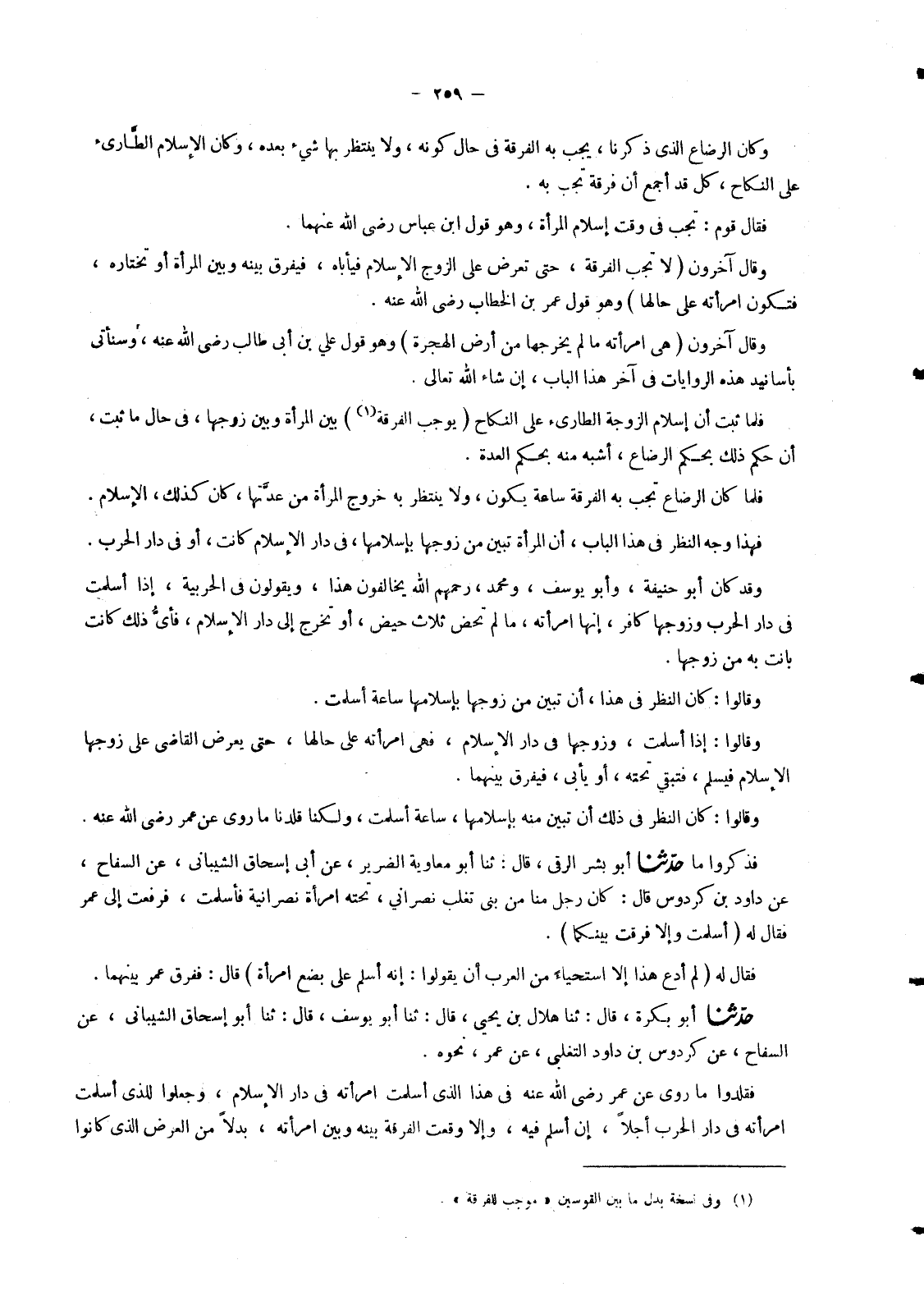 5270 - حَدَّثَنَا أَبُو بَكْرَةَ , قَالَ: ثنا هِلَالُ بْنُ يَحْيَى , قَالَ: ثنا أَبُو يُوسُفَ , قَالَ: ثنا أَبُو إِسْحَاقَ الشَّيْبَانِيُّ , عَنِ السِّفَاحِ , عَنْ كُرْدُوسَ بْنِ دَاوُدَ التَّغْلِبِيِّ , عَنْ عُمَرَ , نَحْوُهُ فَقَلَّدُوا مَا رُوِيَ عَنْ عُمَرَ رَضِيَ اللهُ عَنْهُ فِي هَذَا الَّذِي أَسْلَمَتِ امْرَأَتُهُ فِي دَارِ الْإِسْلَامِ , وَجَعَلُوا لِلَّذِي أَسْلَمَتِ امْرَأَتُهُ فِي دَارِ الْحَرْبِ أَجَلًا , إِنْ أَسْلَمَ فِيهِ , وَإِلَّا وَقَعَتِ الْفُرْقَةُ بَيْنَهُ وَبَيْنَ امْرَأَتِهِ , بَدَلًا مِنَ الْعَرْضِ الَّذِي كَانُوا -[260]- يَعْرِضُونَهُ عَلَيْهِ , لَوْ كَانَ فِي دَارِ الْإِسْلَامِ , وَهُوَ الْعِدَّةُ , إِلَّا أَنْ تَخْرُجَ الْمَرْأَةُ قَبْلَ ذَلِكَ إِلَى دَارِ الْإِسْلَامِ , فَيَنْقَطِعُ الْأَجَلُ بِذَلِكَ , وَتَجِبُ بِهِ الْبَيْنُونَةُ , وَنَحْنُ فِي هَذَا عَلَى مَا رَوَيْنَا , عَنِ ابْنِ عَبَّاسٍ رَضِيَ اللهُ عَنْهُمَا , مِنْ وُجُوبِ الْبَيْنُونَةِ بِالْإِسْلَامِ , سَاعَةَ يَكُونُ مِنَ الْمَرْأَةِ , وَأَمَّا مَا رُوِيَ عَنْ عَلِيٍّ رَضِيَ اللهُ عَنْهُ فِي ذَلِكَ , فَمَا