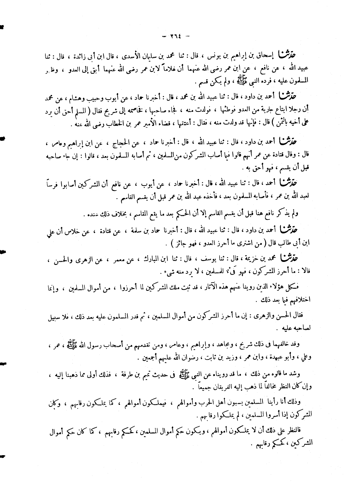 5290 - حَدَّثَنَا أَحْمَدُ بْنُ دَاوُدَ , قَالَ: ثنا عُبَيْدُ اللهِ , قَالَ أَخْبَرَنَا حَمَّادُ , عَنِ الْحَجَّاجِ , عَنِ ابْنِ إِبْرَاهِيمَ , وَعَامِرٍ , قَالَ: وَقَالَ قَتَادَةُ عَنْ عُمَرَ , أَنَّهُمْ قَالُوا فِيمَا أَصَابَ الْمُشْرِكُونَ مِنَ الْمُسْلِمِينَ , ثُمَّ أَصَابَهُ الْمُسْلِمُونَ بَعْدُ , قَالُوا: §إِنْ جَاءَ صَاحِبُهُ قَبْلَ أَنْ يُقْسَمَ , فَهُوَ أَحَقُّ بِهِ