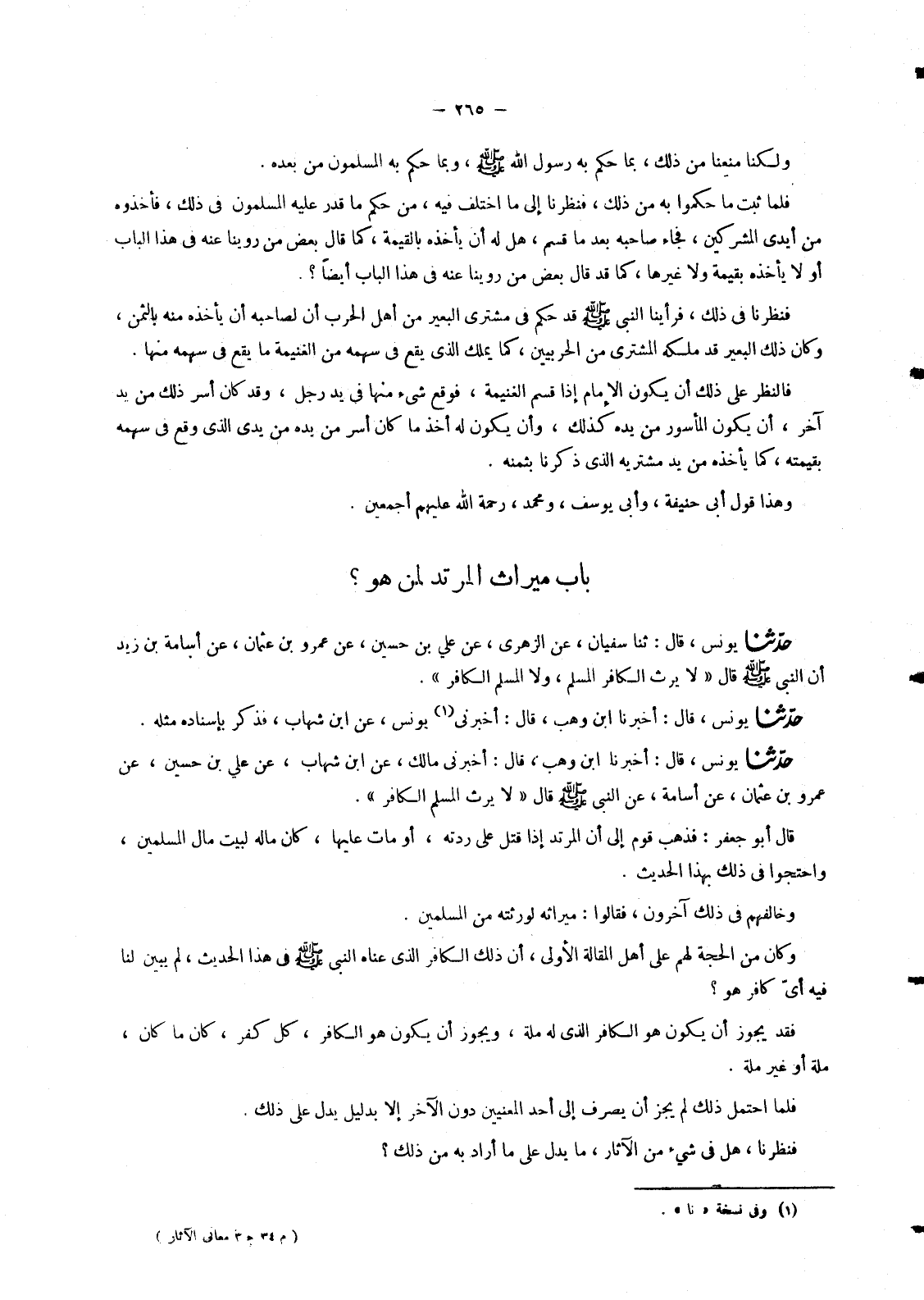 5296 - حَدَّثَنَا يُونُسُ , قَالَ أَخْبَرَنَا ابْنُ وَهْبٍ , قَالَ: أَخْبَرَنِي مَالِكٌ , عَنِ ابْنِ شِهَابٍ , عَنْ عَلِيِّ بْنِ حُسَيْنٍ , عَنْ عَمْرِو بْنِ عُثْمَانَ , عَنْ أُسَامَةَ , عَنِ النَّبِيِّ صَلَّى اللَّهُ عَلَيْهِ وَسَلَّمَ قَالَ " §لَا يَرِثُ الْمُسْلِمُ الْكَافِرَ قَالَ أَبُو جَعْفَرٍ: فَذَهَبَ قَوْمٌ إِلَى أَنَّ الْمُرْتَدَّ إِذَا قُتِلَ عَلَى رِدَّتِهِ , أَوْ مَاتَ عَلَيْهَا , كَانَ مَالُهُ لِبَيْتِ مَالِ الْمُسْلِمِينَ , وَاحْتَجُّوا فِي ذَلِكَ بِهَذَا الْحَدِيثِ , وَخَالَفَهُمْ فِي ذَلِكَ آخَرُونَ , فَقَالُوا: مِيرَاثُهُ لِوَرَثَتِهِ مِنَ الْمُسْلِمِينَ , وَكَانَ مِنَ الْحُجَّةِ لَهُمْ عَلَى أَهْلِ الْمَقَالَةِ الْأُولَى , أَنَّ ذَلِكَ الْكَافِرَ الَّذِي عَنَاهُ النَّبِيُّ صَلَّى اللَّهُ عَلَيْهِ وَسَلَّمَ فِي هَذَا الْحَدِيثِ , لَمْ يُبَيِّنْ لَنَا فِيهِ أَيَّ كَافِرٍ هُوَ؟ فَقَدْ يَجُوزُ أَنْ يَكُونَ هُوَ الْكَافِرُ الَّذِي لَهُ مِلَّةٌ , وَيَجُوزُ أَنْ يَكُونَ هُوَ الْكَافِرُ , كُلُّ كُفْرٍ , كَانَ مَا كَانَ , مِلَّةً أَوْ غَيْرَ مِلَّةٍ , فَلَمَّا احْتَمَلَ ذَلِكَ لَمْ يَجُزْ أَنْ يُصْرَفَ إِلَى أَحَدِ الْمَعْنَيَيْنِ دُونَ الْآخَرِ إِلَّا بِدَلِيلٍ يَدُلُّ عَلَى ذَلِكَ , فَنَظَرْنَا , هَلْ فِي شَيْءٍ مِنَ الْآثَارِ , مَا يَدُلُّ عَلَى مَا أَرَادَ بِهِ مِنْ ذَلِكَ؟
