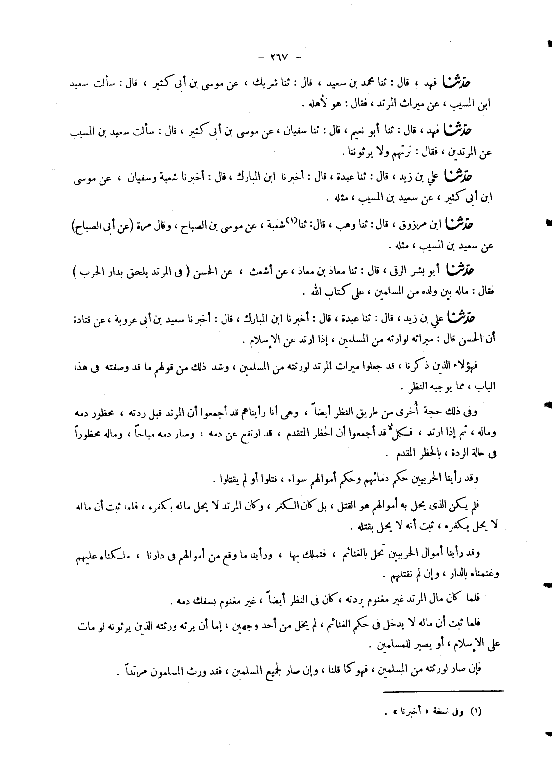 5303 - حَدَّثَنَا فَهْدٌ , قَالَ: ثنا أَبُو نُعَيْمٍ , قَالَ: ثنا سُفْيَانُ , عَنْ مُوسَى بْنِ أَبِي كَثِيرٍ , قَالَ: سَأَلْتُ سَعِيدَ بْنَ الْمُسَيِّبِ §عَنِ الْمُرْتَدِّينَ , فَقَالَ: نَرِثُهُمْ وَلَا يَرِثُونَنَا