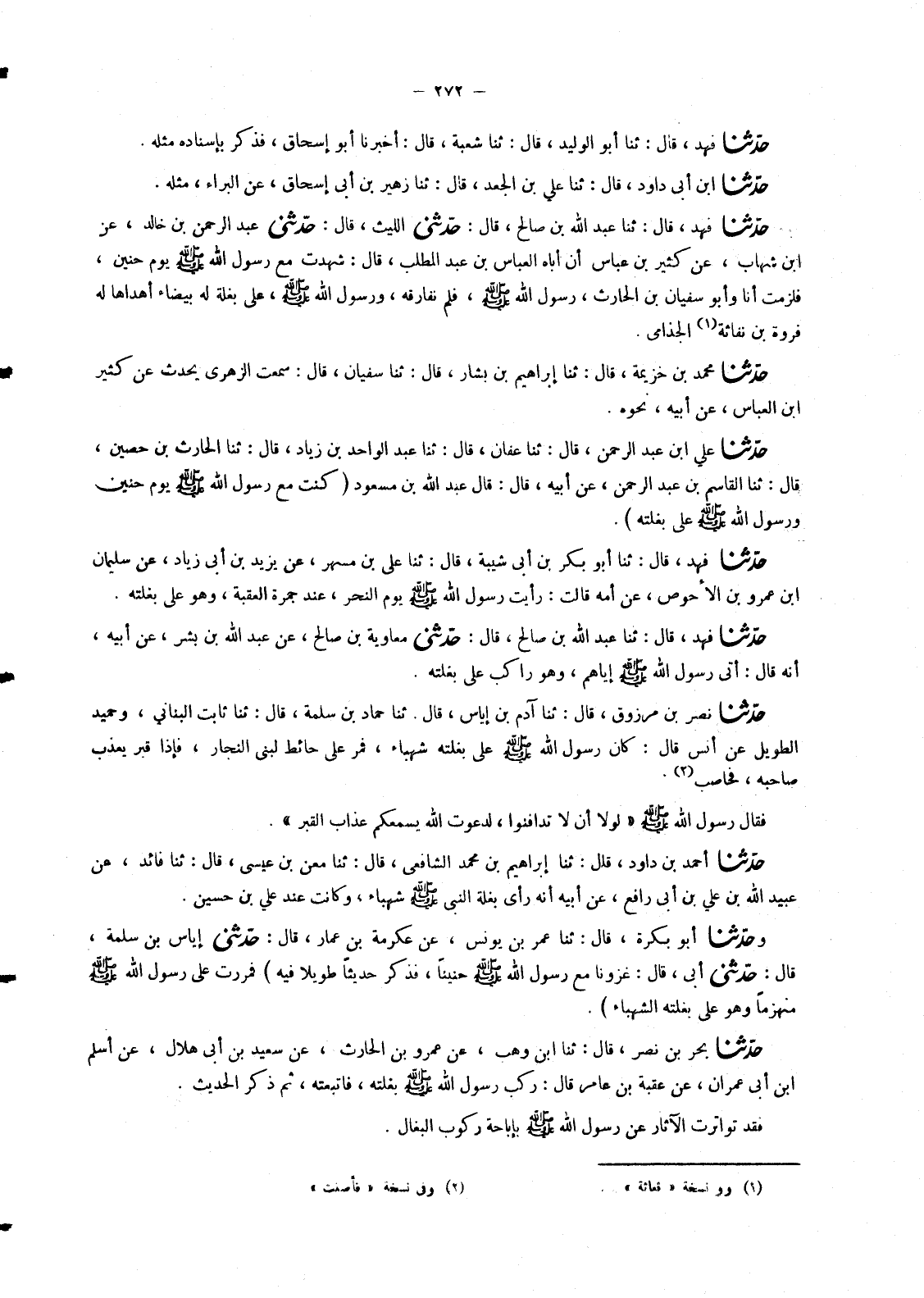 5328 - حَدَّثَنَا عَلِيُّ بْنُ عَبْدِ الرَّحْمَنِ , قَالَ: ثنا عَفَّانُ , قَالَ: ثنا عَبْدُ الْوَاحِدِ بْنُ زِيَادٍ , قَالَ: ثنا الْحَارِثُ بْنُ حَصِيرَةَ قَالَ: ثنا الْقَاسِمُ بْنُ عَبْدِ الرَّحْمَنِ , عَنْ أَبِيهِ , قَالَ: قَالَ عَبْدُ اللهِ بْنُ مَسْعُودٍ «§كُنْتُ مَعَ رَسُولِ اللهِ صَلَّى اللَّهُ عَلَيْهِ وَسَلَّمَ يَوْمَ حُنَيْنٍ وَرَسُولُ اللهِ صَلَّى اللَّهُ عَلَيْهِ وَسَلَّمَ عَلَى بَغْلَتِهِ»
