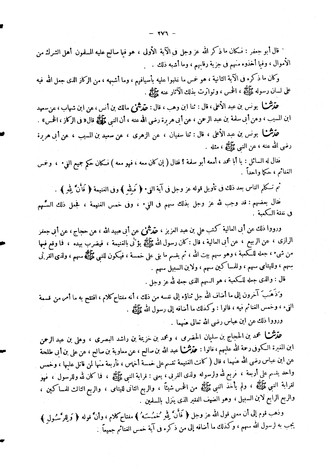 حَدَّثَنَا عَبْدُ اللهِ بْنُ صَالِحٍ , عَنْ مُعَاوِيَةَ بْنِ صَالِحٍ , عَنْ عَلِيِّ بْنِ أَبِي طَلْحَةَ , عَنِ ابْنِ عَبَّاسٍ رَضِيَ اللهُ عَنْهُمَا , قَالَ " §كَانَتِ الْغَنِيمَةُ تُقْسَمُ عَلَى خَمْسَةِ أَخْمَاسٍ , فَأَرْبَعَةٌ مِنْهَا لِمَنْ قَاتَلَ عَلَيْهَا , وَخُمُسٌ وَاحِدٌ يُقْسَمُ عَلَى أَرْبَعَةٍ , فَرُبْعٌ لِلَّهِ وَلِرَسُولِهِ وَلِذِي الْقُرْبَى , يَعْنِي: قَرَابَةَ النَّبِيِّ صَلَّى اللَّهُ عَلَيْهِ وَسَلَّمَ , فَمَا كَانَ لِلَّهِ وَلِلرَّسُولِ , فَهُوَ لِقَرَابَةِ النَّبِيِّ صَلَّى اللَّهُ عَلَيْهِ وَسَلَّمَ , «وَلَمْ يَأْخُذِ النَّبِيُّ صَلَّى اللَّهُ عَلَيْهِ وَسَلَّمَ مِنَ الْخُمُسِ شَيْئًا» , وَالرُّبْعُ الثَّانِي لِلْيَتَامَى , وَالرُّبْعُ الثَّالِثُ لِلْمَسَاكِينِ , وَالرُّبْعُ الرَّابِعُ لِابْنِ السَّبِيلِ , وَهُوَ الضَّيْفُ الْفَقِيرُ الَّذِي يَنْزِلُ بِالْمُسْلِمِينَ «وَذَهَبَ قَوْمٌ إِلَى أَنَّ مَعْنَى قَوْلِ اللهِ عَزَّ وَجَلَّ» فَأَنَّ لِلَّهِ خُمُسَهُ " مِفْتَاحُ كَلَامٍ , وَأَنَّ قَوْلَهُ: وَلِلرَّسُولِ , يَجِبُ بِهِ لِرَسُولِ اللهِ سَهْمٌ , وَكَذَلِكَ مَا أَضَافَهُ إِلَى مَنْ ذَكَرَهُ فِي آيَةٍ خُمُسِ الْغَنَائِمِ جَمِيعًا , -[277]- وَرَوَوْا ذَلِكَ عَنِ الْحَسَنِ بْنِ مُحَمَّدِ بْنِ عَلِيِّ بْنِ أَبِي طَالِبٍ رَضِيَ اللهُ عَنْهُمْ