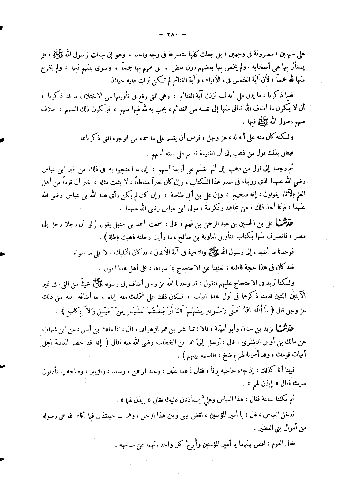 5370 - حَدَّثَنَا عَلِيُّ بْنُ الْحُسَيْنِ بْنِ عَبْدِ الرَّحْمَنِ بْنِ فَهْمٍ , قَالَ: سَمِعْتُ أَحْمَدَ بْنَ حَنْبَلٍ , يَقُولُ «§لَوْ أَنَّ رَجُلًا , رَحَلَ إِلَى مِصْرٍ , فَانْصَرَفَ مِنْهَا بِكِتَابِ التَّأْوِيلِ لِمُعَاوِيَةَ بْنِ صَالِحٍ , مَا رَأَيْتُ رِحْلَتَهُ ذَهَبَتْ بَاطِلَةً» فَوَجَدْنَا مَا أُضِيفَ إِلَى رَسُولِ اللهِ صَلَّى اللَّهُ عَلَيْهِ وَسَلَّمَ وَالتَّحِيَّةَ فِي آيَةِ الْأَنْفَالِ , قَدْ كَانَ التَّمْلِيكُ , لَا عَلَى مَا سِوَاهُ , فَقَدْ كَانَ فِي هَذَا حُجَّةٌ قَاطِعَةٌ , تُغْنِينَا عَنِ الِاحْتِجَاجِ بِمَا سِوَاهَا , عَلَى أَهْلِ هَذَا الْقَوْلِ , وَلَكِنَّا نُرِيدُ فِي الِاحْتِجَاجِ عَلَيْهِمْ فَنَقُولُ: قَدْ وَجَدْنَا اللهَ عَزَّ وَجَلَّ أَضَافَ إِلَى رَسُولِهِ صَلَّى اللَّهُ عَلَيْهِ وَسَلَّمَ شَيْئًا مِنَ الْفَيْءِ فِي غَيْرِ الْآيَتَيْنِ اللَّتَيْنِ قَدَّمْنَا ذِكْرَهُمَا فِي أَوَّلِ هَذَا الْبَابِ , فَكَانَ ذَلِكَ عَلَى التَّمْلِيكِ مِنْهُ إِيَّاهُ , مَا أَضَافَهُ إِلَيْهِ مِنْ ذَلِكَ عَزَّ وَجَلَّ قَالَ: {مَا أَفَاءَ اللهُ عَلَى رَسُولِهِ مِنْهُمْ فَمَا أَوْجَفْتُمْ عَلَيْهِ مِنْ خَيْلٍ وَلَا رِكَابٍ} [الحشر: 6]