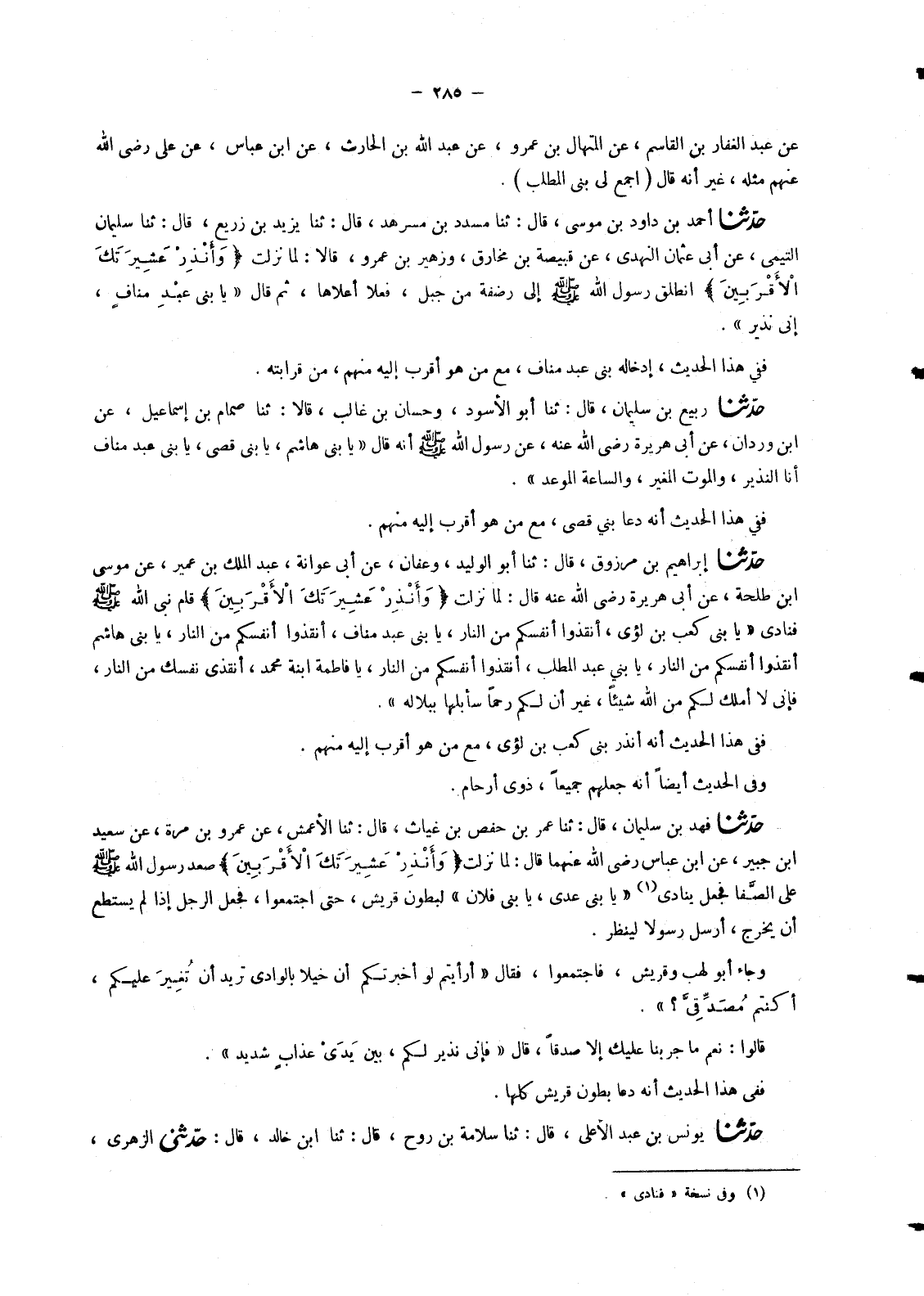 5386 - حَدَّثَنَا أَحْمَدُ بْنُ دَاوُدَ بْنِ مُوسَى , قَالَ: ثنا مُسَدَّدُ بْنُ مُسَرْهَدٍ , قَالَ: ثنا يَزِيدُ بْنُ زُرَيْعٍ , قَالَ: ثنا سُلَيْمَانُ التَّيْمِيُّ , عَنْ أَبِي عُثْمَانَ النَّهْدِيِّ , عَنْ قَبِيصَةَ بْنِ مُخَارِقٍ , وَزُهَيْرِ بْنِ عَمْرٍو , قَالَا: «§لَمَّا نَزَلَتْ» وَأَنْذِرْ عَشِيرَتَكَ الْأَقْرَبِينَ «انْطَلَقَ رَسُولُ اللهِ صَلَّى اللَّهُ عَلَيْهِ وَسَلَّمَ إِلَى رَضْفَةٍ مِنْ جَبَلٍ , فَعَلَا أَعْلَاهَا , ثُمَّ قَالَ يَا بَنِي عَبْدِ مَنَافٍ , إِنِّي نَذِيرٌ» فَفِي هَذَا الْحَدِيثِ , إِدْخَالُهُ بَنِي عَبْدِ مَنَافٍ , مَعَ مَنْ هُوَ أَقْرَبُ إِلَيْهِ مِنْهُمْ , مِنْ قَرَابَتِهِ
