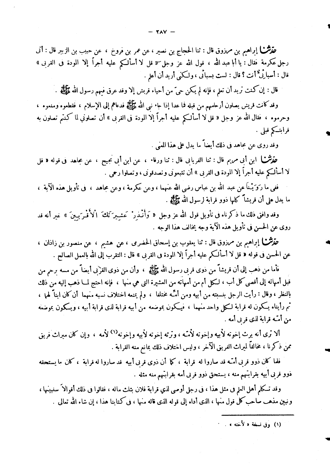 5396 - حَدَّثَنَا إِبْرَاهِيمُ بْنُ مَرْزُوقٍ , قَالَ: ثنا يَعْقُوبُ بْنُ إِسْحَاقَ الْحَضْرَمِيُّ , عَنْ هُشَيْمٍ , عَنْ مَنْصُورِ بْنِ زَاذَانَ , عَنِ الْحَسَنِ , فِي قَوْلِهِ {قُلْ لَا أَسْأَلُكُمْ عَلَيْهِ أَجْرًا إِلَّا الْمَوَدَّةَ فِي الْقُرْبَى} [الشورى: 23] قَالَ: §التَّقَرُّبُ إِلَى اللهِ بِالْعَمَلِ الصَّالِحِ فَأَمَّا مَنْ ذَهَبَ إِلَى أَنَّ قُرَيْشًا مِنْ ذَوِي قُرْبَى رَسُولِ اللهِ صَلَّى اللَّهُ عَلَيْهِ وَسَلَّمَ , وَأَنَّ مِنْ ذَوِي الْقُرْبَى أَيْضًا مَنْ مَسَّهُ بِرَحِمٍ مِنْ قِبَلِ أُمَّهَاتِهِ إِلَى أَقْصَى كُلِّ أَبٍ , لِكُلِّ أُمٍّ مِنْ أُمَّهَاتِهِ مِنَ الْعَشِيرَةِ الَّتِي هِيَ مِنْهَا , فَإِنَّهُ احْتَجَّ لِمَا ذَهَبَ إِلَيْهِ مِنْ ذَلِكَ بِالنَّظَرِ , وَقَالَ: رَأَيْتُ الرَّجُلَ بِنِسْبَتِهِ مِنْ أَبِيهِ وَمِنْ أُمِّهِ مُخْتَلِفًا , وَلَمْ يَمْنَعْهُ اخْتِلَافُ نَسَبِهِ مِنْهُمَا إِنْ كَانَ ابْنًا لَهُمَا , ثُمَّ رَأَيْنَاهُ يَكُونُ لَهُ قَرَابَةٌ لِكُلِّ وَاحِدٍ مِنْهُمَا , فَيَكُونُ بِمَوْضِعِهِ مِنْ أَبِيهِ قَرَابَةٌ لِذِي قَرَابَةِ أَبِيهِ , وَيَكُونُ بِمَوْضِعِهِ مِنْ أُمِّهِ قَرَابَةٌ لِذِي قُرْبَى أُمِّهِ , أَلَا تَرَى أَنَّهُ يَرِثُ إِخْوَتَهُ لِأَبِيهِ وَإِخْوَتَهُ لِأُمِّهِ , وَتَرِثُهُ إِخْوَتُهُ لِأَبِيهِ وَإِخْوَتُهُ لِأُمِّهِ , وَإِنْ كَانَ مِيرَاثُ فَرِيقٍ مِمَّنْ ذَكَرْنَا , مُخَالِفًا لِمِيرَاثِ الْفَرِيقِ الْآخَرِ , وَلَيْسَ اخْتِلَافُ ذَلِكَ بِمَانِعٍ مِنْهُ الْقَرَابَةَ , فَلَمَّا كَانَ ذَوُو قُرْبَى أُمِّهِ قَدْ صَارُوا لَهُ قَرَابَةً , كَمَا أَنَّ ذَوِي قُرْبَى أَبِيهِ قَدْ صَارُوا لَهُ قَرَابَةً , كَانَ مَا يَسْتَحِقُّهُ ذَوُو قُرْبَى أَبِيهِ بِقَرَابَتِهِمْ مِنْهُ , يَسْتَحِقُّ ذَوُو قُرْبَى أُمِّهِ بِقَرَابَتِهِمْ مِنْهُ مِثْلُهُ , وَقَدْ تَكَلَّمَ أَهْلُ الْعِلْمِ فِي مِثْلِ هَذَا , فِي رَجُلٍ أَوْصَى لِذِي قَرَابَةِ فُلَانٍ بِثُلُثِ مَالِهِ , فَقَالُوا فِي ذَلِكَ أَقْوَالًا سَنُبَيِّنُهَا , وَنُبَيِّنُ مَذْهَبَ صَاحِبِ كُلِّ قَوْلٍ مِنْهَا , الَّذِي أَدَّاهُ إِلَى قَوْلِهِ الَّذِي قَالَهُ مِنْهَا , فِي كِتَابِنَا هَذَا , إِنْ شَاءَ اللهُ تَعَالَى , -[288]- فَكَانَ أَبُو حَنِيفَةَ رَحْمَةُ اللهِ عَلَيْهِ قَالَ: هِيَ كُلُّ ذِي رَحِمِ مَحْرَمٍ مِنْ فُلَانِ الْمُوصِي لِقَرَابَتِهِ , بِمَا أَوْصَى لَهُمْ بِهِ مِنْ قِبَلِ أَبِيهِ , وَمِنْ قِبَلِ أُمِّهِ , غَيْرَ أَنَّهُ يَبْدَأُ فِي ذَلِكَ بِمَنْ كَانَتْ قَرَابَتُهُ مِنْهُ مِنْ قِبَلِ أَبِيهِ , عَلَى مَنْ كَانَتْ قَرَابَتُهُ مِنْهُ مِنْ قِبَلِ أُمِّهِ , وَتَفْسِيرُ ذَلِكَ أَنْ يَكُونَ لَهُ عَمٌّ وَخَالٌ , فَقَرَابَةُ عَمِّهِ مِنْهُ , مِنْ قِبَلِ أَبِيهِ , كَقَرَابَةِ خَالِهِ مِنْهُ مِنْ قِبَلِ أُمِّهِ , فَيَبْدَأُ فِي ذَلِكَ عَمَّهُ , عَلَى خَالِهِ , فَيَجْعَلُ الْوَصِيَّةَ لَهُ , وَكَانَ زُفَرُ بْنُ الْهُذَيْلِ يَقُولُ: الْوَصِيَّةُ لِكُلِّ مَنْ قَرُبَ مِنْهُ مِنْ قِبَلِ أَبِيهِ أَوْ مِنْ قِبَلِ أُمِّهِ , دُونَ مَنْ كَانَ أَبْعَدَ مِنْهُ مِنْهُمْ , وَسَوَاءٌ فِي ذَلِكَ مَنْ كَانَ مِنْهُمْ ذَا رَحِمٍ لِلْمُوصِي لِقَرَابَتِهِ , وَمَنْ لَمْ يَكُنْ مِنْهُمْ ذَا رَحِمٍ , وَقَالَ أَبُو يُوسُفَ وَمُحَمَّدٌ رَحْمَةُ اللهِ عَلَيْهِمَا: الْوَصِيَّةُ فِي ذَلِكَ لِكُلِّ مَنْ جَمَعَهُ وَفُلَانًا أَبٌ وَاحِدٌ , مُنْذُ كَانَتِ الْهِجْرَةُ مِنْ قِبَلِ أَبِيهِ , أَوْ مِنْ قِبَلِ أُمِّهِ , وَسَوَّيَا فِي ذَلِكَ بَيْنَ مَنْ بَعُدَ مِنْهُمْ وَبَيْنَ مَنْ قَرُبَ , وَبَيْنَ مَنْ كَانَتْ رَحِمُهُ مَحْرَمَةً مِنْهُمْ , وَبَيْنَ مَنْ كَانَتْ رَحِمُهُ مِنْهُمْ غَيْرَ مَحْرَمَةٍ , وَلَمْ يُفَضِّلَا فِي ذَلِكَ بَيْنَ مَنْ كَانَتْ رَحِ