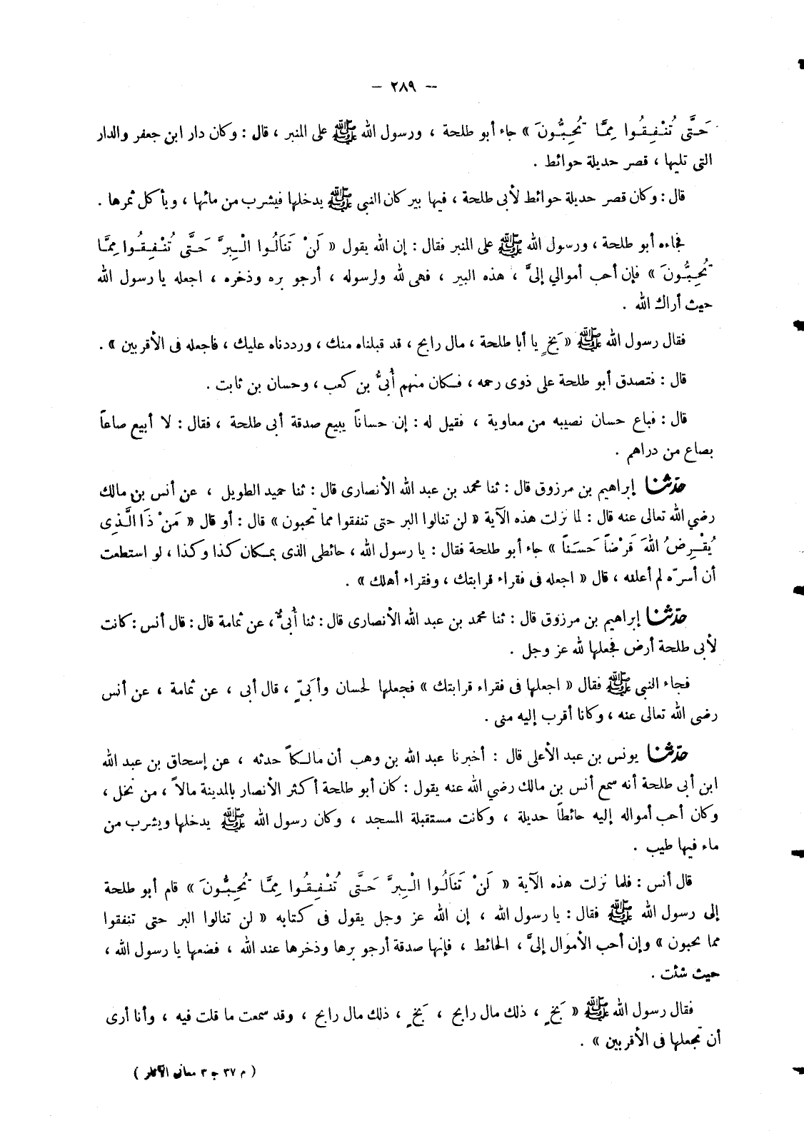 5400 - حَدَّثَنَا يُونُسُ بْنُ عَبْدِ الْأَعْلَى , قَالَ: أَخْبَرَنَا عَبْدُ اللهِ بْنُ وَهْبٍ , أَنَّ مَالِكًا حَدَّثَهُ , عَنْ إِسْحَاقَ بْنِ عَبْدِ اللهِ بْنِ أَبِي طَلْحَةَ , أَنَّهُ سَمِعَ أَنَسَ بْنَ مَالِكٍ رَضِيَ اللهُ عَنْهُ يَقُولُ: " كَانَ أَبُو طَلْحَةَ أَكْثَرَ الْأَنْصَارِ بِالْمَدِينَةِ مَالًا مِنْ نَخْلٍ , وَكَانَ أَحَبَّ أَمْوَالِهِ إِلَيْهِ حَائِطُ حُدَيْلَةَ , وَكَانَتْ مُسْتَقْبِلَةَ الْمَسْجِدِ , وَكَانَ رَسُولُ اللهِ صَلَّى اللَّهُ عَلَيْهِ وَسَلَّمَ يَدْخُلُهَا وَيَشْرَبُ مِنْ مَاءٍ فِيهَا طَيِّبٍ , قَالَ أَنَسٌ: فَلَمَّا نَزَلَتْ هَذِهِ الْآيَةُ {لَنْ تَنَالُوا الْبِرَّ حَتَّى تُنْفِقُوا مِمَّا تُحِبُّونَ} [آل عمران: 92] قَامَ أَبُو طَلْحَةَ إِلَى رَسُولِ اللهِ صَلَّى اللَّهُ عَلَيْهِ وَسَلَّمَ، فَقَالَ: يَا رَسُولَ اللهِ , إِنَّ اللهَ عَزَّ وَجَلَّ يَقُولُ فِي كِتَابِهِ: {لَنْ تَنَالُوا الْبِرَّ حَتَّى تُنْفِقُوا مِمَّا تُحِبُّونَ "} [آل عمران: 92] وَإِنَّ أَحَبَّ الْأَمْوَالِ إِلَيَّ الْحَائِطُ , فَإِنَّهَا صَدَقَةٌ أَرْجُو بِرَّهَا وَذُخْرَهَا عِنْدَ اللهِ , فَضَعْهَا يَا رَسُولَ اللهِ حَيْثُ شِئْتَ. فَقَالَ رَسُولُ اللهِ صَلَّى اللَّهُ عَلَيْهِ وَسَلَّمَ: §بَخٍ , ذَلِكَ مَالٌ رَابِحٌ , بَخٍ , ذَلِكَ مَالٌ رَابِحٌ , وَقَدْ سَمِعْتُ مَا قُلْتَ فِيهِ , وَأَنَا أَرَى أَنْ تَجْعَلَهَا فِي الْأَقْرَبِينَ. -[290]- فَقَالَ أَبُو طَلْحَةَ: أَفْعَلُ يَا رَسُولَ اللهِ. فَقَسَمَهَا أَبُو طَلْحَةَ فِي أَقَارِبِهِ وَبَنِي عَمِّهِ ". قَالَ أَبُو جَعْفَرٍ: فَهَذَا أَبُو طَلْحَةَ رَضِيَ اللهُ عَنْهُ قَدْ جَعَلَهَا فِي أُبَيٍّ وَحَسَّانَ , وَإِنَّمَا يَلْتَقِي هُوَ وَأُبَيٌّ عِنْدَ أَبِيهِ السَّابِعِ , لِأَنَّ أَبَا طَلْحَةَ اسْمُهُ زَيْدُ بْنُ سَهْلِ بْنِ الْأَسْوَدِ بْنِ حَرَامِ بْنِ عَمْرِو بْنِ زَيْدِ مَنَاةَ بْنِ عَدِيِّ بْنِ عَمْرِو بْنِ مَالِكِ بْنِ النَّجَّارِ , وَحَسَّانُ بْنُ ثَابِتِ بْنِ الْمُنْذِرِ بْنِ حَرَامِ بْنِ عَمْرِو بْنِ زَيْدِ مَنَاةَ بْنِ عَدِيِّ بْنِ عَمْرِو بْنِ مَالِكِ بْنِ النَّجَّارِ , وَكِلَاهُمَا لَيْسَ بِذِي رَحِمٍ مَحْرَمٍ مِنْهُ , فَدَلَّ ذَلِكَ عَلَى فَسَادِ قَوْلِ مَنْ زَعَمَ أَنَّ الْقَرَابَةَ لَيْسَتْ إِلَّا مَنْ كَانَتْ رَحِمُهُ رَحِمًا مَحْرَمَةً , وَأَمَّا مَا ذَهَبَ إِلَيْهِ زُفَرُ بْنُ الْهُذَيْلِ بِمَا قَدْ حَكَيْنَا عَنْهُ فِي هَذَا الْفَصْلِ فَفَاسِدٌ أَيْضًا , لِأَنَّا رَأَيْنَا رَسُولَ اللهِ صَلَّى اللَّهُ عَلَيْهِ وَسَلَّمَ لَمَّا أَعْطَى بَنِي هَاشِمٍ وَبَنِي الْمُطَّلِبِ مَا أَعْطَاهُمْ مِنْ سَهْمِ ذَوِي الْقُرْبَى , قَدْ سَوَّى بَيْنَ مَنْ قَرُبَتْ رَحِمُهُ مِنْهُ , وَبَيْنَ مَنْ بَعُدَتْ رَحِمُهُ مِنْهُمْ مِنْهُ، وَهُمْ جَمِيعًا لَهُ ذَوُو قَرَابَةٍ , فَلَوْ كَانَ مَنْ قَرُبَ مِنْهُ يَحْجُبُ مَنْ بَعُدَ مِنْهُ، إِذًا لَمَا أَعْطَاهُ بَعِيدًا مَعَ قَرِيبٍ , لِأَنَّ اللهَ عَزَّ وَجَلَّ إِنَّمَا أَمَرَهُ أَنْ يُعْطِيَ ذَا قَرَابَتِهِ , وَلَمْ يَكُنْ لِيُخَالِفَ مَا أَمَرَهُ بِهِ , وَهَذَا أَبُو طَلْحَةَ , فَقَدْ جَمَعَ فِي عَطِيَّتِهِ أُبَيَّ بْنَ كَعْبٍ , وَحَسَّانَ بْنَ ثَابِتٍ , وَأَحَدُهُمَا أَقْرَبُ إِلَيْهِ مِنَ الْآخَرِ , إِنْ كَانَا مِنْ ذَوِي قَرَابَتِهِ , وَلَمْ يَكُنْ لِمَا فَعَلَ مِنْ ذَلِكَ مُخَالِفًا لِمَا أَمَرَهُ رَسُولُ اللهِ صَلَّى اللَّهُ عَلَيْهِ وَسَلَّمَ، كَمَا لَمْ يَكُنْ رَسُولُ اللهِ صَلَّى اللَّهُ عَلَيْهِ وَسَلَّمَ فِي إِعْطَائِهِ بَنِي الْمُطَّلِبِ مَعَ بَنِي هَاشِمٍ مُخَالِفًا أَمْرَ اللهِ فِي إِعْطَائِهِ مَنْ أَمَرَهُ بِإِعْطَائِهِ مِنْ قَرَابَتِهِ , وَأَمَّا مَا ذَهَبَ إِلَيْهِ الَّذِينَ قَالُوا: قَرَابَةُ الرَّجُلِ ك