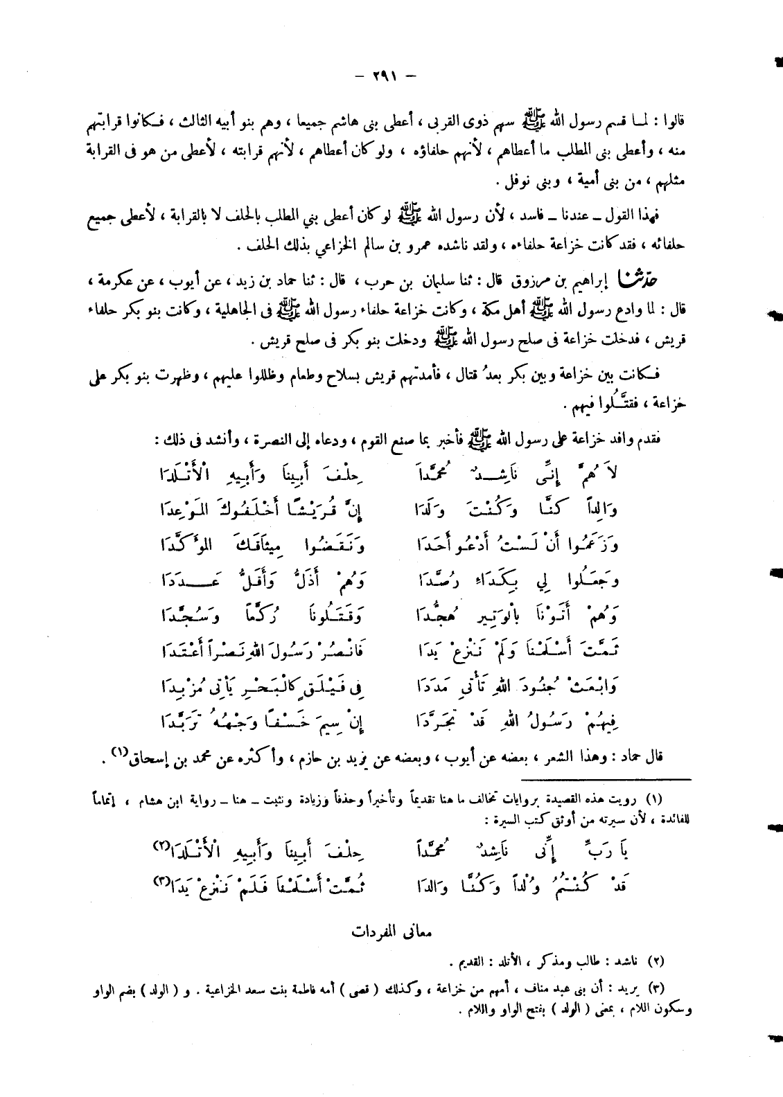 5402 - حَدَّثَنَا فَهْدُ بْنُ سُلَيْمَانَ قَالَ: ثنا يُوسُفُ بْنُ بُهْلُولٍ , قَالَ: ثنا عَبْدُ اللهِ بْنُ إِدْرِيسَ , عَنْ مُحَمَّدِ بْنِ إِسْحَاقَ , عَنِ الزُّهْرِيِّ وَغَيْرِهِ نَحْوَهُ، غَيْرَ أَنَّهُ ذَكَرَ أَنَّ الْمُنَاشِدَ لِرَسُولِ اللهِ صَلَّى اللَّهُ عَلَيْهِ وَسَلَّمَ بِهَذَا الشِّعْرِ عَمْرُو بْنُ سَالِمٍ، فَلَمَّا كَانَ رَسُولُ اللهِ صَلَّى اللَّهُ عَلَيْهِ وَسَلَّمَ لَمْ يُدْخِلْ خُزَاعَةَ فِي سَهْمِ ذَوِي الْقُرْبَى , لِلْحِلْفِ الَّذِي بَيْنَهُ وَبَيْنَهُمْ , اسْتَحَالَ أَنْ يَكُونَ إِعْطَاءُ بَنِي الْمُطَّلِبِ لِلْحِلْفِ , وَلَوْ كَانَ إِعْطَاؤُهُمْ لِلْحِلْفِ أَيْضًا , لَأَعْطَى مَوَالِيَ بَنِي هَاشِمٍ , وَهُوَ فَلَمْ يُعْطِهِمْ شَيْئًا , وَأَمَّا مَا ذَهَبَ أَبُو يُوسُفَ وَمُحَمَّدُ بْنُ الْحَسَنِ رَحْمَةُ اللهِ عَلَيْهِمَا , مِمَّا قَدْ ذَكَرْنَاهُ عَنْهُمَا , فَهُوَ أَحْسَنُ هَذِهِ الْأَقْوَالِ كُلِّهَا عِنْدَنَا , لِأَنَّا رَأَيْنَا النَّاسَ فِي دَهْرِنَا هَذَا يُنْسَبُونَ إِلَى الْعَبَّاسِ , وَكَذَلِكَ آلُ عَلِيٍّ , وَآلُ جَعْفَرٍ , وَآلُ عَقِيلٍ , وَآلُ الزُّبَيْرِ , وَطَلْحَةَ , كُلُّ هَؤُلَاءِ لَا يُنْسَبُ أَوْلَادُهُمْ إِلَّا إِلَى أَبِيهِمُ الْأَعْلَى , فَيُقَالُ: بَنُو الْعَبَّاسِ , وَبَنُو عَلِيٍّ , وَبَنُو مَنْ ذَكَرْنَا , حَتَّى قَدْ صَارَ ذَلِكَ يَجْمَعُهُمْ , وَحَتَّى قَدْ صَارُوا بِآبَائِهِمْ مُتَفَرِّقِينَ كَأَهْلِ الْعَشَائِرِ الْمُخْتَلِفَةِ , فَإِنْ قَالَ قَائِلٌ: رَأَيْنَا رَسُولَ اللهِ صَلَّى اللَّهُ عَلَيْهِ وَسَلَّمَ لَمَّا قَسَمَ سَهْمَ ذَوِي الْقُرْبَى , إِنَّمَا جَعَلَهُ فِيمَنْ يَجْمَعُهُ وَإِيَّاهُ أَبٌ جَاهِلِيٌّ , فَكَانَ بَنُو ذَلِكَ الْأَبِ مِنْ ذَوِي قَرَابَتِهِ , وَكَذَلِكَ مَنْ أَعْطَاهُ أَبُو طَلْحَةَ , مَا أَعْطَاهُ مِمَّنْ ذَكَرْنَا , فَإِنَّمَا يَجْمَعُهُمْ وَإِيَّاهُ أَبٌ جَاهِلِيٌّ , -[293]- فَلِمَ قُلْتُمْ: إِنَّ قَرَابَةَ الرَّجُلِ هِيَ مَنْ جَمَعَهُ وَإِيَّاهُ أَقْصَى آبَائِهِ فِي الْإِسْلَامِ؟ قِيلَ لَهُ: قَدْ ذَكَرْنَا فِيمَا تَقَدَّمَ مِنَّا , فِي كِتَابِنَا هَذَا , أَنَّ رَسُولَ اللهِ صَلَّى اللَّهُ عَلَيْهِ وَسَلَّمَ أَعْطَى قَرَابَةً , وَمَنَعَ قَرَابَةً , وَقَدْ كَانَ كُلُّ مَنْ أَعْطَاهُ وَكُلُّ مَنْ حَرَمَهُ , مِمَّنْ لَمْ يُعْطِهِ , مِمَّنْ مَوْضِعُهُ مِنْهُ , وَمَوْضِعُ الَّذِي أَعْطَاهُ يَجْمَعُهُ وَإِيَّاهُمْ عَشِيرَةٌ وَاحِدَةٌ , يُنْسَبُونَ إِلَيْهَا حَتَّى يُقَالَ لَهُمْ جَمِيعًا: هَؤُلَاءِ الْقُرَيْشِيُّونَ , وَلَا يُنْسَبُونَ إِلَى مَا بَعْدَ قُرَيْشٍ , فَيُقَالُ: هَؤُلَاءِ الْكِنَانِيُّونَ , فَصَارَ أَهْلُ الْعَشِيرَةِ جَمِيعًا بَنِي أَبٍ وَاحِدٍ وَقَرَابَةٍ وَاحِدَةٍ , وَبَانُوا مِمَّنْ سِوَاهُمْ , فَلَمْ يُنْسَبُوا إِلَيْهِ فَكَذَلِكَ أَيْضًا كُلُّ أَبٍ حَدَثَ فِي الْإِسْلَامِ صَارَ فَخِذًا أَوْ صَارَ عَشِيرَةً يُنْسَبُ وَلَدُهُ إِلَيْهِ فِي الْإِسْلَامِ فَكَانَ هُوَ وَوَلَدُهُ يُنْسَبُونَ جَمِيعًا إِلَى عَشِيرَةٍ وَاحِدَةٍ قَدْ تَقَدَّمَتِ الْإِسْلَامَ فَهُمْ جَمِيعًا مِنْ أَهْلِ تِلْكَ الْعَشِيرَةِ , هَذَا أَحْسَنُ الْأَقْوَالِ فِي هَذَا الْبَابِ عِنْدَنَا , وَاللهَ نَسْأَلُهُ التَّوْفِيقَ , ثُمَّ رَجَعْنَا إِلَى مَا أَعْطَى رَسُولُ اللهِ صَلَّى اللَّهُ عَلَيْهِ وَسَلَّمَ ذَوِي قُرْبَاهُ , فَوَجَدْنَا النَّاسَ قَدِ اخْتَلَفُوا فِي ذَلِكَ , فَقَالَ بَعْضُهُمْ: أَعْطَاهُ بِحَقٍّ قَدْ وَجَبَ لَهُمْ بِذِكْرِ اللهِ عَزَّ وَجَلَّ إِيَّاهُمْ فِي آيَةِ الْغَنَائِمِ , وَفِي آيَةِ الْفَيْءِ , وَلَمْ يَكُنْ لِرَسُولِ اللهِ صَلَّى اللَّهُ عَلَيْهِ وَسَلَّمَ مَنْعُهُمْ مِنْ ذَلِكَ , وَلَا التَّخَطِّي بِهِ عَنْهُمْ إِل