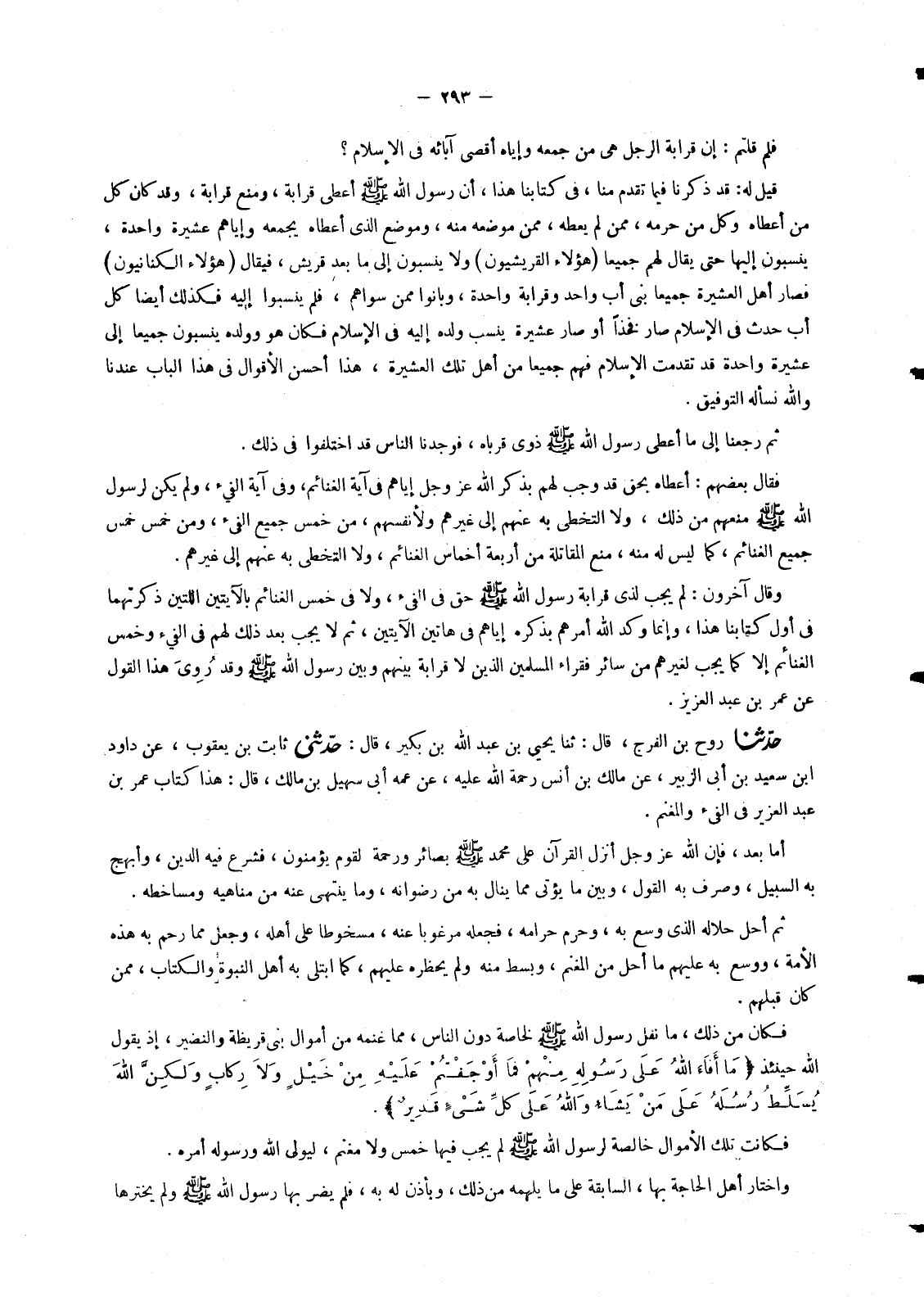 5403 - حَدَّثَنَا رَوْحُ بْنُ الْفَرَجِ , قَالَ: ثنا يَحْيَى بْنُ عَبْدِ اللهِ بْنِ بُكَيْرٍ , قَالَ: حَدَّثَنِي ثَابِتُ بْنُ يَعْقُوبَ , عَنْ دَاوُدَ بْنِ سَعِيدِ بْنِ أَبِي زَنْبَرٍ، عَنْ مَالِكِ بْنِ أَنَسٍ , رَحْمَةُ اللهِ عَلَيْهِ , عَنْ عَمِّهِ أَبِي سُهَيْلِ بْنِ مَالِكٍ , قَالَ: هَذَا كِتَابُ عُمَرَ بْنِ عَبْدِ الْعَزِيزِ §فِي الْفَيْءِ وَالْمَغْنَمِ , أَمَّا بَعْدُ , فَإِنَّ اللهَ عَزَّ وَجَلَّ أَنْزَلَ الْقُرْآنَ عَلَى مُحَمَّدٍ صَلَّى اللَّهُ عَلَيْهِ وَسَلَّمَ بَصَائِرَ وَرَحْمَةً لِقَوْمٍ يُؤْمِنُونَ , فَشَرَعَ فِيهِ الدِّينَ , وَأَبْهَجَ بِهِ السَّبِيلَ , وَصَرَفَ بِهِ الْقَوْلَ , وَبَيَّنَ مَا يُؤْتَى مِمَّا يُنَالُ بِهِ مِنْ رِضْوَانِهِ , وَمَا يُنْتَهَى عَنْهُ مِنْ مَنَاهِيهِ وَمَسَاخِطِهِ , ثُمَّ أَحَلَّ حَلَالَهُ الَّذِي وَسَّعَ بِهِ , وَحَرَّمَ حَرَامَهُ , فَجَعَلَهُ مَرْغُوبًا عَنْهُ , مَسْخُوطًا عَلَى أَهْلِهِ , وَجَعَلَ مِمَّا رَحِمَ بِهِ هَذِهِ الْأُمَّةَ , وَوَسَّعَ بِهِ عَلَيْهِمْ مَا أَحَلَّ مِنَ الْمَغْنَمِ , وَبَسَطَ مِنْهُ وَلَمْ يَحْظُرْهُ عَلَيْهِمْ , كَمَا ابْتَلَى بِهِ أَهْلَ النُّبُوَّةِ وَالْكِتَابِ , مِمَّنْ كَانَ قَبْلَهُمْ , فَكَانَ مِنْ ذَلِكَ , مَا نَقَلَ رَسُولُ اللهِ صَلَّى اللَّهُ عَلَيْهِ وَسَلَّمَ لِخَاصَّةٍ دُونَ النَّاسِ , مِمَّا غَنِمَهُ مِنْ أَمْوَالِ بَنِي قُرَيْظَةَ وَالنَّضِيرِ , إِذْ يَقُولُ اللهُ حِينَئِذٍ {مَا أَفَاءَ اللهُ عَلَى رَسُولِهِ مِنْهُمْ فَمَا أَوْجَفْتُمْ عَلَيْهِ مِنْ خَيْلٍ وَلَا رِكَابٍ وَلَكِنَّ اللهَ يُسَلِّطُ رُسُلَهُ عَلَى مَنْ يَشَاءُ وَاللهُ عَلَى كُلِّ شَيْءٍ قَدِيرٌ} [الحشر: 6] , فَكَانَتْ تِلْكَ الْأَمْوَالُ خَالِصَةً لِرَسُولِ اللهِ صَلَّى اللَّهُ عَلَيْهِ وَسَلَّمَ لَمْ يَجِبْ فِيهَا خُمُسٌ وَلَا مَغْنَمٌ , لِيُوَلِّيَ اللهُ وَرَسُولَهُ أَمْرَهُ , وَاخْتَارَ أَهْلَ الْحَاجَةِ بِهَا , السَّابِقَةَ عَلَى مَا يُلْهِمُهُ مِنْ ذَلِكَ , وَيَأْذَنُ لَهُ بِهِ , فَلَمْ يَضُرَّ بِهَا رَسُولُ اللهِ صَلَّى اللَّهُ عَلَيْهِ وَسَلَّمَ وَلَمْ يَخْتَرْهَا -[294]- لِنَفْسِهِ , وَلَا لِأَقَارِبِهِ , وَلَمْ يُخَصِّصْ بِهَذَا مِنْهُمْ بِفَرْضٍ وَلَا سُهْمَانَ , وَلَكِنْ آثَرَ , بِأَوْسَعِهَا وَأَكْثَرِهَا أَهْلَ الْحَقِّ وَالْقُدُمَةَ , مِنَ الْمُهَاجِرِينَ {الَّذِينَ أُخْرِجُوا مِنْ دِيَارِهِمْ وَأَمْوَالِهِمْ , يَبْتَغُونَ فَضْلًا مِنَ اللهِ وَرِضْوَانًا وَيَنْصُرُونَ اللهَ وَرَسُولَهُ , أُولَئِكَ هُمُ الصَّادِقُونَ} [الحشر: 8] , وَقَسَمَ اللهُ طَوَائِفَ مِنْهَا فِي أَهْلِ الْحَاجَةِ مِنَ الْأَنْصَارِ , وَحَبَسَ رَسُولُ اللهِ صَلَّى اللَّهُ عَلَيْهِ وَسَلَّمَ فَرِيقًا مِنْهَا لِنَائِبَتِهِ وَحَقِّهِ , وَمَا يَعْرُوهُ: أَيْ يَعْرِضُ لَهُ وَيَعْتَرِيهِ , غَيْرُ مُفْتَقِدٍ شَيْئًا مِنْهَا وَلَا مُسْتَأْثِرٍ بِهِ , وَلَا مُرِيدٍ أَنْ يُؤْتِيهِ أَحَدٌ بَعْدَهُ , فَجَعَلَهُ صَدَقَةً لَا يُورَثُ لِأَحَدٍ فِيهِ هَادَّةٌ فِي الدُّنْيَا , وَمَحْقَرَةٌ لَهَا وَأَثَرَةٌ لِمَا عِنْدَ اللهِ , فَهَذَا الَّذِي لَمْ يُوجَفْ فِيهِ خَيْلٌ وَلَا رِكَابٌ , وَمِنِ الْأَنْفَالِ الَّتِي آثَرَ اللهُ بِهَا رَسُولَهُ وَلَمْ يَجْعَلْ لِأَحَدٍ فِيهَا مِثْلَ الَّذِي جَعَلَ لَهُ مِنَ الْمَغْنَمِ , الَّذِي فِيهِ اخْتِلَافُ مَنِ اخْتَلَفَ , قَوْلُ اللهِ عَزَّ وَجَلَّ {مَا أَفَاءَ اللهُ عَلَى رَسُولِهِ مِنْ أَهْلِ الْقُرَى فَلِلَّهِ وَلِلرَّسُولِ وَلِذِي الْقُرْبَى وَالْيَتَامَى وَالْمَسَاكِينِ وَابْنِ السَّبِيلِ كَيْ لَا يَكُونَ دُولَةً بَيْنَ الْأَغْنِيَاءِ مِنْكُمْ} [الحشر: 7] , ثُمَّ قَالَ {وَمَا آتَاكُمُ الرَّسُولُ فَخُذُوهُ وَمَا نَهَاكُمْ عَنْهُ فَانْتَهُوا وَاتَّقُو