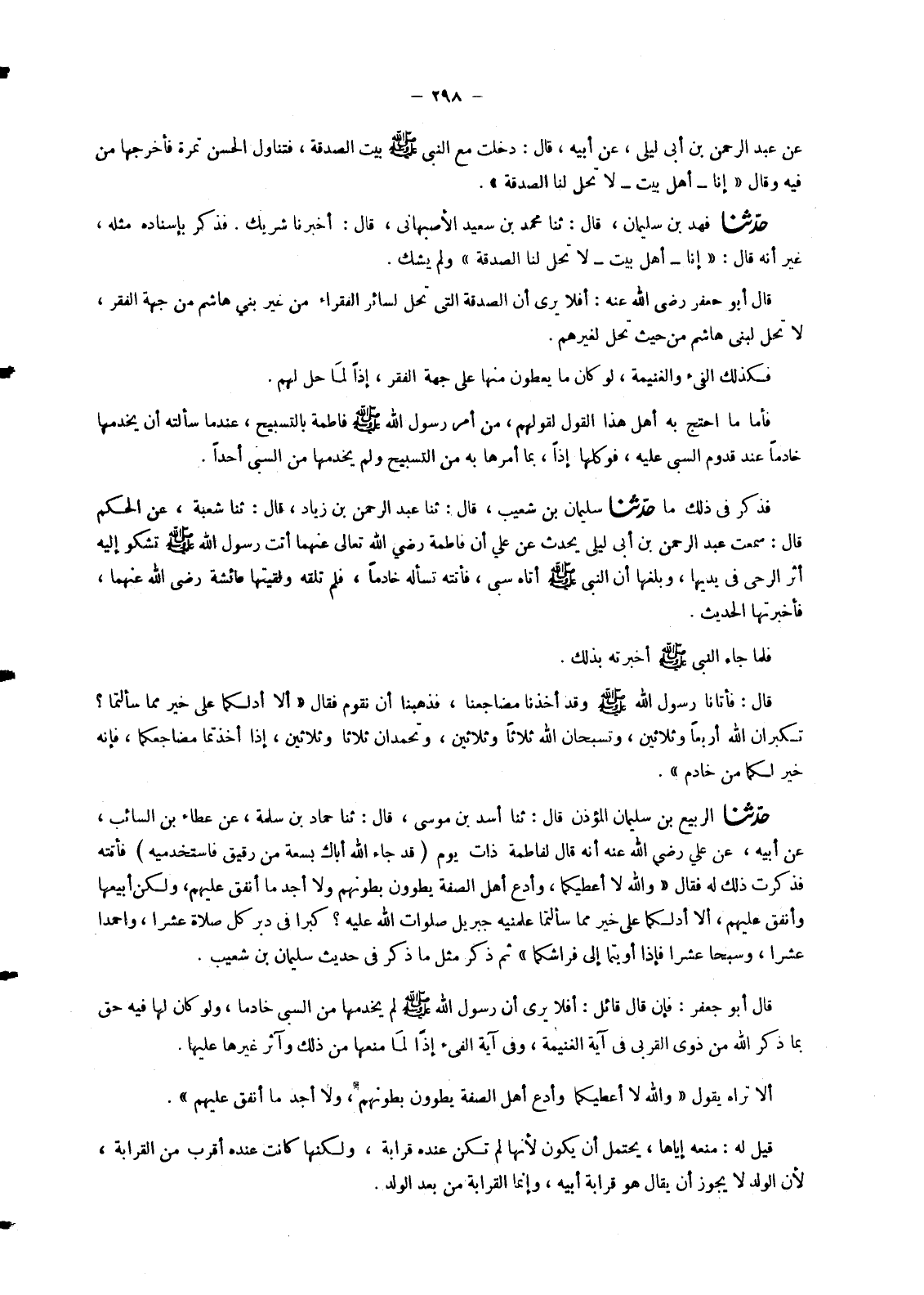 5415 - حَدَّثَنَا الرَّبِيعُ بْنُ سُلَيْمَانَ الْمُؤَذِّنُ , قَالَ: ثنا أَسَدُ بْنُ مُوسَى , قَالَ: ثنا حَمَّادُ بْنُ سَلَمَةَ , عَنْ عَطَاءِ بْنِ السَّائِبِ , عَنْ أَبِيهِ , " عَنْ عَلِيٍّ رَضِيَ اللهُ عَنْهُ أَنَّهُ قَالَ لِفَاطِمَةَ ذَاتَ يَوْمٍ: قَدْ جَاءَ اللهُ أَبَاكِ بِسَعَةٍ مِنْ رَقِيقٍ فَاسْتَخْدِمِيهِ. فَأَتَتْهُ فَذَكَرَتْ ذَلِكَ لَهُ، فَقَالَ: §وَاللهِ لَا أُعْطِيكُمَا , وَأَدَعَ أَهْلَ الصُّفَّةِ يَطْوُونَ بُطُونَهُمْ وَلَا أَجِدُ مَا أُنْفِقُ عَلَيْهِمْ , وَلَكِنْ أَبِيعُهَا وَأُنْفِقُ عَلَيْهِمْ , أَلَا أَدُلُّكُمَا عَلَى خَيْرٍ مِمَّا سَأَلْتُمَا عَلَّمَنِيهِ جِبْرِيلُ صَلَوَاتُ اللهِ عَلَيْهِ كَبِّرَا فِي دُبُرِ كُلِّ صَلَاةٍ عَشْرًا , وَاحْمَدَا عَشْرًا , وَسَبِّحَا عَشْرًا، فَإِذَا أَوَيْتُمَا إِلَى فِرَاشِكُمَا. ثُمَّ ذَكَرَ مِثْلَ مَا ذَكَرَ فِي حَدِيثِ سُلَيْمَانَ بْنِ شُعَيْبٍ قَالَ أَبُو جَعْفَرٍ: فَإِنْ قَالَ قَائِلٌ: أَفَلَا يَرَى أَنَّ رَسُولَ اللهِ صَلَّى اللَّهُ عَلَيْهِ وَسَلَّمَ لَمْ يُخْدِمْهَا مِنَ السَّبْيِ خَادِمًا , وَلَوْ كَانَ لَهَا فِيهِ حَقٌّ بِمَا ذَكَرَ اللهُ مِنْ ذَوِي الْقُرْبَى فِي آيَةِ الْغَنِيمَةِ , وَفِي آيَةِ الْفَيْءِ إِذًا لَمَا مَنَعَهَا مِنْ ذَلِكَ وَآثَرَ غَيْرَهَا عَلَيْهَا , أَلَا تَرَاهُ يَقُولُ: «وَاللهِ لَا أُعْطِيكُمَا وَأَدَعَ أَهْلَ الصُّفَّةِ يَطْوُونَ بُطُونَهُمْ , وَلَا أَجِدُ مَا أُنْفِقُ عَلَيْهِمْ» , قِيلَ لَهُ: مَنْعُهُ إِيَّاهَا , يَحْتَمِلُ أَنْ يَكُونَ لِأَنَّهَا لَمْ تَكُنْ عِنْدَهُ قَرَابَةٌ , وَلَكِنَّهَا كَانَتْ عِنْدَهُ أَقْرَبَ مِنَ الْقَرَابَةِ , لِأَنَّ الْوَلَدَ لَا يَجُوزُ أَنْ يُقَالَ هُوَ قَرَابَةُ أَبِيهِ , وَإِنَّمَا الْقَرَابَةُ مِنْ بَعْدِ الْوَلَدِ , -[299]- أَلَا يَرَى إِلَى قَوْلِ اللهِ عَزَّ وَجَلَّ فِي كِتَابِهِ: «قُلْ مَا أَنْفَقْتُمْ مِنْ خَيْرٍ فَلِلْوَالِدَيْنِ وَالْأَقْرَبِينَ» فَجَعَلَ الْوَالِدَيْنِ غَيْرَ الْأَقْرَبِينَ , فَكَمَا كَانَ الْوَالِدَانِ يَخْرُجَانِ مِنْ قَرَابَةِ وَلَدِهِمَا , فَكَذَلِكَ وَلَدُهُمَا يَخْرُجُ مِنْ قَرَابَتِهِمَا , وَلَقَدْ قَالَ مُحَمَّدُ بْنُ الْحَسَنِ رَحْمَةُ اللهِ عَلَيْهِ فِي رَجُلٍ أَوْصَى بِثُلُثِ مَالِهِ لِذِي قَرَابَةِ فُلَانٍ: إِنَّ وَالِدَيْهِ وَوَلَدَهُ لَا يَدْخُلُونَ فِي ذَلِكَ , لِأَنَّهُمْ أَقْرَبُ مِنَ الْقَرَابَةِ , فَيَحْتَمِلُ أَنْ يَكُونَ رَسُولُ اللهِ صَلَّى اللَّهُ عَلَيْهِ وَسَلَّمَ لَمْ يُعْطِ فَاطِمَةَ مَا سَأَلَتْهُ لِهَذَا الْمَعْنَى , فَإِنْ قَالَ قَائِلٌ: فَقَدْ رُوِيَ عَنْهُ أَيْضًا فِي غَيْرِ فَاطِمَةَ مِنْ بَنِي هَاشِمٍ مِثْلُ هَذَا أَيْضًا , فَذَكَرَ مَا