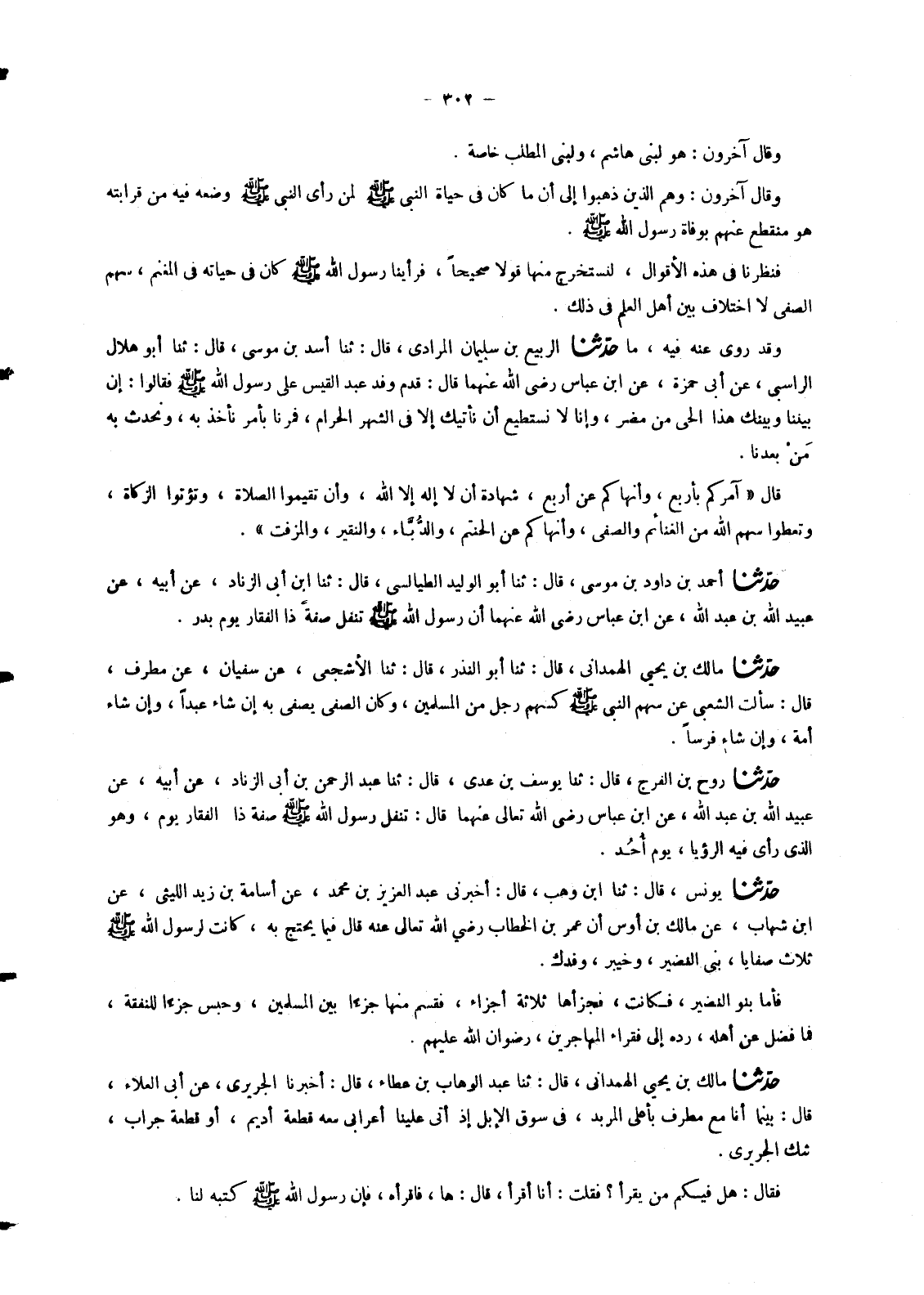 5428 - حَدَّثَنَا يُونُسُ , قَالَ: ثنا ابْنُ وَهْبٍ , قَالَ: أَخْبَرَنِي عَبْدُ الْعَزِيزِ بْنُ مُحَمَّدٍ , عَنْ أُسَامَةَ بْنِ زَيْدٍ اللَّيْثِيِّ , عَنِ ابْنِ شِهَابٍ , عَنْ مَالِكِ بْنِ أَوْسٍ , أَنَّ عُمَرَ بْنَ الْخَطَّابِ رَضِيَ اللهُ تَعَالَى عَنْهُ قَالَ فِيمَا يَحْتَجُّ بِهِ , «§كَانَتْ لِرَسُولِ اللهِ صَلَّى اللَّهُ عَلَيْهِ وَسَلَّمَ ثَلَاثُ صَفَايَا , بَنِي النَّضِيرِ , وَخَيْبَرَ , وَفَدَكَ» فَأَمَّا بَنُو النَّضِيرِ , فَكَانَتْ , فَجَزَّأَهَا ثَلَاثَةَ أَجْزَاءٍ , فَقَسَمَ مِنْهَا جُزْءًا بَيْنَ الْمُسْلِمِينَ , وَحَبَسَ جُزْءًا لِلنَّفَقَةِ , فَمَا فَضَلَ عَنْ أَهْلِهِ , رَدَّهُ إِلَى فُقَرَاءِ الْمُهَاجِرِينَ رِضْوَانُ اللهُ عَلَيْهِمْ "