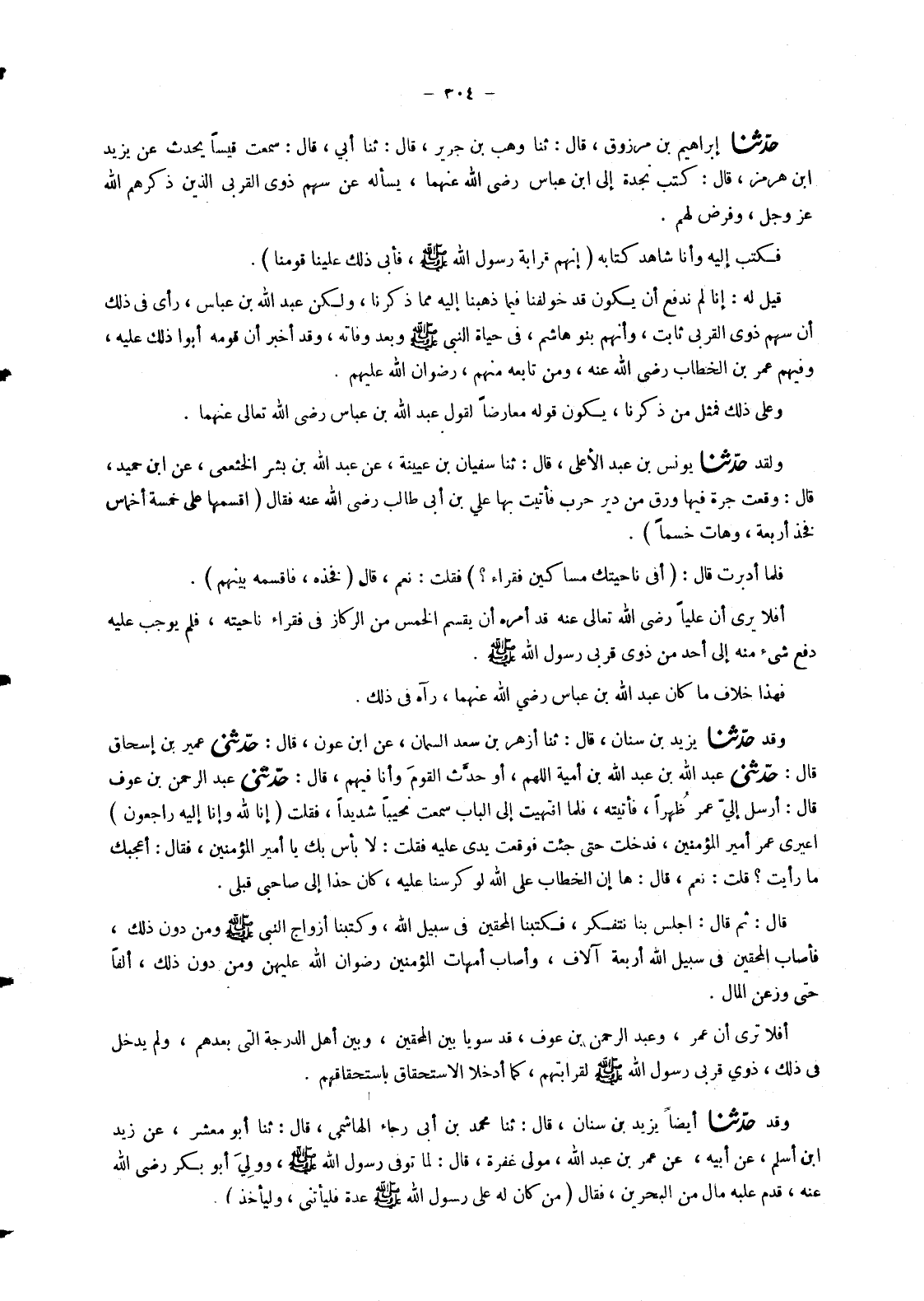 5431 - حَدَّثَنَا إِبْرَاهِيمُ بْنُ مَرْزُوقٍ , قَالَ: ثنا وَهْبُ بْنُ جَرِيرٍ , قَالَ: ثنا أَبِي , قَالَ: سَمِعْتُ قَيْسًا يُحَدِّثُ عَنْ يَزِيدَ بْنِ هُرْمُزَ , قَالَ: كَتَبَ نَجْدَةُ إِلَى ابْنِ عَبَّاسٍ رَضِيَ اللهُ عَنْهُمَا , يَسْأَلُهُ §عَنْ سَهْمِ ذَوِي الْقُرْبَى الَّذِينَ ذَكَرَهُمُ اللهُ عَزَّ وَجَلَّ , وَفَرَضَ لَهُمْ فَكَتَبَ إِلَيْهِ وَأَنَا شَاهِدٌ كِتَابَهُ: إِنَّهُمْ قَرَابَةُ رَسُولِ اللهِ صَلَّى اللَّهُ عَلَيْهِ وَسَلَّمَ , فَأَبَى ذَلِكَ عَلَيْنَا قَوْمُنَا قِيلَ لَهُ: إِنَّا لَمْ نَدْفَعْ أَنْ يَكُونَ قَدْ خُولِفْنَا فِيمَا ذَهَبْنَا إِلَيْهِ مِمَّا ذَكَرْنَا , وَلَكِنَّ عَبْدَ اللهِ بْنَ عَبَّاسٍ , رَأَى فِي ذَلِكَ أَنَّ سَهْمَ ذَوِي الْقُرْبَى ثَابِتٌ , وَأَنَّهُمْ بَنُو هَاشِمٍ , فِي حَيَاةِ النَّبِيِّ صَلَّى اللَّهُ عَلَيْهِ وَسَلَّمَ وَبَعْدَ وَفَاتِهِ , وَقَدْ أَخْبَرَ أَنَّ قَوْمَهُ أَبَوْا ذَلِكَ عَلَيْهِ , وَفِيهِمْ عُمَرُ بْنُ الْخَطَّابِ رَضِيَ اللهُ عَنْهُ , وَمَنْ تَابَعَهُ مِنْهُمْ رِضْوَانُ اللهُ عَلَيْهِمْ , وَعَلَى ذَلِكَ فَمِثْلُ مَنْ ذَكَرْنَا , يَكُونُ قَوْلُهُ مُعَارِضًا لِقَوْلِ عَبْدِ اللهِ بْنِ عَبَّاسٍ رَضِيَ اللهُ تَعَالَى عَنْهُمَا , وَلَقَدْ