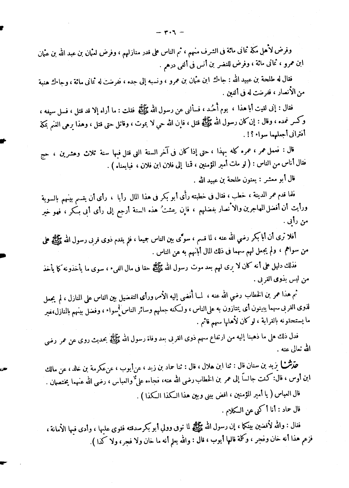 5435 - حَدَّثَنَا يَزِيدُ بْنُ سِنَانٍ قَالَ: ثنا ابْنُ هِلَالٍ , قَالَ: ثنا حَمَّادُ بْنُ زَيْدٍ , عَنْ أَيُّوبَ , عَنْ عِكْرِمَةَ بْنِ خَالِدٍ , عَنْ مَالِكِ بْنِ أَوْسٍ , قَالَ: كُنْتُ جَالِسًا إِلَى عُمَرَ بْنِ الْخَطَّابِ رَضِيَ اللهُ عَنْهُ , فَجَاءَهُ عَلِيٌّ وَالْعَبَّاسُ رَضِيَ اللهُ عَنْهُمَا يَخْتَصِمَانِ , قَالَ الْعَبَّاسُ: يَا أَمِيرَ الْمُؤْمِنِينَ , اقْضِ بَيْنِي وَبَيْنَ هَذَا الْكَذَا الْكَذَا. قَالَ حَمَّادٌ: أَنَا أُكَنِّي عَنِ الْكَلَامِ , فَقَالَ: §وَاللهِ لَأَقْضِيَنَّ بَيْنَكُمَا , إِنَّ رَسُولَ اللهِ صَلَّى اللَّهُ عَلَيْهِ وَسَلَّمَ لَمَّا تُوُفِّيَ وَوَلِيَ أَبُو بَكْرٍ صَدَقَتَهُ فَقَوِيَ عَلَيْهَا , وَأَدَّى فِيهَا الْأَمَانَةَ , فَزَعَمَ هَذَا أَنَّهُ خَانَ وَفَجَرَ , وَكَلِمَةً قَالَهَا أَيُّوبُ , قَالَ: وَاللهُ يَعْلَمُ أَنَّهُ مَا خَانَ وَلَا فَجَرَ وَلَا كَذَا -[307]- قَالَ حَمَّادٌ