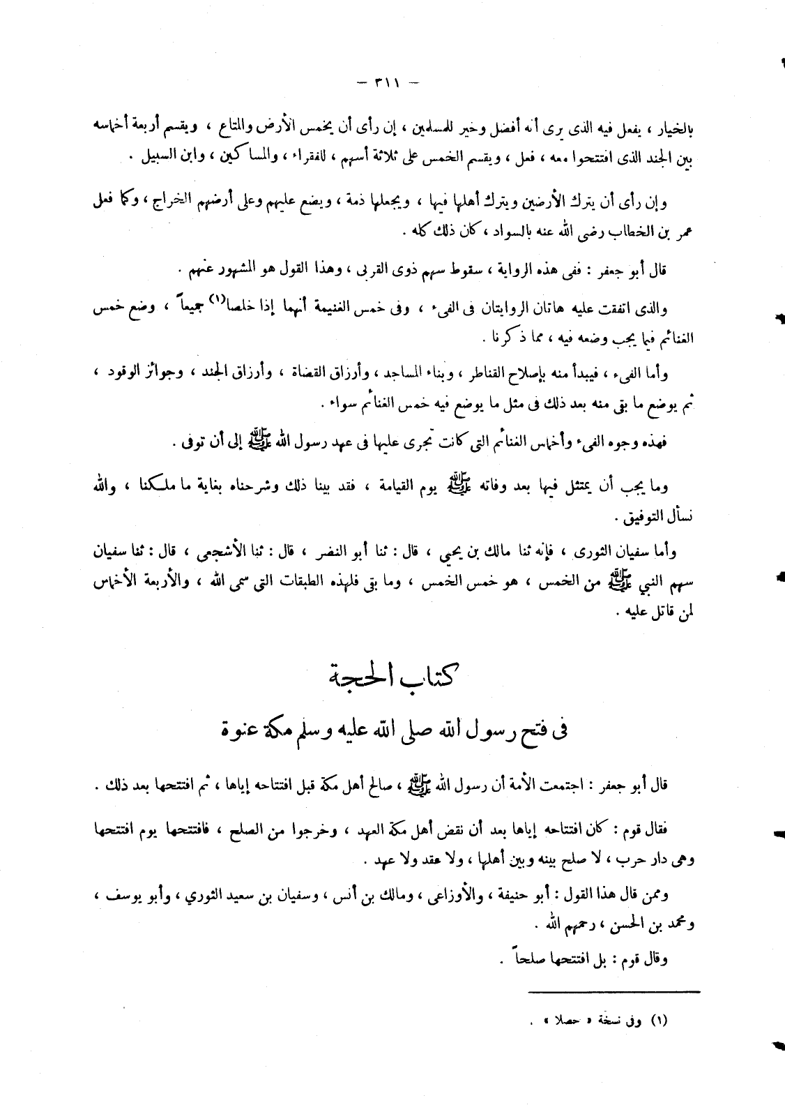 §كِتَابُ الْحُجَّةِ فِي فَتْحِ رَسُولِ اللهِ صَلَّى اللَّهُ عَلَيْهِ وَسَلَّمَ مَكَّةَ عَنْوَةً قَالَ أَبُو جَعْفَرٍ: اجْتَمَعَتِ الْأُمَّةُ أَنَّ رَسُولَ اللهِ صَلَّى اللَّهُ عَلَيْهِ وَسَلَّمَ , صَالَحَ أَهْلَ مَكَّةِ قَبْلَ افْتِتَاحِهِ إِيَّاهَا , ثُمَّ افْتَتَحَهَا بَعْدَ ذَلِكَ , فَقَالَ قَوْمٌ: كَانَ افْتِتَاحُهُ إِيَّاهَا بَعْدَ أَنْ نَقَضَ أَهْلُ مَكَّةَ الْعَهْدَ وَخَرَجُوا مِنَ الصُّلْحِ , فَافْتَتَحَهَا يَوْمَ افْتَتَحَهَا وَهِيَ دَارُ حَرْبٍ , لَا صُلْحَ بَيْنَهُ وَبَيْنَ أَهْلِهَا , وَلَا عَقْدَ وَلَا عَهْدَ , وَمِمَّنْ قَالَ هَذَا الْقَوْلَ: أَبُو حَنِيفَةَ , وَالْأَوْزَاعِيُّ , وَمَالِكُ بْنُ أَنَسٍ , وَسُفْيَانُ بْنُ سَعِيدٍ الثَّوْرِيُّ , وَأَبُو يُوسُفَ , وَمُحَمَّدُ بْنُ الْحَسَنِ رَحِمَهُمُ اللهُ، وَقَالَ قَوْمٌ: بَلِ افْتَتَحَهَا صُلْحًا ,