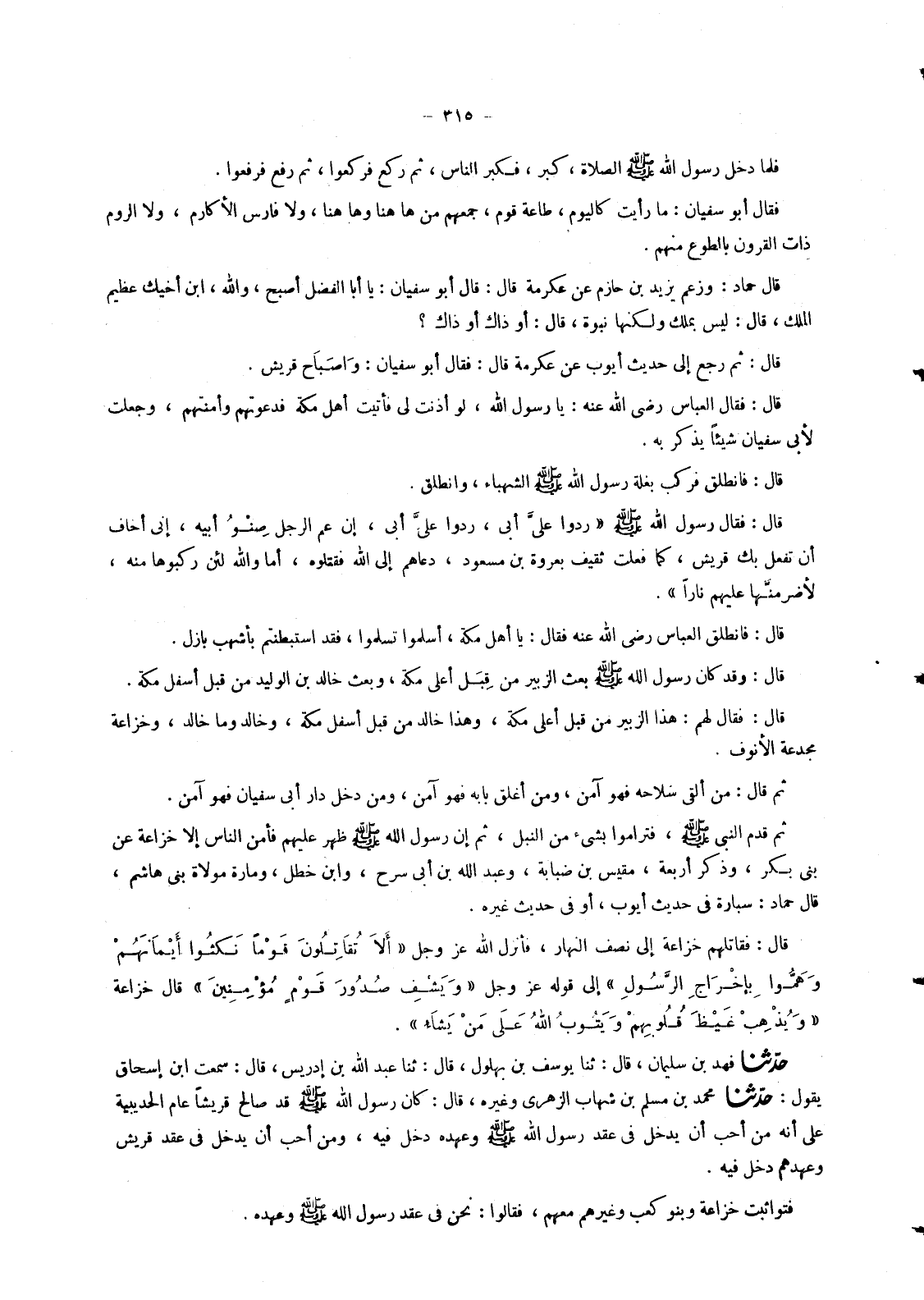 قَالَ رَسُولُ اللهِ صَلَّى اللَّهُ عَلَيْهِ وَسَلَّمَ §قَدْ نَصَرْتُ بَنِي كَعْبٍ , ثُمَّ خَرَجَ بُدَيْلُ بْنُ وَرْقَاءَ فِي نَفَرٍ مِنْ خُزَاعَةَ حَتَّى قَدِمُوا عَلَى رَسُولِ اللهِ صَلَّى اللَّهُ عَلَيْهِ وَسَلَّمَ بِالْمَدِينَةِ فَأَخْبَرُوهُ بِمَا أُصِيبَ مِنْهُمْ وَقَدْ رَجَعُوا , -[317]- وَقَدْ قَالَ رَسُولُ اللهِ صَلَّى اللَّهُ عَلَيْهِ وَسَلَّمَ: كَأَنَّكُمْ بِأَبِي سُفْيَانَ قَدْ قَدِمَ لِيَزِيدَ فِي الْعَهْدِ , وَيَزِيدَ فِي الْمُدَّةِ " , ثُمَّ ذَكَرَ نَحْوًا مِمَّا فِي حَدِيثِ أَيُّوبَ عَنْ عِكْرِمَةَ فِي طَلَبِ أَبِي سُفْيَانَ الْجَوَابَ مِنْ أَبِي بَكْرٍ , وَمِنْ عُمَرَ , وَمِنْ عَلِيٍّ , وَمِنْ فَاطِمَةَ رِضْوَانُ اللهُ عَلَيْهِمْ أَجْمَعِينَ , وَجَوَابِ كُلِّ وَاحِدٍ مِنْهُمْ لَهُ بِمَا أَجَابَهُ فِي ذَلِكَ , عَلَى مَا فِي حَدِيثِ أَيُّوبَ , عَنْ عِكْرِمَةَ , وَلَمْ يَذْكُرْ خَبَرَ أَبِي سُفْيَانَ مَعَ الْعَبَّاسِ رَضِيَ اللهُ عَنْهُ , وَلَا أَمَانَ الْعَبَّاسِ إِيَّاهُ وَلَا إِسْلَامَهُ , وَلَا بَقِيَّةَ الْحَدِيثِ قَالَ أَبُو جَعْفَرٍ: فِي هَذَيْنِ الْحَدِيثَيْنِ أَنَّ الصُّلْحَ الَّذِي كَانَ بَيْنَ رَسُولِ اللهِ صَلَّى اللَّهُ عَلَيْهِ وَسَلَّمَ وَبَيْنَ أَهْلِ مَكَّةَ , دَخَلَتْ خُزَاعَةُ فِي صُلْحِ رَسُولِ اللهِ صَلَّى اللَّهُ عَلَيْهِ وَسَلَّمَ لِلْحِلْفِ الَّذِي كَانَ بَيْنَهُمْ وَبَيْنَهُ , وَدَخَلَتْ بَنُو بَكْرٍ فِي صُلْحِ قُرَيْشٍ , لِلْحِلْفِ الَّذِي كَانَ بَيْنَهُمْ وَبَيْنَهُ , فَصَارَ حُكْمُ حُلَفَاءِ كُلِّ فَرِيقٍ مِنْ رَسُولِ اللهِ صَلَّى اللَّهُ عَلَيْهِ وَسَلَّمَ وَمِنْ قُرَيْشٍ فِي الصُّلْحِ , كَحُكْمِ رَسُولِ اللهِ صَلَّى اللَّهُ عَلَيْهِ وَسَلَّمَ وَحُكْمِ قُرَيْشٍ , وَكَانَ بَيْنَ حُلَفَاءِ رَسُولِ اللهِ صَلَّى اللَّهُ عَلَيْهِ وَسَلَّمَ وَبَيْنَ حُلَفَاءِ قُرَيْشٍ مِنَ الْقِتَالِ , مَا كَانَ , فَكَانَ ذَلِكَ نَقْضًا مِنْ حُلَفَاءِ قُرَيْشٍ لِلصُّلْحِ الَّذِي كَانُوا دَخَلُوا فِيهِ , وَخُرُوجًا مِنْهُمْ بِذَلِكَ مِنْهُ , فَصَارُوا بِذَلِكَ , حَرْبًا لِرَسُولِ اللهِ صَلَّى اللَّهُ عَلَيْهِ وَسَلَّمَ وَأَصْحَابِهِ رَضِيَ اللهُ عَنْهُمْ , ثُمَّ أَمَدَّتْ قُرَيْشٌ حُلَفَاءَهَا هَؤُلَاءِ بِمَا قَوَّوْهُمْ بِهِ عَلَى قِتَالِ خُزَاعَةَ , حَتَّى قُتِلَ مِنْهُمْ مَنْ قُتِلَ وَقَدْ كَانَ الصُّلْحُ مَنَعَهُمْ مِنْ ذَلِكَ , فَكَانَ فِيمَا فَعَلُوا مِنْ ذَلِكَ , نَقْضًا لِلْعَهْدِ , وَخُرُوجًا مِنَ الصُّلْحِ , فَصَارَتْ قُرَيْشٌ بِذَلِكَ , حَرْبًا لِرَسُولِ اللهِ صَلَّى اللَّهُ عَلَيْهِ وَسَلَّمَ وَلِأَصْحَابِهِ , فَقَالَ الْآخَرُونَ: وَكَيْفَ يَكُونُ بِمَا ذَكَرْتُمْ كَمَا وَصَفْتُمْ , وَقَدْ رَوَيْتُمْ أَنَّ أَبَا سُفْيَانَ وَفَدَ عَلَى رَسُولِ اللهِ صَلَّى اللَّهُ عَلَيْهِ وَسَلَّمَ الْمَدِينَةَ بَعْدَ أَنْ كَانَ بَيْنَ بَنِي بَكْرٍ وَبَيْنَ خُزَاعَةَ مِنَ الْقِتَالِ مَا كَانَ , وَبَعْدَ أَنْ كَانَ مِنْ قُرَيْشٍ لِبَنِي بَكْرٍ مِنَ الْمَعُونَةِ لَهُمْ مَا كَانَ عَلِمَ رَسُولُ اللهِ صَلَّى اللَّهُ عَلَيْهِ وَسَلَّمَ بِمَوْضِعِهِ , فَلَمْ يَصِلْهُ وَلَمْ يَعْرِضْ لَهُ , فَدَلَّ ذَلِكَ عَلَى أَنَّهُ كَانَ عِنْدَهُ فِي أَمَانِهِ عَلَى حَالِهِ , غَيْرَ خَارِجٍ مِنْهُ مِمَّا كَانَ مِنْ بَنِي بَكْرٍ فِي قِتَالِ خُزَاعَةَ , وَمَا كَانَ مِنْ قُرَيْشٍ فِي مَعُونَةِ بَنِي بَكْرٍ بِمَا أَعَانُوهُمْ بِهِ مِنَ الطَّعَامِ وَالسِّلَاحِ وَالتَّظْلِيلِ , غَيْرِ نَاقِضٍ لِأَمَانِهِ بِصُلْحِهِ الَّذِي كَانَ بَيْنَهُ وَبَيْنَ رَسُولِ اللهِ صَلَّى اللَّهُ عَلَيْهِ وَسَلَّمَ وَغَيْرَ مُخْرِجٍ لَهُ مِنْهُ , فَكَانَ مِنَ الْحُجَّةِ عَلَيْهِمْ لِلْآخَرِينَ أَنَّ تَرْكَ رَسُولِ اللهِ 
