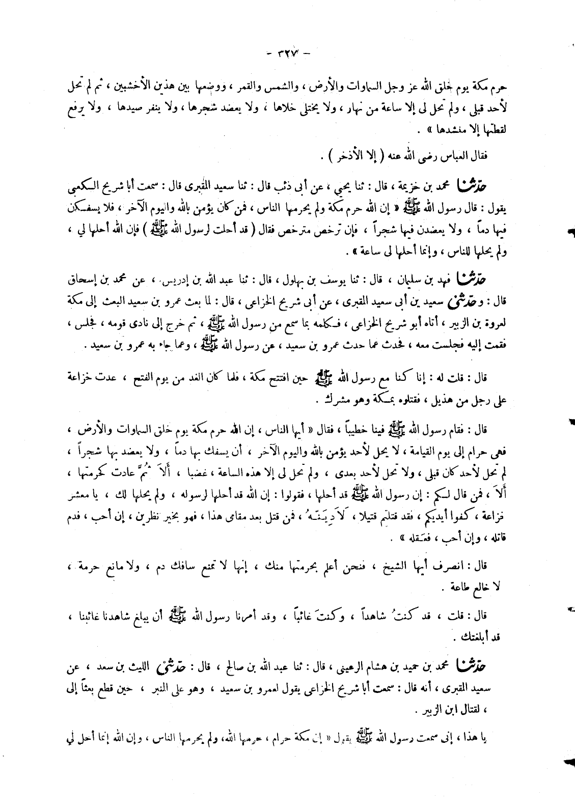 5459 - حَدَّثَنَا فَهْدُ بْنُ سُلَيْمَانَ , قَالَ: ثنا يُوسُفُ بْنُ بُهْلُولٍ , قَالَ: ثنا عَبْدُ اللهِ بْنُ إِدْرِيسَ , عَنْ مُحَمَّدِ بْنِ إِسْحَاقَ , قَالَ: وَحَدَّثَنِي سَعِيدُ بْنُ أَبِي سَعِيدٍ الْمَقْبُرِيُّ , عَنْ أَبِي شُرَيْحٍ الْخُزَاعِيِّ , قَالَ: لَمَّا بَعَثَ عَمْرُو بْنُ سَعِيدٍ الْبَعْثَ إِلَى مَكَّةَ لِغَزْوِ ابْنِ الزُّبَيْرِ أَتَاهُ أَبُو شُرَيْحٍ الْخُزَاعِيُّ فَكَلَّمَهُ بِمَا سَمِعَ مِنْ رَسُولِ اللهِ صَلَّى اللَّهُ عَلَيْهِ وَسَلَّمَ ثُمَّ خَرَجَ إِلَى نَادِي قَوْمِهِ فَجَلَسَ فَقُمْتُ إِلَيْهِ فَجَلَسْتُ مَعَهُ فَحَدَّثَ عَمَّا حَدَّثَ عَمْرُو بْنُ سَعِيدٍ عَنْ رَسُولِ اللهِ صَلَّى اللَّهُ عَلَيْهِ وَسَلَّمَ وَعَمَّا جَاءَ بِهِ عَمْرُو بْنُ سَعِيدٍ , قَالَ: قُلْتُ لَهُ: " إِنَّا كُنَّا مَعَ رَسُولِ اللهِ صَلَّى اللَّهُ عَلَيْهِ وَسَلَّمَ حِينَ افْتَتَحَ مَكَّةَ فَلَمَّا كَانَ الْغَدُ مِنْ يَوْمِ الْفَتْحِ عَدَتْ خُزَاعَةُ عَلَى رَجُلٍ مِنْ هُذَيْلٍ فَقَتَلُوهُ بِمَكَّةَ وَهُوَ مُشْرِكٌ , قَالَ: فَقَامَ رَسُولُ اللهِ صَلَّى اللَّهُ عَلَيْهِ وَسَلَّمَ فِينَا خَطِيبًا فَقَالَ: " أَيُّهَا النَّاسُ إِنَّ §اللهَ حَرَّمَ مَكَّةَ يَوْمَ خَلَقَ السَّمَاوَاتِ , وَالْأَرْضَ فَهِيَ حَرَامٌ إِلَى يَوْمِ الْقِيَامَةِ لَا يَحِلُّ لِأَحَدٍ يُؤْمِنُ بِاللهِ , وَالْيَوْمِ الْآخِرِ أَنْ يَسْفِكَ بِهَا دَمًا وَلَا يَعْضِدَ بِهَا شَجَرًا لَمْ تَحِلَّ لِأَحَدٍ كَانَ قَبْلِي وَلَا تَحِلُّ لِأَحَدٍ بَعْدِي وَلَمْ تَحِلَّ لِي إِلَّا هَذِهِ السَّاعَةَ غَضَبًا أَلَا ثُمَّ عَادَتْ كَحُرْمَتِهَا أَلَا فَمَنْ قَالَ لَكُمْ: إِنَّ رَسُولَ اللهِ صَلَّى اللَّهُ عَلَيْهِ وَسَلَّمَ قَدْ أَحَلَّهَا فَقُولُوا: إِنَّ اللهَ قَدْ أَحَلَّهَا لِرَسُولِهِ وَلَمْ يُحِلَّهَا لَكَ , يَا مَعْشَرَ خُزَاعَةَ كُفُّوا أَيْدِيَكُمْ فَقَدْ قَتَلْتُمْ قَتِيلًا لَأَدِيَنَّهُ فَمَنْ قُتِلَ بَعْدَ مَقَامِي هَذَا فَهُوَ بِخَيْرِ نَظَرَيْنِ إِنْ أَحَبَّ فَدَمُ قَاتِلِهِ وَإِنْ أَحَبَّ فَعَقْلُهُ " قَالَ: انْصَرِفْ أَيُّهَا الشَّيْخُ فَنَحْنُ أَعْلَمُ بِحُرْمَتِهَا مِنْكَ إِنَّهَا لَا تَمْنَعُ سَافِكَ دَمٍ وَلَا مَانِعَ حُرْمَةٍ لَا خَالِعَ طَاعَةٍ , قَالَ: قُلْتُ قَدْ كُنْتُ شَاهِدًا وَكُنْتَ غَائِبًا وَقَدْ أَمَرَنَا رَسُولُ اللهِ صَلَّى اللَّهُ عَلَيْهِ وَسَلَّمَ أَنْ يُبَلِّغَ شَاهِدُنَا غَائِبَنَا قَدْ أَبْلَغْتُكَ
