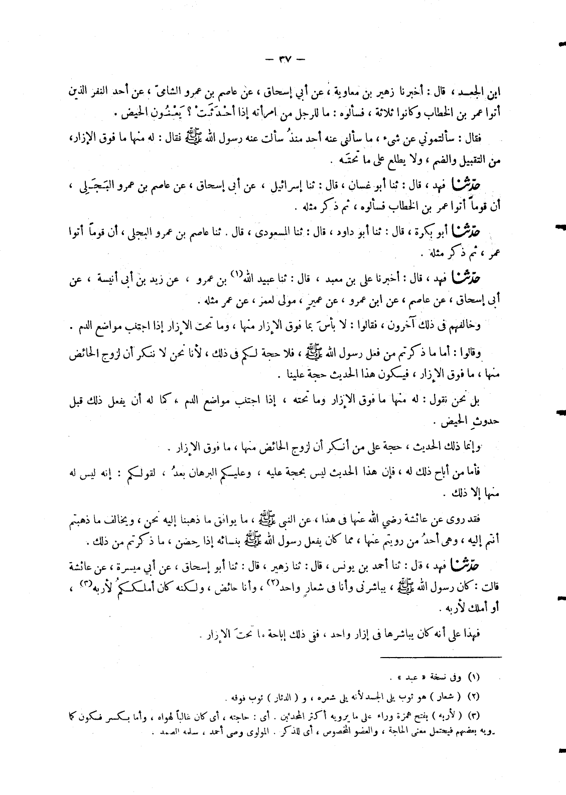 4381 - حَدَّثَنَا فَهْدٌ قَالَ: ثنا أَحْمَدُ بْنُ يُونُسَ قَالَ: ثنا زُهَيْرُ قَالَ: ثنا أَبُو إِسْحَاقَ , عَنْ أَبِي مَيْسَرَةَ , عَنْ عَائِشَةَ , قَالَتْ: «كَانَ رَسُولُ اللهِ صَلَّى اللَّهُ عَلَيْهِ وَسَلَّمَ , §يُبَاشِرُنِي وَأَنَا فِي شِعَارٍ وَاحِدٍ , وَأَنَا حَائِضٌ , وَلَكِنَّهُ كَانَ أَمْلَكَكُمْ لِأَرَبِهِ , أَوْ أَمْلَكَ لِأَرَبِهِ» فَهَذَا عَلَى أَنَّهُ كَانَ يُبَاشِرُهَا فِي إِزَارٍ وَاحِدٍ , فَفِي ذَلِكَ إِبَاحَةُ مَا تَحْتَ الْإِزَارِ. -[38]- فَلَمَّا جَاءَ هَذَا عَنْهَا , وَقَدْ جَاءَ عَنْهَا أَنَّهُ كَانَ يَأْمُرُهَا أَنْ تَتَّزِرَ ثُمَّ يُبَاشِرُهَا , كَانَ هَذَا - عِنْدَنَا - عَلَى أَنَّهُ كَانَ يَفْعَلُ هَكَذَا مَرَّةً , وَهَكَذَا مَرَّةً , وَفِي ذَلِكَ إِبَاحَةُ الْمَعْنَيَيْنِ جَمِيعًا. وَقَدْ رُوِيَ عَنْ رَسُولِ اللهِ صَلَّى اللَّهُ عَلَيْهِ وَسَلَّمَ مِنْ غَيْرِ هَذَا الْوَجْهِ , مَا يُوَافِقُ هَذَا الْقَوْلَ الَّذِي صَحَّحْنَا عَلَيْهِ حَدِيثَيْ عَائِشَةَ رَضِيَ اللهُ عَنْهَا , لِلَّذِينَ ذَكَرْنَا