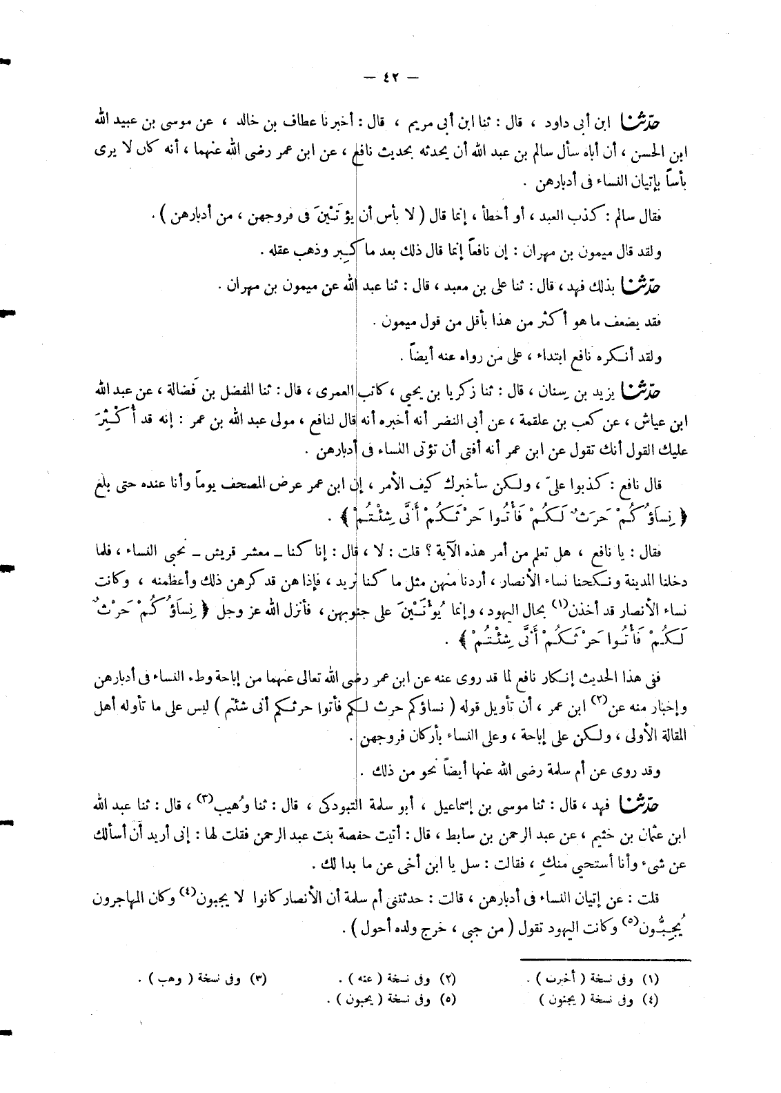 4397 - حَدَّثَنَا ابْنُ أَبِي دَاوُدَ قَالَ: ثنا ابْنُ أَبِي مَرْيَمَ قَالَ: أَخْبَرَنَا عَطَّافُ بْنُ خَالِدٍ , عَنْ مُوسَى بْنِ عُبَيْدِ اللهِ بْنِ الْحَسَنِ , أَنَّ أَبَاهُ سَأَلَ سَالِمَ بْنَ عَبْدِ اللهِ أَنْ يُحَدِّثَهُ بِحَدِيثِ نَافِعٍ , عَنِ ابْنِ عُمَرَ رَضِيَ اللهُ عَنْهُمَا , أَنَّهُ كَانَ لَا يَرَى بَأْسًا بِإِتْيَانِ النِّسَاءِ فِي أَدْبَارِهِنَّ. فَقَالَ سَالِمٌ: كَذَبَ الْعَبْدُ , أَوْ أَخْطَأَ , إِنَّمَا قَالَ «§لَا بَأْسَ أَنْ يُؤْتَيْنَ فِي فُرُوجِهِنَّ مِنْ أَدْبَارِهِنَّ» وَلَقَدْ قَالَ مَيْمُونُ بْنُ مِهْرَانَ: إِنَّ نَافِعًا إِنَّمَا قَالَ ذَلِكَ بَعْدَ مَا كَبِرَ وَذَهَبَ عَقْلُهُ