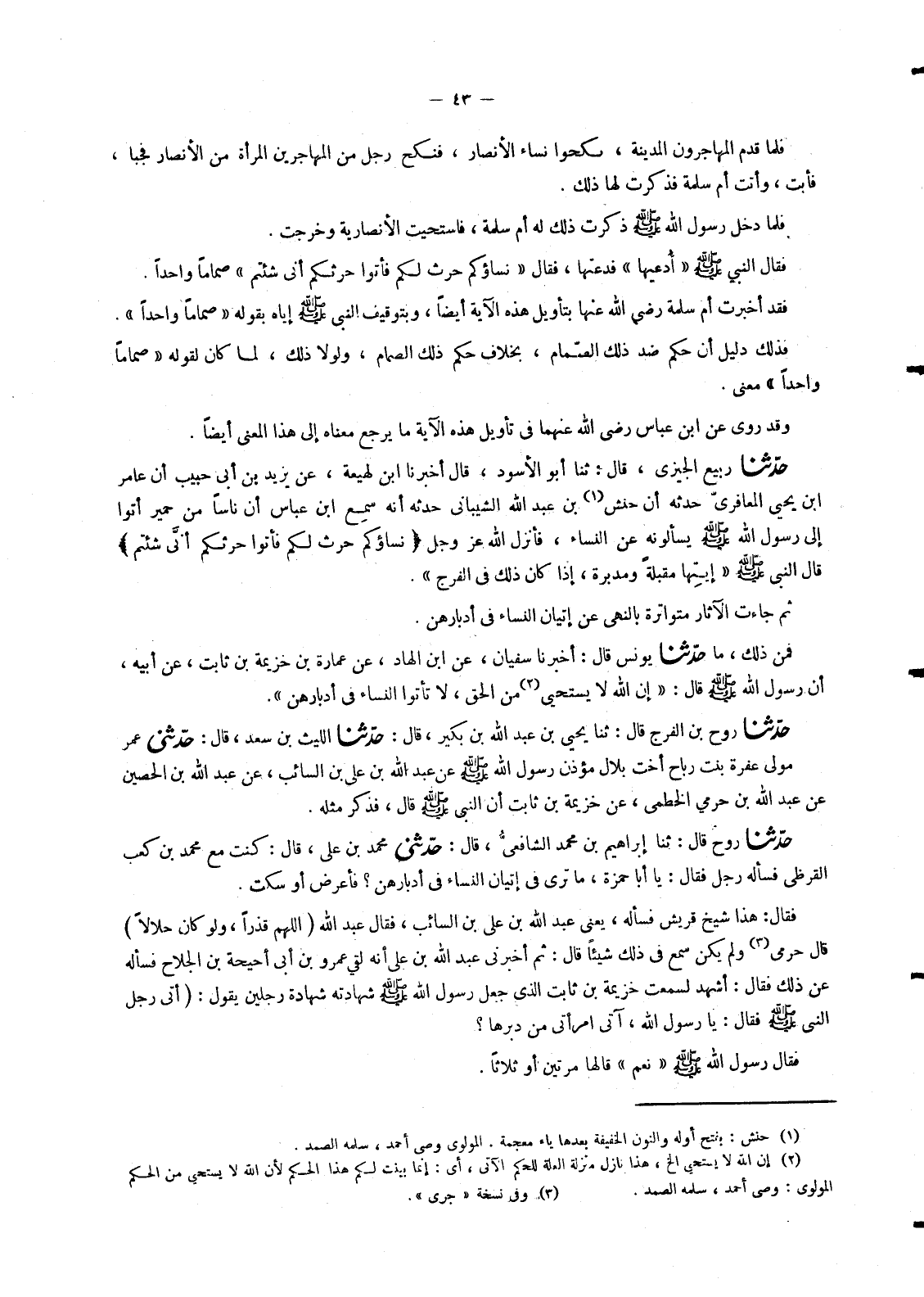 4404 - حَدَّثَنَا رَوْحٌ قَالَ: ثنا إِبْرَاهِيمُ بْنُ مُحَمَّدٍ الشَّافِعِيُّ قَالَ: حَدَّثَنِي مُحَمَّدُ بْنُ عَلِيٍّ قَالَ: كُنْتُ مَعَ مُحَمَّدِ بْنِ كَعْبٍ الْقُرَظِيِّ فَسَأَلَهُ رَجُلٌ فَقَالَ: يَا أَبَا حَمْزَةَ , مَا تَرَى فِي إِتْيَانِ النِّسَاءِ فِي أَدْبَارِهِنَّ؟ فَأَعْرَضَ أَوْ سَكَتَ. فَقَالَ: هَذَا شَيْخُ قُرَيْشٍ فَسَأَلَهُ , يَعْنِي عَبْدَ اللهِ بْنَ عَلِيِّ بْنِ السَّائِبِ , فَقَالَ عَبْدُ اللهِ: اللهُمَّ قَذِرًا , وَلَوْ كَانَ حَلَالًا. قَالَ حَرَمِيٌّ وَلَمْ يَكُنْ سَمِعَ فِي ذَلِكَ شَيْئًا قَالَ: ثُمَّ أَخْبَرَنِي عَبْدُ اللهِ بْنُ عَلِيٍّ أَنَّهُ لَقِيَ عَمْرَو بْنَ أَبِي أُحَيْحَةَ بْنِ الْجِلَاحِ فَسَأَلَهُ عَنْ ذَلِكَ فَقَالَ: أَشْهَدُ لَسَمِعْتُ خُزَيْمَةَ بْنَ ثَابِتٍ الَّذِي جَعَلَ رَسُولُ اللهِ صَلَّى اللَّهُ عَلَيْهِ وَسَلَّمَ شَهَادَتَهُ شَهَادَةَ رَجُلَيْنِ يَقُولُ: أَتَى رَجُلٌ النَّبِيَّ صَلَّى اللَّهُ عَلَيْهِ وَسَلَّمَ فَقَالَ: يَا رَسُولَ اللهِ , آتِي امْرَأَتِي مِنْ دُبُرِهَا؟ فَقَالَ رَسُولُ اللهِ صَلَّى اللَّهُ عَلَيْهِ وَسَلَّمَ: «نَعَمْ» قَالَهَا مَرَّتَيْنِ أَوْ ثَلَاثًا. -[44]- قَالَ: ثُمَّ فَطِنَ رَسُولُ اللهِ صَلَّى اللَّهُ عَلَيْهِ وَسَلَّمَ فَقَالَ: «فِي أَيِّ الْخَرْطَتَيْنِ أَوْ فِي أَيِّ الْخَرْزَتَيْنِ؟ أَمَّا مِنْ دُبُرِهَا فِي قُبُلِهَا فَنَعَمْ , وَأَمَّا فِي دُبُرِهَا فَإِنَّ اللهَ تَعَالَى §نَهَاكُمْ أَنْ تَأْتُوا النِّسَاءَ فِي أَدْبَارِهِنَّ»