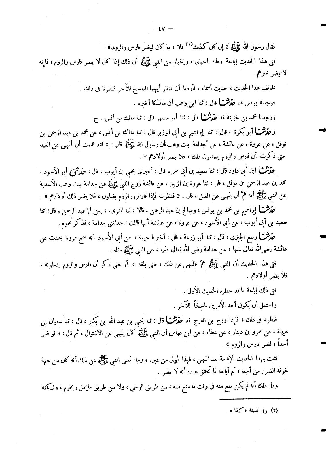 4431 - وَحَدَّثَنَا أَبُو بَكْرَةَ قَالَ: ثنا إِبْرَاهِيمُ بْنُ أَبِي الْوَزِيرِ قَالَ: ثنا مَالِكُ بْنُ أَنَسٍ , عَنْ مُحَمَّدِ بْنِ عَبْدِ الرَّحْمَنِ بْنِ نَوْفَلٍ , عَنْ عُرْوَةَ , عَنْ عَائِشَةَ , عَنْ جُدَامَةَ بِنْتِ وَهْبٍ أَنَّ رَسُولَ اللهِ صَلَّى اللَّهُ عَلَيْهِ وَسَلَّمَ قَالَ: «§لَقَدْ هَمَمْتُ أَنْ أَنْهَى عَنِ الْغِيلَةِ حَتَّى ذَكَرْتُ أَنَّ فَارِسَ وَالرُّومَ يَصْنَعُونَ ذَلِكَ , فَلَا يَضُرُّ أَوْلَادَهُمْ»