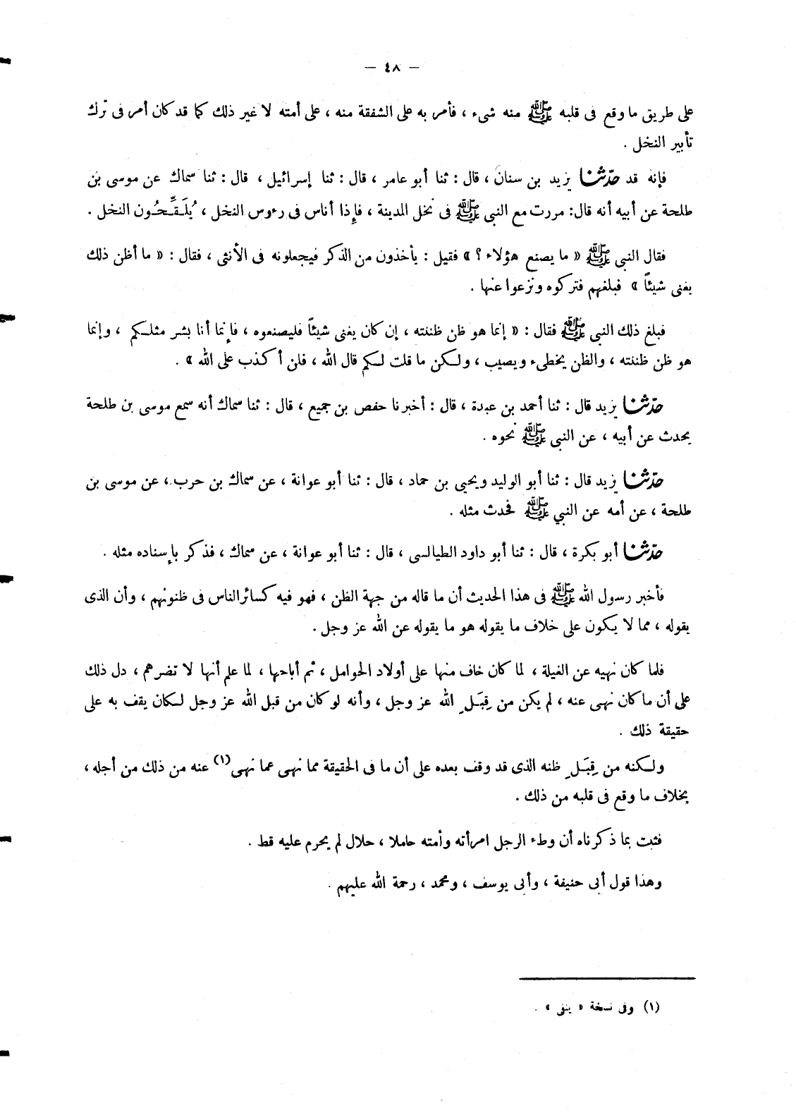 4436 - حَدَّثَنَا يَزِيدُ بْنُ سِنَانٍ قَالَ: ثنا أَبُو عَامِرٍ قَالَ: ثنا إِسْرَائِيلُ قَالَ: ثنا سِمَاكٌ عَنْ مُوسَى بْنِ طَلْحَةَ عَنْ أَبِيهِ أَنَّهُ قَالَ: مَرَرْتُ مَعَ النَّبِيِّ صَلَّى اللَّهُ عَلَيْهِ وَسَلَّمَ فِي نَخْلِ الْمَدِينَةِ , فَإِذَا أُنَاسٌ فِي رُءُوسِ النَّخْلِ , يُلَقِّحُونَ النَّخْلَ. فَقَالَ النَّبِيُّ صَلَّى اللَّهُ عَلَيْهِ وَسَلَّمَ: «مَا يَصْنَعُ هَؤُلَاءِ؟» فَقِيلَ: يَأْخُذُونَ مِنَ الذَّكَرِ فَيَجْعَلُونَهُ فِي الْأُنْثَى , فَقَالَ: «مَا أَظُنُّ ذَلِكَ يُغْنِي شَيْئًا» فَبَلَغَهُمْ فَتَرَكُوهُ وَنَزَعُوا عَنْهَا. فَبَلَغَ ذَلِكَ النَّبِيَّ صَلَّى اللَّهُ عَلَيْهِ وَسَلَّمَ فَقَالَ: «إِنَّمَا §هُوَ ظَنٌّ ظَنَنْتُهُ , إِنْ كَانَ يُغْنِي شَيْئًا فَلْيَصْنَعُوهُ , فَإِنَّمَا أَنَا بَشَرٌ مِثْلُكُمْ , وَإِنَّمَا هُوَ ظَنٌّ ظَنَنْتُهُ , وَالظَّنُّ يُخْطِئُ وَيُصِيبُ , وَلَكِنْ مَا قُلْتُ لَكُمْ قَالَ اللهُ , فَلَنْ أَكْذِبَ عَلَى اللهِ