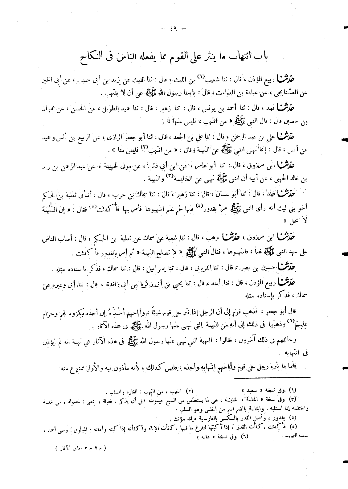 4447 - حَدَّثَنَا رَبِيعٌ الْمُؤَذِّنُ قَالَ: ثنا أَسَدٌ قَالَ: ثنا يَحْيَى بْنُ زَكَرِيَّا بْنِ أَبِي زَائِدَةَ قَالَ: ثنا أَبِي وَغَيْرُهُ , عَنْ سِمَاكٍ , فَذَكَرَ بِإِسْنَادِهِ مِثْلَهُ. قَالَ أَبُو جَعْفَرٍ: فَذَهَبَ قَوْمٌ إِلَى أَنَّ الرَّجُلَ إِذَا نَثَرَ عَلَى قَوْمٍ شَيْئًا وَأَبَاحَهُمْ أَخْذَهُ أَنَّ أَخْذَهُ مَكْرُوهٌ لَهُمْ وَحَرَامٌ عَلَيْهِمْ وَذَهَبُوا فِي ذَلِكَ إِلَى أَنَّهُ مِنَ النُّهْبَةِ الَّتِي نَهَى عَنْهَا رَسُولُ اللهِ صَلَّى اللَّهُ عَلَيْهِ وَسَلَّمَ فِي هَذِهِ الْآثَارِ. وَخَالَفَهُمْ فِي ذَلِكَ آخَرُونَ , فَقَالُوا: النُّهْبَةُ الَّتِي نَهَى عَنْهَا رَسُولُ اللهِ صَلَّى اللَّهُ عَلَيْهِ وَسَلَّمَ فِي هَذِهِ الْآثَارِ هِيَ نُهْبَةُ مَا لَمْ يُؤْذَنْ فِي انْتِهَابِهِ. فَأَمَّا مَا نَثَرَهُ رَجُلٌ عَلَى قَوْمٍ وَأَبَاحَهُمُ انْتِهَابَهُ وَأَخْذَهُ , فَلَيْسَ كَذَلِكَ , لِأَنَّهُ مَأْذُونٌ فِيهِ وَالْأَوَّلَ مَمْنُوعٌ مِنْهُ. -[50]- وَقَدْ وَجَدْنَا مِثْلَ ذَلِكَ , قَدْ أَبَاحَهُ رَسُولُ اللهِ صَلَّى اللَّهُ عَلَيْهِ وَسَلَّمَ