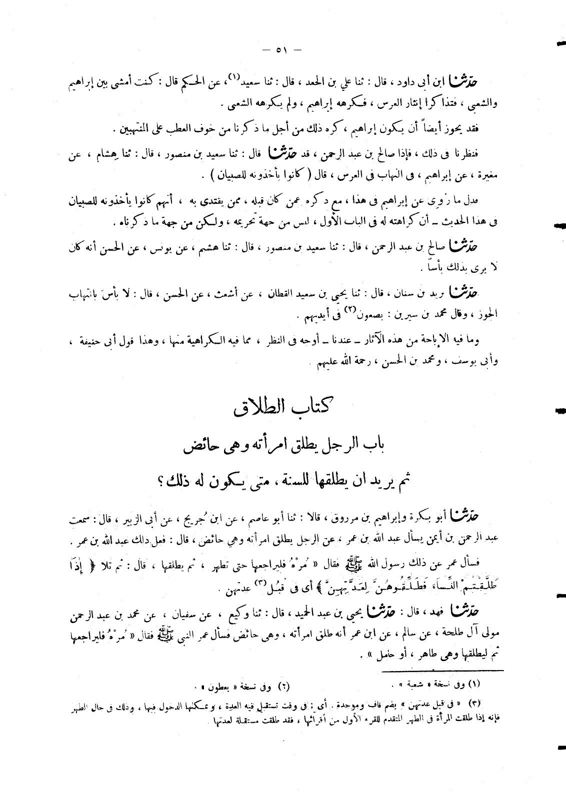 4458 - حَدَّثَنَا فَهْدٌ قَالَ: حَدَّثَنَا يَحْيَى بْنُ عَبْدِ الْحَمِيدِ قَالَ: ثنا وَكِيعٌ , عَنْ سُفْيَانَ , عَنْ مُحَمَّدِ بْنِ عَبْدِ الرَّحْمَنِ , مَوْلَى آلِ طَلْحَةَ , عَنْ سَالِمٍ , عَنِ ابْنِ عُمَرَ , أَنَّهُ طَلَّقَ امْرَأَتَهُ , وَهِيَ حَائِضٌ فَسَأَلَ عُمَرُ النَّبِيَّ صَلَّى اللَّهُ عَلَيْهِ وَسَلَّمَ فَقَالَ: «§مُرْهُ فَلْيُرَاجِعْهَا ثُمَّ لِيُطَلِّقْهَا وَهِيَ طَاهِرٌ , أَوْ حَامِلٌ»