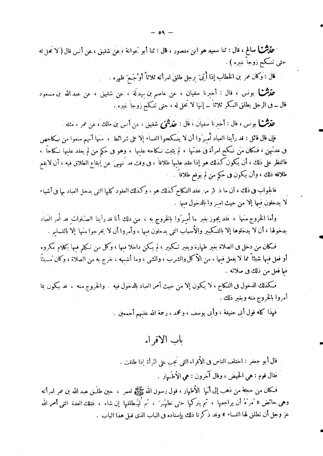 4490 - حَدَّثَنَا يُونُسُ , قَالَ: أَخْبَرَنَا سُفْيَانُ , قَالَ: حَدَّثَنِي شَقِيقٌ , عَنْ أَنَسِ بْنِ مَالِكٍ , عَنْ عُمَرَ , مِثْلَهُ. فَإِنْ قَالَ قَائِلٌ: قَدْ رَأَيْنَا الْعِبَادَ أُمِرُوا أَنْ لَا يَنْكِحُوا النِّسَاءَ إِلَّا عَلَى شَرَائِطَ , مِنْهَا أَنَّهُمْ مُنِعُوا مِنْ نِكَاحِهِنَّ فِي عِدَّتِهِنَّ , فَكَانَ مَنْ نَكَحَ امْرَأَةً فِي عِدَّتِهَا , لَمْ يَثْبُتْ نِكَاحُهُ عَلَيْهَا , وَهُوَ فِي حُكْمِ مَنْ لَمْ يَعْقِدْ عَلَيْهَا نِكَاحًا , فَالنَّظَرُ عَلَى ذَلِكَ , أَنْ يَكُونَ كَذَلِكَ هُوَ إِذَا عَقَدَ عَلَيْهَا طَلَاقًا , فِي وَقْتٍ قَدْ نُهِيَ عَنْ إِيقَاعِ الطَّلَاقِ فِيهِ , أَنْ لَا يَقَعَ طَلَاقُهُ ذَلِكَ , وَأَنْ يَكُونَ فِي حُكْمِ مَنْ لَمْ يُوقِعْ طَلَاقًا. فَالْجَوَابُ فِي ذَلِكَ: أَنَّ مَا ذَكَرَ مِنْ عَقْدِ النِّكَاحِ كَذَلِكَ هُوَ , وَكَذَلِكَ الْعُقُودُ كُلُّهَا الَّتِي يَدْخُلُ الْعِبَادُ بِهَا فِي أَشْيَاءَ لَا يَدْخُلُونَ فِيهَا إِلَّا مِنْ حَيْثُ أُمِرُوا بِالدُّخُولِ فِيهَا. وَأَمَّا الْخُرُوجُ مِنْهَا , فَقَدْ يَجُوزُ بِغَيْرِ مَا أُمِرُوا بِالْخُرُوجِ بِهِ , مِنْ ذَلِكَ أَنَّا قَدْ رَأَيْنَا الصَّلَوَاتِ قَدْ أُمِرَ الْعِبَادُ بِدُخُولِهَا , أَنْ لَا يَدْخُلُوهَا إِلَّا بِالتَّكْبِيرِ وَالْأَسْبَابِ الَّتِي يَدْخُلُونَ فِيهَا , وَأُمِرُوا أَنْ لَا يَخْرُجُوا مِنْهَا إِلَّا بِالتَّسْلِيمِ. فَكَانَ مَنْ دَخَلَ فِي الصَّلَاةِ بِغَيْرِ طَهَارَةٍ وَبِغَيْرِ تَكْبِيرٍ , لَمْ يَكُنْ دَاخِلًا فِيهَا , وَكُلُّ مَنْ تَكَلَّمَ فِيهَا بِكَلَامٍ مَكْرُوهٍ أَوْ فَعَلَ فِيهَا شَيْئًا مِمَّا لَا يُفْعَلُ فِيهَا , مِنَ الْأَكْلِ وَالشُّرْبِ , وَالْمَشْيِ , وَمَا أَشْبَهَهُ , خَرَجَ بِهِ مِنَ الصَّلَاةِ , وَكَانَ مُسِيئًا فِيمَا فَعَلَ مِنْ ذَلِكَ فِي صَلَاتِهِ. فَكَذَلِكَ الدُّخُولُ فِي النِّكَاحِ , لَا يَكُونُ إِلَّا مِنْ حَيْثُ أُمِرَ الْعِبَادُ بِالدُّخُولِ فِيهِ. وَالْخُرُوجُ مِنْهُ , قَدْ يَكُونُ بِمَا أُمِرُوا بِالْخُرُوجِ مِنْهُ وَبِغَيْرِ ذَلِكَ. فَهَذَا كُلُّهُ قَوْلُ أَبِي حَنِيفَةَ , وَأَبِي يُوسُفَ وَمُحَمَّدٍ , رَحْمَةُ اللهِ عَلَيْهِمْ أَجْمَعِينَ