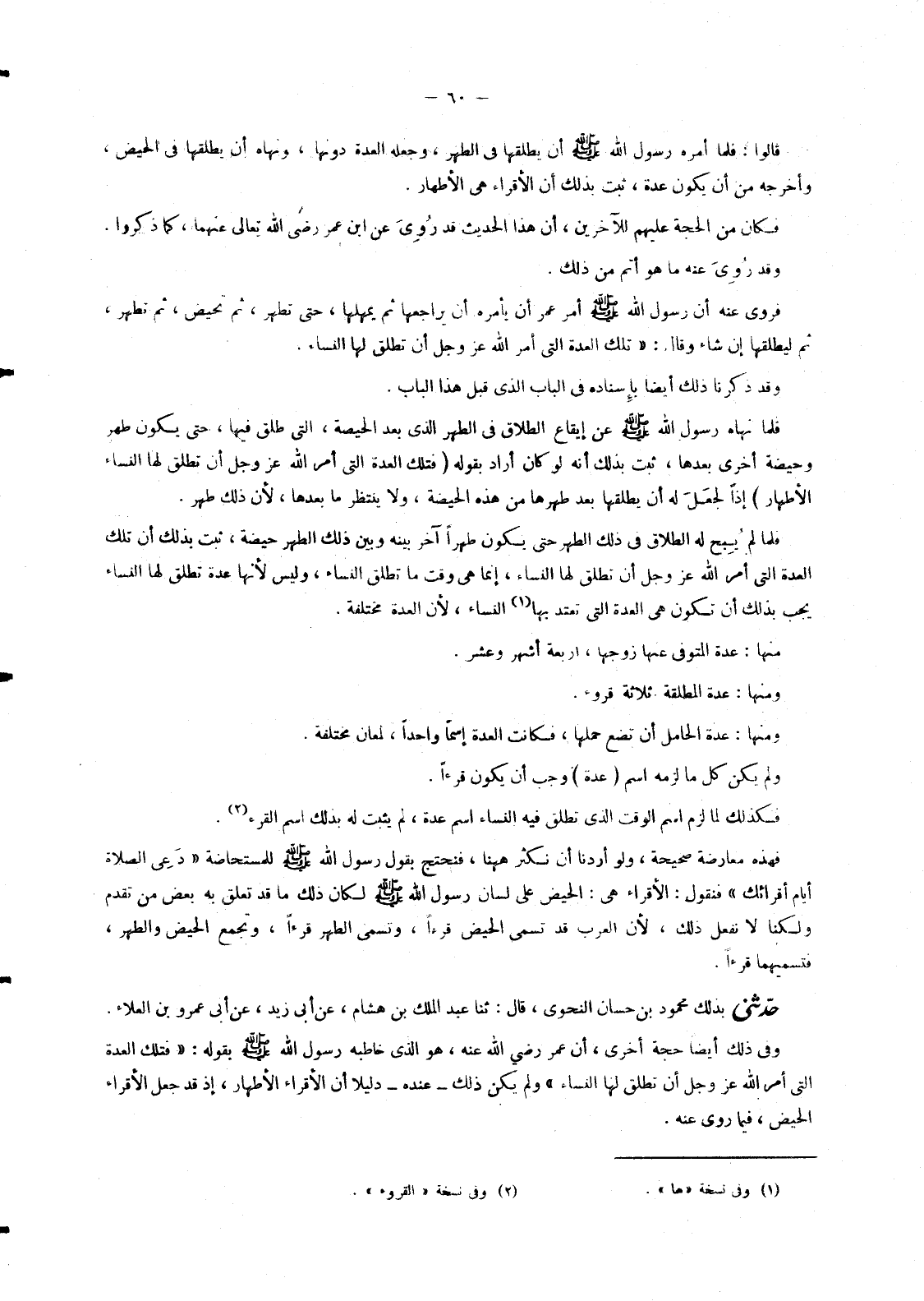 قَالُوا: فَلَمَّا أَمَرَهُ رَسُولُ اللهِ صَلَّى اللَّهُ عَلَيْهِ وَسَلَّمَ أَنْ يُطَلِّقَهَا فِي الطُّهْرِ , وَجَعَلَهُ الْعِدَّةَ دُونَهَا , وَنَهَاهُ أَنْ يُطَلِّقَهَا فِي الْحَيْضِ , وَأَخْرَجَهُ مِنْ أَنْ يَكُونَ عِدَّةً , ثَبَتَ بِذَلِكَ أَنَّ الْأَقْرَاءَ هِيَ الْأَطْهَارُ. فَكَانَ مِنَ الْحُجَّةِ عَلَيْهِمْ لِلْآخَرِينَ , أَنَّ هَذَا الْحَدِيثَ قَدْ رُوِيَ عَنِ ابْنِ عُمَرَ رَضِيَ اللهُ تَعَالَى عَنْهُمَا , كَمَا ذَكَرُوا. وَقَدْ رُوِيَ عَنْهُ مَا هُوَ أَتَمُّ مِنْ ذَلِكَ. فَرُوِيَ عَنْهُ أَنَّ رَسُولَ اللهِ صَلَّى اللَّهُ عَلَيْهِ وَسَلَّمَ " أَمَرَ عُمَرَ أَنْ يَأْمُرَهُ أَنْ يُرَاجِعَهَا ثُمَّ يُمْهِلَهَا , حَتَّى تَطْهُرَ , ثُمَّ تَحِيضَ , ثُمَّ تَطْهُرَ , ثُمَّ لِيُطَلِّقْهَا إِنْ شَاءَ , وَقَالَ: تِلْكَ الْعِدَّةُ الَّتِي أَمَرَ اللهُ عَزَّ وَجَلَّ أَنْ تَطْلُقَ لَهَا النِّسَاءُ «. وَقَدْ ذَكَرْنَا ذَلِكَ أَيْضًا بِإِسْنَادِهِ فِي الْبَابِ الَّذِي قَبْلَ هَذَا الْبَابِ. فَلَمَّا نَهَاهُ رَسُولُ اللهِ صَلَّى اللَّهُ عَلَيْهِ وَسَلَّمَ عَنْ إِيقَاعِ الطَّلَاقِ فِي الطُّهْرِ الَّذِي بَعْدَ الْحَيْصَةِ , الَّتِي طَلَّقَ فِيهَا , حَتَّى يَكُونَ طُهْرٌ وَحَيْضَةٌ أُخْرَى بَعْدَهَا , ثَبَتَ بِذَلِكَ أَنَّهُ لَوْ كَانَ أَرَادَ بِقَوْلِهِ» فَتِلْكَ الْعِدَّةُ الَّتِي أَمَرَ اللهُ عَزَّ وَجَلَّ أَنْ تَطْلُقَ لَهَا النِّسَاءُ الْأَطْهَارُ " إِذًا لَجَعَلَ لَهُ أَنْ يُطَلِّقَهَا بَعْدَ طُهْرِهَا مِنْ هَذِهِ الْحَيْضَةِ , وَلَا يَنْتَظِرُ مَا بَعْدَهَا , لِأَنَّ ذَلِكَ طُهْرٌ. فَلَمَّا لَمْ يُبِحْ لَهُ الطَّلَاقَ فِي ذَلِكَ الطُّهْرِ حَتَّى يَكُونَ طُهْرًا آخَرَ بَيْنَهُ وَبَيْنَ ذَلِكَ الطُّهْرِ حَيْضَةٌ , ثَبَتَ بِذَلِكَ أَنَّ تِلْكَ الْعِدَّةَ الَّتِي أَمَرَ اللهُ عَزَّ وَجَلَّ أَنْ تَطْلُقَ لَهَا النِّسَاءُ , إِنَّمَا هِيَ وَقْتُ مَا تَطْلُقُ النِّسَاءُ , وَلَيْسَ لِأَنَّهَا عِدَّةٌ تَطْلُقُ لَهَا النِّسَاءُ يَجِبُ بِذَلِكَ أَنْ تَكُونَ هِيَ الْعِدَّةُ الَّتِي تَعْتَدُّ بِهَا النِّسَاءُ , لِأَنَّ الْعِدَّةَ مُخْتَلِفَةٌ. مِنْهَا: عِدَّةُ الْمُتَوَفَّى عَنْهَا زَوْجُهَا , أَرْبَعَةُ أَشْهُرٍ وَعَشْرٌ. وَمِنْهَا: عِدَّةُ الْمُطَلَّقَةِ ثَلَاثَةُ قُرُوءٍ. وَمِنْهَا: عِدَّةُ الْحَامِلِ أَنْ تَضَعَ حَمْلَهَا , فَكَانَتِ الْعِدَّةُ اسْمًا وَاحِدًا , لِمَعَانٍ مُخْتَلِفَةٍ. وَلَمْ يَكُنْ كُلُّ مَا لَزِمَهُ اسْمُ عِدَّةٍ , وَجَبَ أَنْ يَكُونَ قُرْءًا. فَكَذَلِكَ لَمَّا لَزِمَ اسْمَ الْوَقْتِ الَّذِي تَطْلُقُ فِيهِ النِّسَاءُ اسْمُ عِدَّةٍ , لَمْ يَثْبُتْ لَهُ بِذَلِكَ اسْمُ الْقِرْءِ. فَهَذِهِ مُعَارَضَةٌ صَحِيحَةٌ , وَلَوْ أَرَدْنَا أَنْ نُكْثِرَ هَاهُنَا , فَنَحْتَجُّ بِقَوْلِ رَسُولِ اللهِ صَلَّى اللَّهُ عَلَيْهِ وَسَلَّمَ لِلْمُسْتَحَاضَةِ: «دَعِي الصَّلَاةَ أَيَّامَ أَقْرَائِكِ» , فَنَقُولُ: الْأَقْرَاءُ هِيَ: الْحَيْضُ عَلَى لِسَانِ رَسُولِ اللهِ صَلَّى اللَّهُ عَلَيْهِ وَسَلَّمَ لَكَانَ ذَلِكَ مَا قَدْ تَعَلَّقَ بِهِ بَعْضُ مَنْ تَقَدَّمَ وَلَكِنَّا لَا نَفْعَلُ ذَلِكَ , لِأَنَّ الْعَرَبَ قَدْ تُسَمِّي الْحَيْضَ قُرْءًا , وَتُسَمِّي الطُّهْرَ قُرْءًا , وَتَجْمَعُ الْحَيْضَ وَالطُّهْرَ , فَتُسَمِّيهِمَا قُرْءًا.