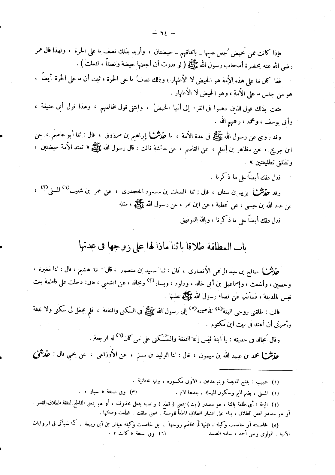 حَدَّثَنَا صَالِحُ بْنُ عَبْدِ الرَّحْمَنِ الْأَنْصَارِيُّ , قَالَ: ثنا سَعِيدُ بْنُ مَنْصُورٍ , قَالَ: ثنا هُشَيْمٌ , قَالَ: ثنا مُغِيرَةُ , وَحُصَيْنٌ , وَأَشْعَثُ , وَإِسْمَاعِيلُ بْنُ أَبِي خَالِدٍ , وَدَاوُدُ , وَيَسَارٌ , وَمُجَالِدٌ , عَنِ الشَّعْبِيِّ , قَالَ: " دَخَلْتُ عَلَى فَاطِمَةَ بِنْتِ قَيْسٍ بِالْمَدِينَةِ , فَسَأَلْتُهَا عَنْ قَضَاءِ رَسُولِ اللهِ صَلَّى اللَّهُ عَلَيْهِ وَسَلَّمَ عَلَيْهَا. قَالَتْ: «طَلَّقَنِي زَوْجِي أَلْبَتَّةَ , فَخَاصَمْتُهُ إِلَى رَسُولِ اللهِ صَلَّى اللَّهُ عَلَيْهِ وَسَلَّمَ فِي السُّكْنَى وَالنَّفَقَةِ , فَلَمْ يَجْعَلْ لِي سُكْنَى وَلَا نَفَقَةً , وَأَمَرَنِي أَنْ أَعْتَدَّ فِي بَيْتِ ابْنِ مَكْتُومٍ» . وَقَالَ مُجَالِدٌ فِي حَدِيثِهِ: «يَا ابْنَةَ قَيْسٍ , إِنَّمَا §النَّفَقَةُ وَالسُّكْنَى عَلَى مَنْ كَانَ لَهُ الرَّجْعَةُ»