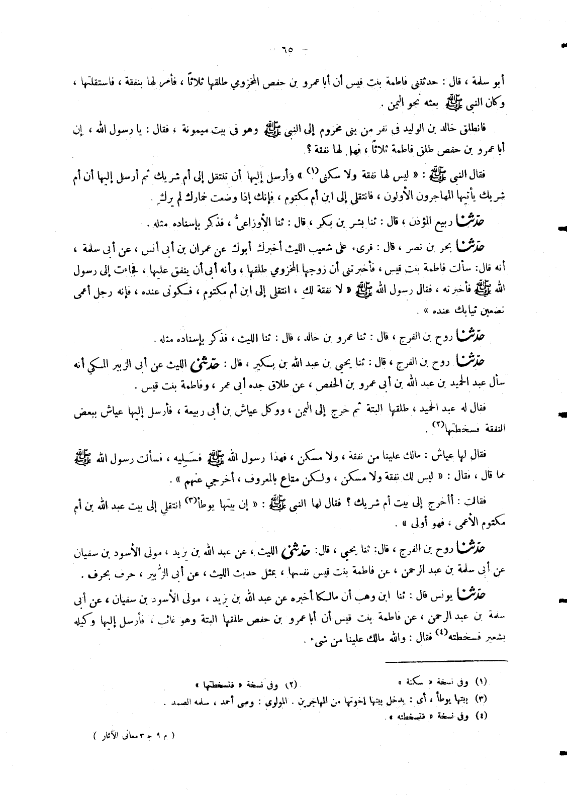 4510 - حَدَّثَنَا رَوْحُ بْنُ الْفَرَجِ , قَالَ: ثنا يَحْيَى بْنُ عَبْدِ اللهِ بْنِ بُكَيْرٍ , قَالَ: حَدَّثَنِي اللَّيْثُ , عَنْ أَبِي الزُّبَيْرِ الْمَكِّيِّ , أَنَّهُ " سَأَلَ عَبْدَ الْحَمِيدِ بْنَ عَبْدِ اللهِ بْنِ أَبِي عَمْرِو بْنِ الْحَفْصِ , عَنْ طَلَاقِ جَدِّهِ أَبِي عُمَرَ وَفَاطِمَةَ بِنْتِ قَيْسٍ. فَقَالَ لَهُ عَبْدُ الْحَمِيدِ: " طَلَّقَهَا أَلْبَتَّةَ , ثُمَّ خَرَجَ إِلَى الْيَمَنِ , وَوَكَّلَ عَيَّاشَ بْنَ أَبِي رَبِيعَةَ , فَأَرْسَلَ إِلَيْهَا عَيَّاشٌ بِبَعْضِ النَّفَقَةِ , فَسَخِطَتْهَا. فَقَالَ لَهَا عَيَّاشٌ: مَالَكِ عَلَيْنَا مِنْ نَفَقَةٍ , وَلَا مَسْكَنٍ , فَهَذَا رَسُولُ اللهِ صَلَّى اللَّهُ عَلَيْهِ وَسَلَّمَ فَسَلِيهِ , فَسَأَلَتْ رَسُولَ اللهِ صَلَّى اللَّهُ عَلَيْهِ وَسَلَّمَ عَمَّا قَالَ , فَقَالَ: «§لَيْسَ لَكِ نَفَقَةٌ وَلَا مَسْكَنٌ , وَلَكِنْ مَتَاعٌ بِالْمَعْرُوفِ , اخْرُجِي عَنْهُمْ» . فَقَالَتْ: أَأَخْرُجُ إِلَى بَيْتِ أُمِّ شَرِيكٍ؟ فَقَالَ لَهَا النَّبِيُّ صَلَّى اللَّهُ عَلَيْهِ وَسَلَّمَ: «إِنَّ بَيْتَهَا يُوطَأُ , انْتَقِلِي إِلَى بَيْتِ عَبْدِ اللهِ بْنِ أُمِّ مَكْتُومٍ الْأَعْمَى , فَهُوَ أَوْلَى» .