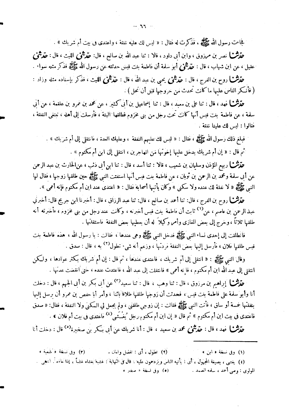 4518 - حَدَّثَنَا إِبْرَاهِيمُ بْنُ مَرْزُوقٍ , قَالَ: ثنا وَهْبٌ , قَالَ: ثنا سَعِيدٌ , عَنْ أَبِي بَكْرِ بْنِ أَبِي الْجَهْمِ , قَالَ: دَخَلْتُ أَنَا وَأَبُو سَلَمَةَ عَلَى فَاطِمَةَ بِنْتِ قَيْسٍ , فَحَدَّثَتْ: أَنَّ زَوْجَهَا طَلَّقَهَا طَلَاقًا بَائِنًا , وَأَمَرَ أَبَا حَفْصِ بْنَ عَمْرٍو أَنْ يُرْسِلَ إِلَيْهَا بِنَفَقَتِهَا خَمْسَةَ أَوْسَاقٍ , فَأَتَتِ النَّبِيَّ صَلَّى اللَّهُ عَلَيْهِ وَسَلَّمَ فَقَالَتْ: إِنَّ زَوْجِي طَلَّقَنِي , وَلَمْ يَجْعَلْ لِيَ السُّكْنَى وَلَا النَّفَقَةَ , فَقَالَ: «§صَدَقَ , فَاعْتَدِّي فِي بَيْتِ ابْنِ أُمِّ مَكْتُومٍ» ثُمَّ قَالَ: «إِنَّ ابْنَ أُمِّ مَكْتُومٍ رَجُلٌ يُغْشَى فَاعْتَدِّي فِي بَيْتِ أُمِّ فُلَانٍ»