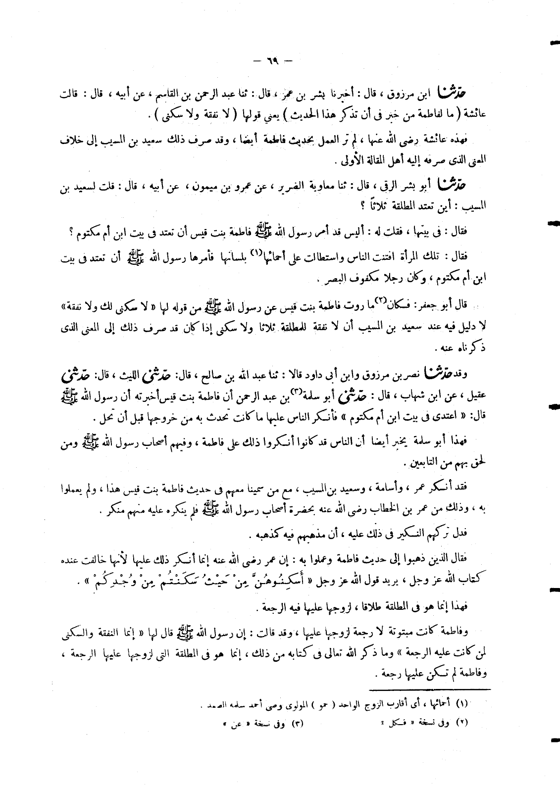 4531 - حَدَّثَنَا نَصْرُ بْنُ مَرْزُوقٍ , وَابْنُ أَبِي دَاوُدَ قَالَا: ثنا عَبْدُ اللهِ بْنُ صَالِحٍ , قَالَ: حَدَّثَنِي اللَّيْثُ , قَالَ: حَدَّثَنِي عُقَيْلٌ , عَنِ ابْنِ شِهَابٍ , قَالَ: حَدَّثَنِي أَبُو سَلَمَةَ بْنُ عَبْدِ الرَّحْمَنِ , أَنَّ فَاطِمَةَ بِنْتَ قَيْسٍ أَخْبَرَتْهُ , أَنَّ رَسُولَ اللهِ صَلَّى اللَّهُ عَلَيْهِ وَسَلَّمَ قَالَ: «§اعْتَدِّي فِي بَيْتِ ابْنِ أُمِّ مَكْتُومٍ» فَأَنْكَرَ النَّاسُ عَلَيْهَا مَا كَانَتْ تُحَدِّثُ بِهِ مِنْ خُرُوجِهَا قَبْلَ أَنْ تَحِلَّ ". فَهَذَا أَبُو سَلَمَةَ يُخْبِرُ أَيْضًا أَنَّ النَّاسَ قَدْ كَانُوا أَنْكَرُوا ذَلِكَ عَلَى فَاطِمَةَ , وَفِيهِمْ أَصْحَابُ رَسُولِ اللهِ صَلَّى اللَّهُ عَلَيْهِ وَسَلَّمَ وَمَنْ لَحِقَ بِهِمْ مِنَ التَّابِعِينَ. فَقَدْ أَنْكَرَ عُمَرُ , وَأُسَامَةُ , وَسَعِيدُ بْنُ الْمُسَيِّبِ , مَعَ مَنْ سَمَّيْنَا مَعَهُمْ فِي حَدِيثِ فَاطِمَةَ بِنْتِ قَيْسٍ هَذَا , وَلَمْ يَعْمَلُوا بِهِ , وَذَلِكَ مِنْ عُمَرَ بْنِ الْخَطَّابِ رَضِيَ اللهُ عَنْهُ بِحَضْرَةِ أَصْحَابِ رَسُولِ اللهِ صَلَّى اللَّهُ عَلَيْهِ وَسَلَّمَ فَلَمْ يُنْكِرْهُ عَلَيْهِ مِنْهُمْ مُنْكِرٌ. فَدَلَّ تَرْكُهُمُ النَّكِيرَ فِي ذَلِكَ عَلَيْهِ , أَنَّ مَذْهَبَهُمْ فِيهِ كَمَذْهَبِهِ. فَقَالَ الَّذِينَ ذَهَبُوا إِلَى حَدِيثِ فَاطِمَةَ وَعَمِلُوا بِهِ: إِنَّ عُمَرَ رَضِيَ اللهُ عَنْهُ إِنَّمَا أَنْكَرَ ذَلِكَ عَلَيْهَا لِأَنَّهَا خَالَفَتْ عِنْدَهُ كِتَابَ اللهِ عَزَّ وَجَلَّ , يُرِيدُ قَوْلَ اللهِ عَزَّ وَجَلَّ «أَسْكِنُوهُنَّ مِنْ حَيْثُ سَكَنْتُمْ مِنْ وُجْدِكُمْ» . فَهَذَا إِنَّمَا هُوَ فِي الْمُطَلَّقَةِ طَلَاقًا , لِزَوْجِهَا عَلَيْهَا فِيهِ الرَّجْعَةُ. وَفَاطِمَةُ كَانَتْ مَبْتُوتَةً لَا رَجْعَةَ لِزَوْجِهَا عَلَيْهَا , وَقَدْ قَالَتْ: إِنَّ رَسُولَ اللهِ صَلَّى اللَّهُ عَلَيْهِ وَسَلَّمَ قَالَ لَهَا «إِنَّمَا النَّفَقَةُ وَالسُّكْنَى لِمَنْ كَانَتْ عَلَيْهِ الرَّجْعَةُ» وَمَا ذَكَرَ اللهُ تَعَالَى فِي كِتَابِهِ مِنْ ذَلِكَ , إِنَّمَا هُوَ فِي الْمُطَلَّقَةِ الَّتِي لِزَوْجِهَا عَلَيْهَا الرَّجْعَةُ , وَفَاطِمَةُ لَمْ تَكُنْ عَلَيْهَا رَجْعَةٌ. -[70]- فَمَا رَوَتْ مِنْ ذَلِكَ فَلَا يَدْفَعُهُ كِتَابُ اللهِ , وَلَا سُنَّةُ نَبِيِّهِ صَلَّى اللَّهُ عَلَيْهِ وَسَلَّمَ. وَقَدْ تَابَعَهَا غَيْرُهَا عَلَى ذَلِكَ , مِنْهُمْ عَبْدُ اللهِ بْنُ عَبَّاسٍ. وَالْحَسَنُ