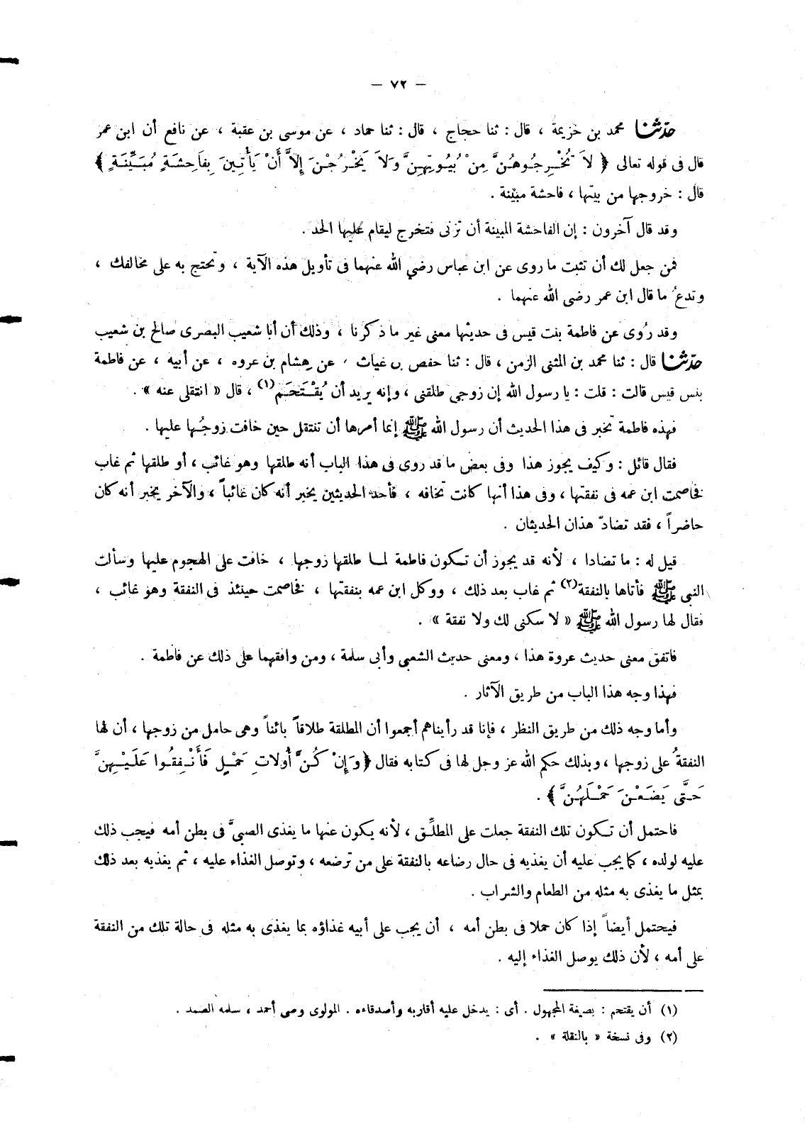 4535 - حَدَّثَنَا مُحَمَّدُ بْنُ خُزَيْمَةَ , قَالَ: ثنا حَجَّاجٌ , قَالَ: ثنا حَمَّادٌ , عَنْ مُوسَى بْنِ عُقْبَةَ , عَنْ نَافِعٍ , أَنَّ ابْنَ عُمَرَ قَالَ فِي قَوْلِهِ تَعَالَى: {§لَا تُخْرِجُوهُنَّ مِنْ بُيُوتِهِنَّ وَلَا يَخْرُجْنَ إِلَّا أَنْ يَأْتِيَنَ بِفَاحِشَةٍ مُبَيِّنَةٍ} [الطلاق: 1] قَالَ: خُرُوجُهَا مِنْ بَيْتِهَا , فَاحِشَةٌ مُبَيِّنَةٌ. وَقَدْ قَالَ آخَرُونَ: إِنَّ الْفَاحِشَةَ الْمُبَيِّنَةَ أَنْ تَزْنِيَ فَتَخْرُجَ لِيُقَامَ عَلَيْهَا الْحَدُّ. فَمَنْ جَعَلَ لَكَ أَنْ تُثْبِتَ مَا رُوِيَ عَنِ ابْنِ عَبَّاسٍ رَضِيَ اللهُ عَنْهُمَا فِي تَأْوِيلِ هَذِهِ الْآيَةِ , وَتَحْتَجَّ بِهِ عَلَى مُخَالِفِكَ , وَتَدَعَ مَا قَالَ ابْنُ عُمَرَ رَضِيَ اللهُ عَنْهُمَا. وَقَدْ رُوِيَ عَنْ فَاطِمَةَ بِنْتِ قَيْسٍ فِي حَدِيثِهَا مَعْنًى غَيْرَ مَا ذَكَرْنَا , وَذَلِكَ أَنَّ